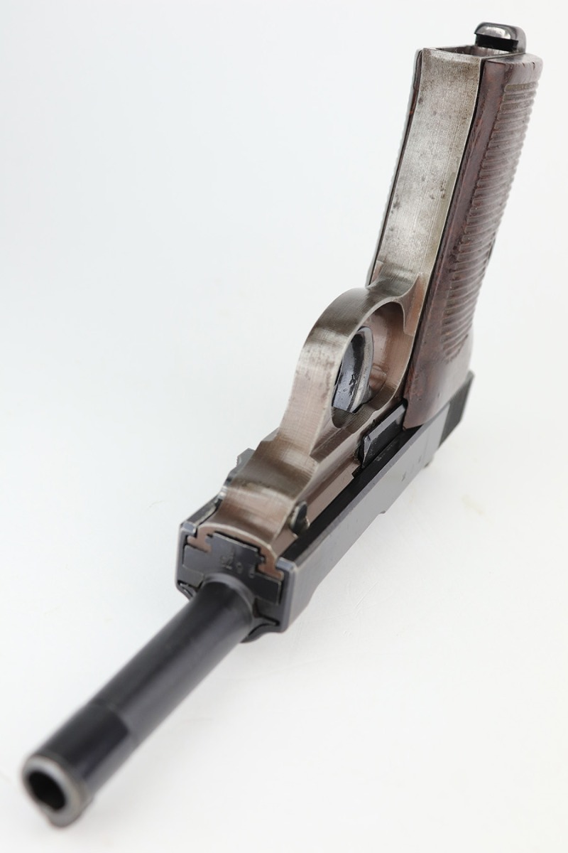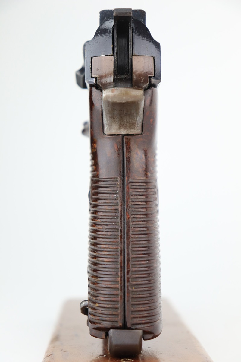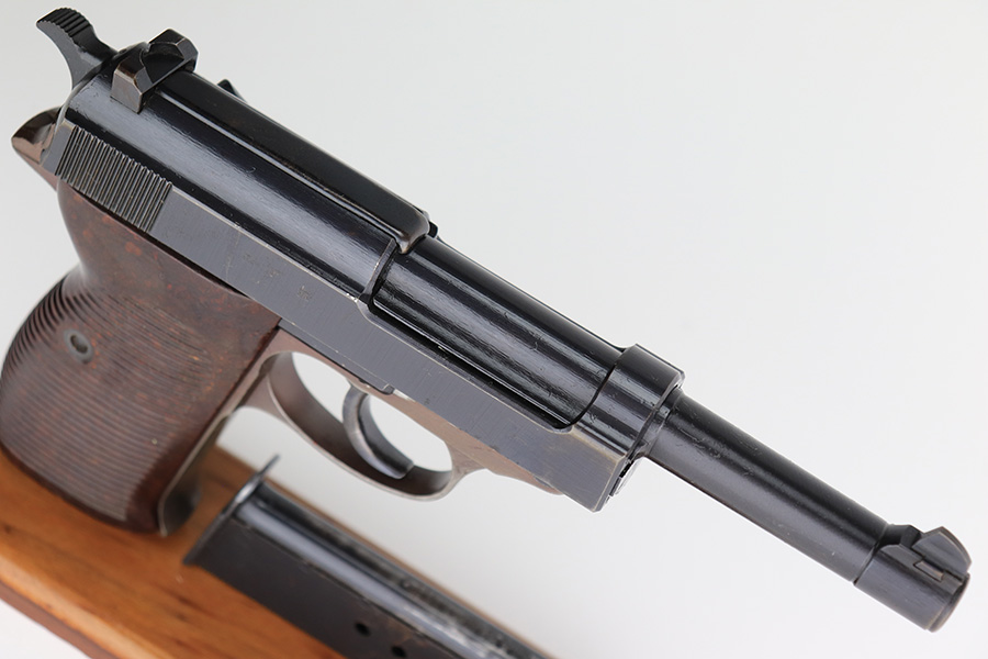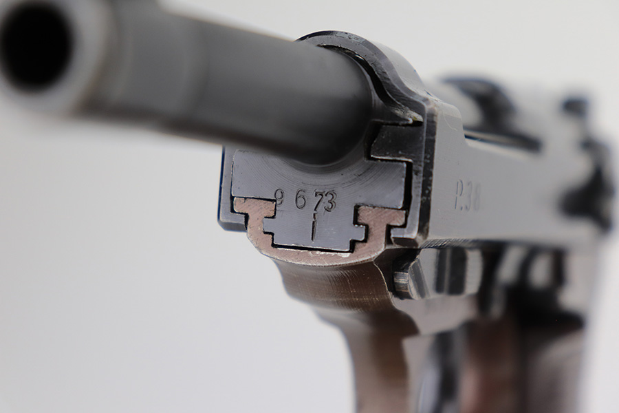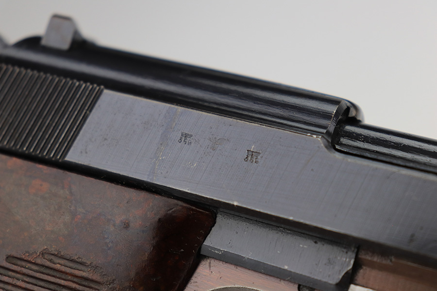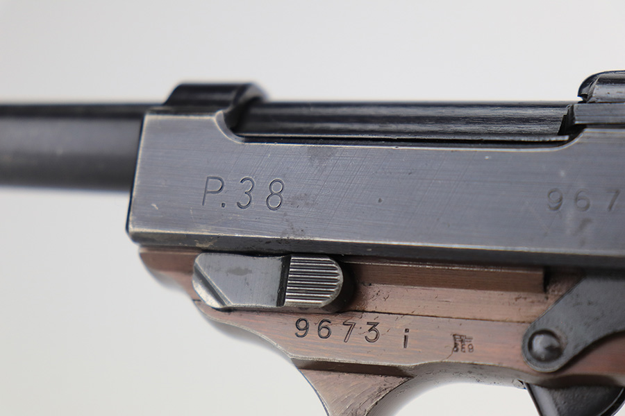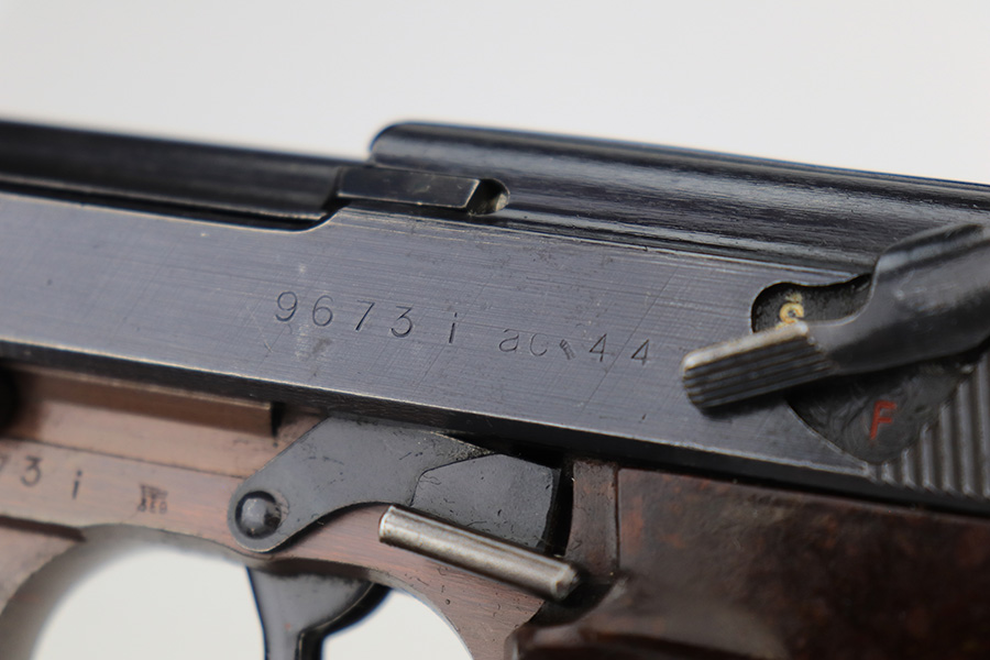 3/3/23 – This is a Walther ac 44, with rare test eagle on the trigger guard. These stick-wing eagle proofs are similar to the test proofs found on early Mauser HSc’s, though it is not known exactly why a small selection of P.38’s received these markings. This pistol has about 95% original finish, with a very nice slide, plum colored frame, and a thinner gray front strap. Beautiful set of reddish grips. Very nice bore, with no pitting or frosting.