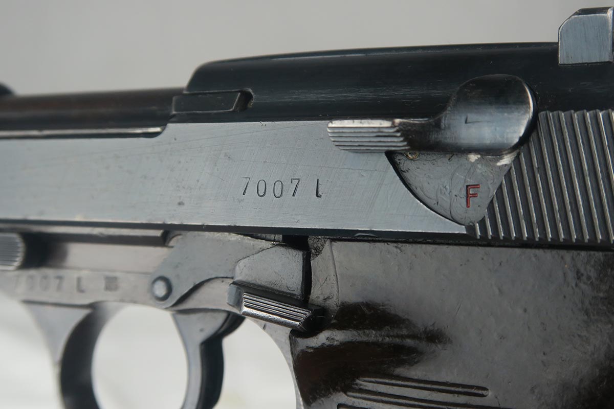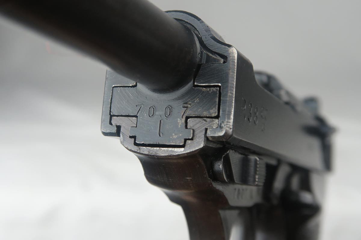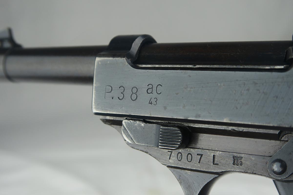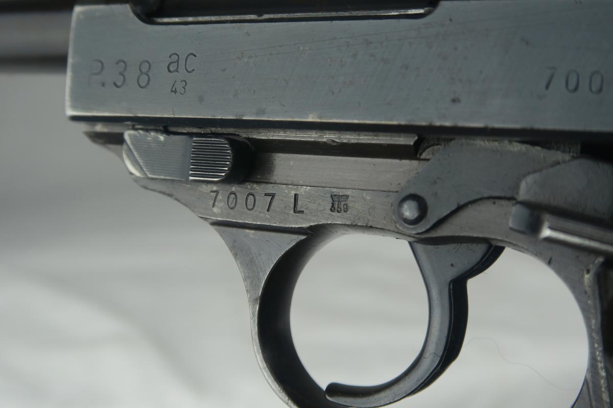 8/15/17 – This is an original WW2 production Walther P.38 from 1943. It is a somewhat rare variation with small 43 on the slide, a feature only found in the L block.  The parts and finish are all original and fully functional. The finish on this pistol is about 95% overall. The most noticeable wear is on the barrel, where you can see some discoloration and overall thinning of the blued finish. The slide has normal edge wear and additional spots/specs of discoloration on both sides. The front strap also has some thinning of the original finish. The bore is a solid 7/10, meaning there are strong lands and grooves, but there are signs of use and surface wear throughout the bore.