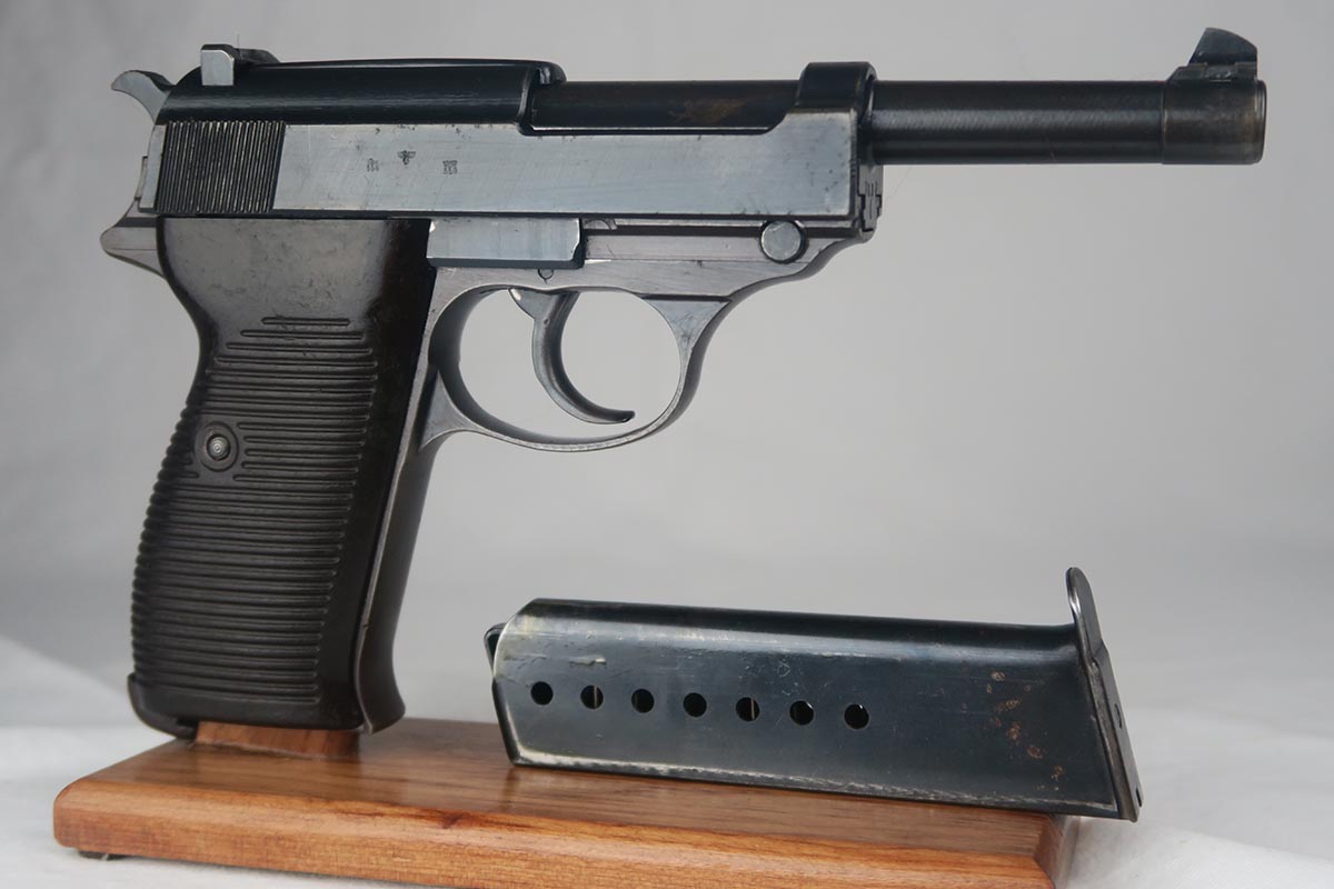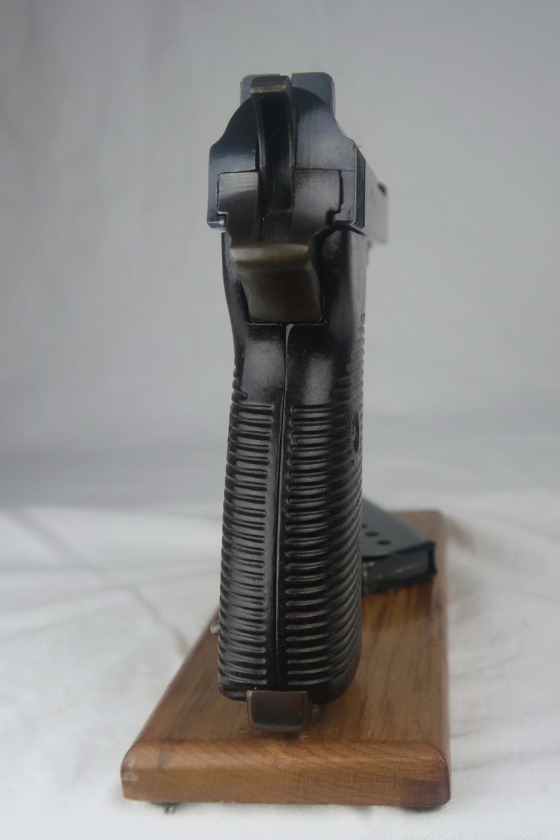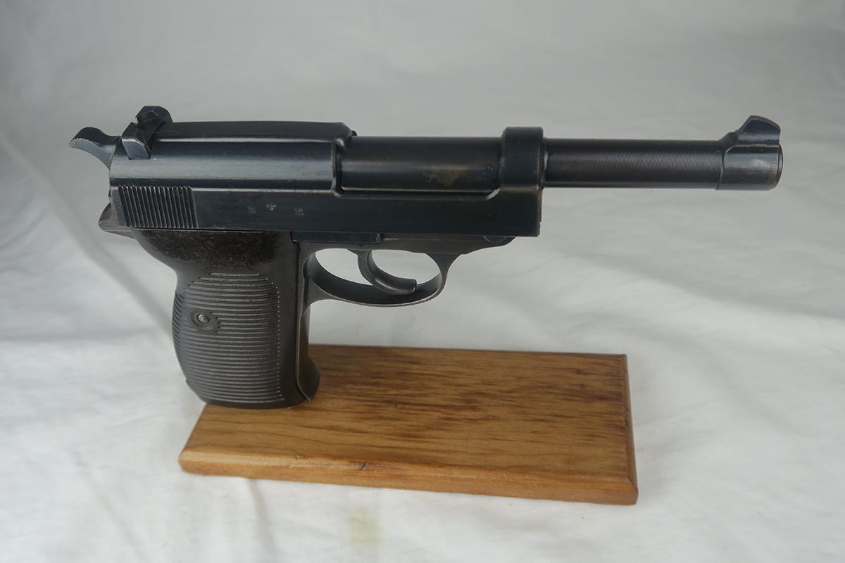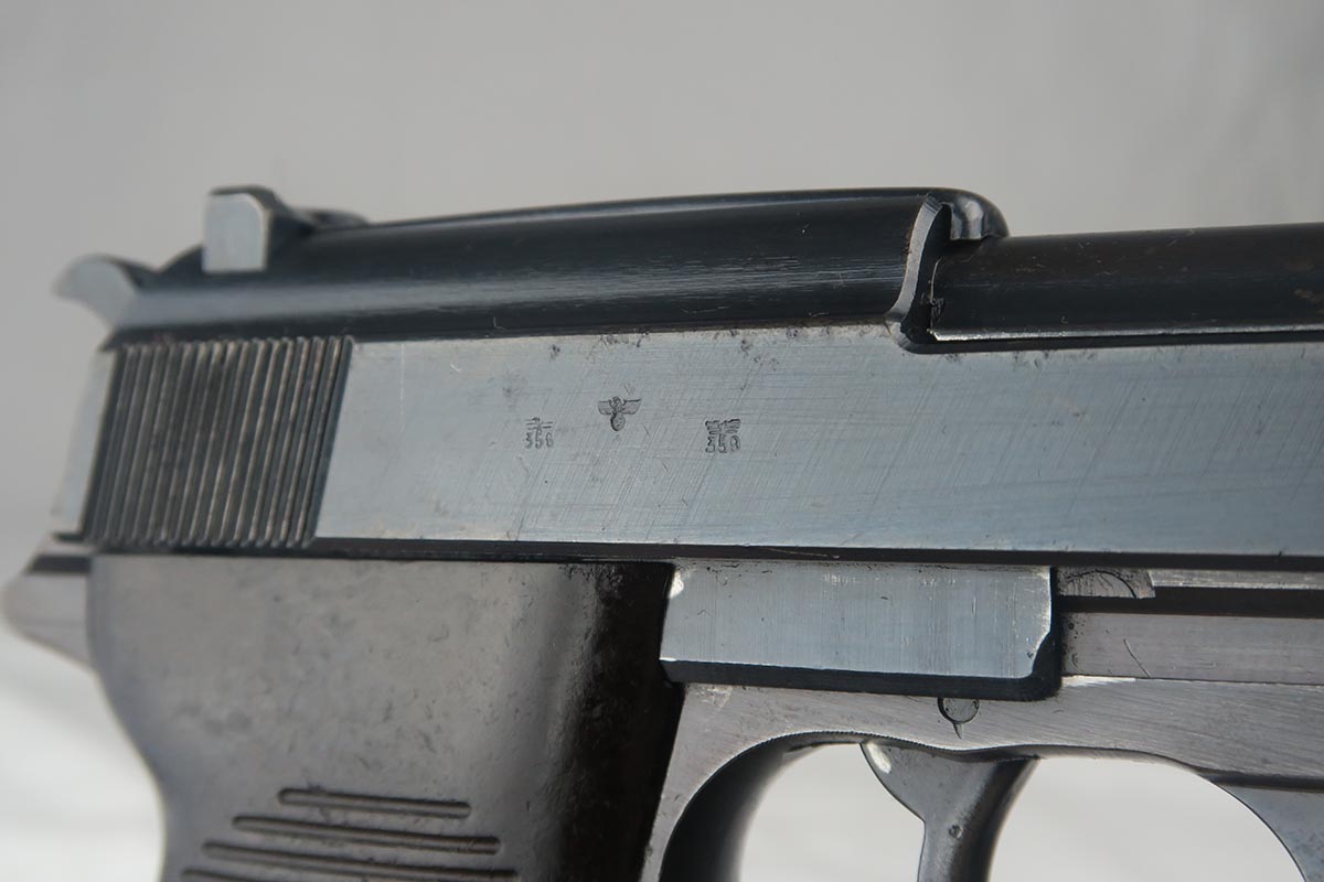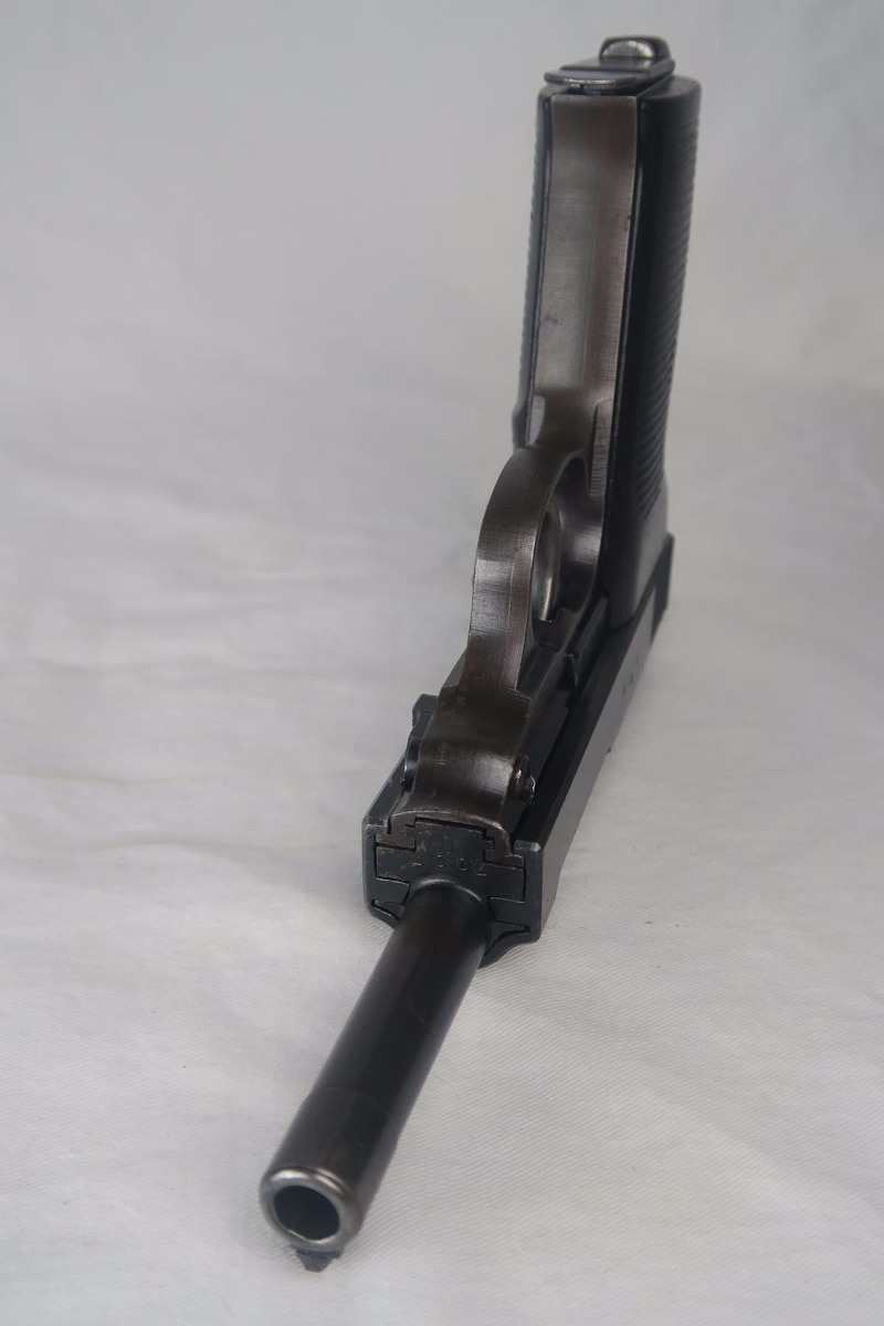 8/15/17 – This is an original WW2 production Walther P.38 from 1943. It is a somewhat rare variation with small 43 on the slide, a feature only found in the L block.  The parts and finish are all original and fully functional. The finish on this pistol is about 95% overall. The most noticeable wear is on the barrel, where you can see some discoloration and overall thinning of the blued finish. The slide has normal edge wear and additional spots/specs of discoloration on both sides. The front strap also has some thinning of the original finish. The bore is a solid 7/10, meaning there are strong lands and grooves, but there are signs of use and surface wear throughout the bore.