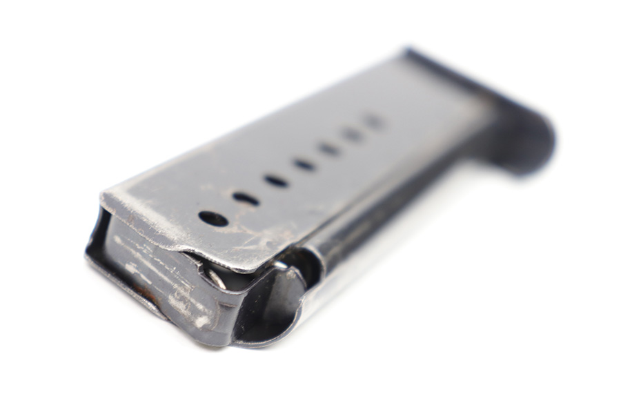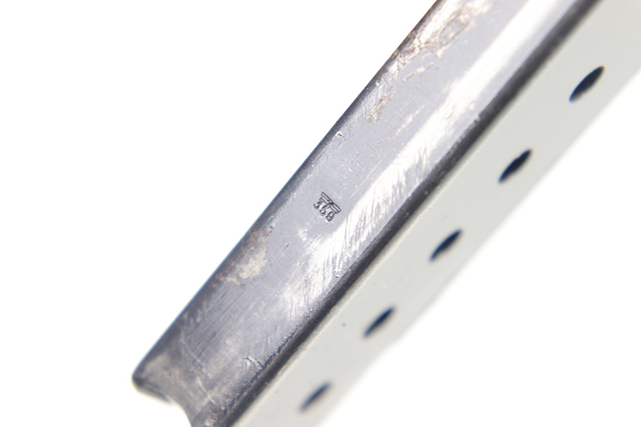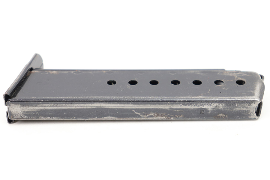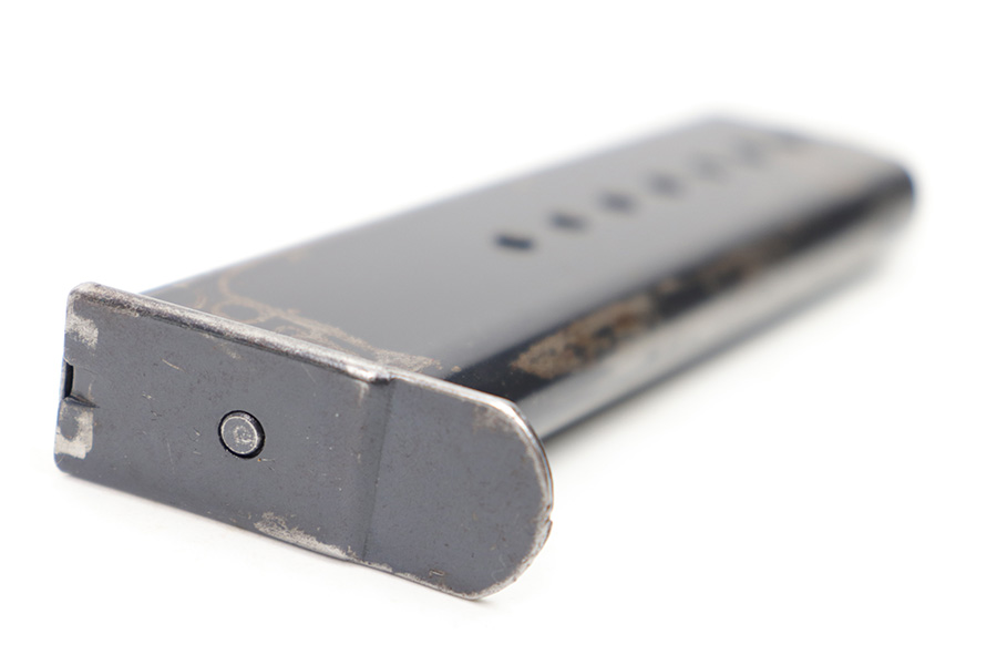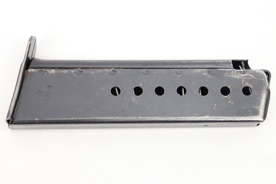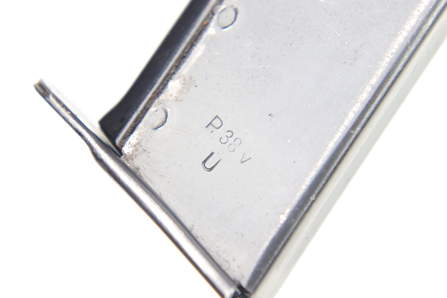 1/30/23 – This is an original late WW2 production Walther P.38 magazine. The magazine is stamped on the tube “P.38v U”, which is a late-war production feature. The spine of the magazine is stamped with an eagle/359 military proof stamp. The spring is strong and fully functional with no issues. There’s mild finish loss on the magazine, but no rust or pitting.