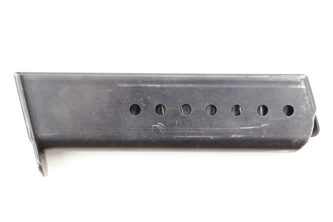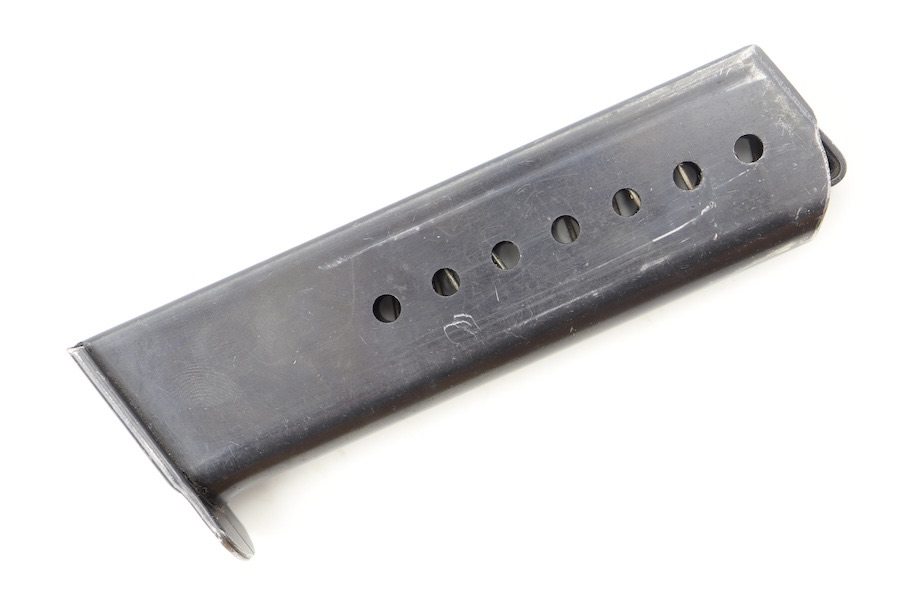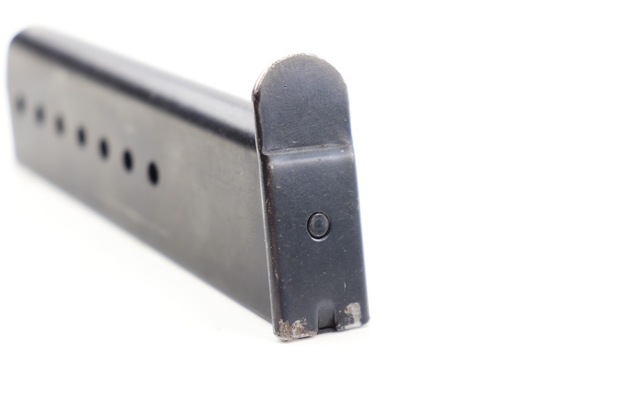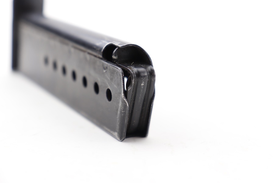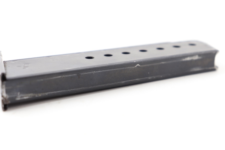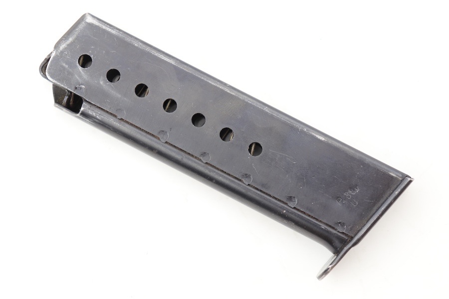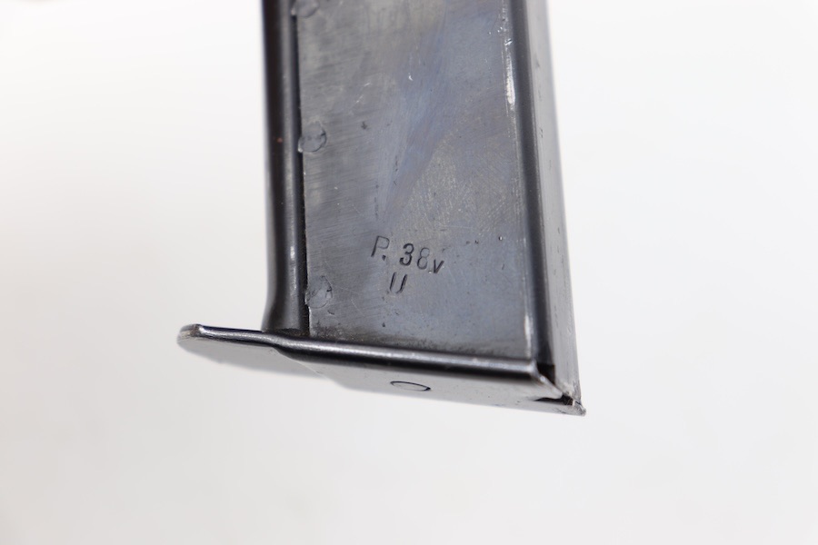 1/31/24 – This is a good condition Walther P.38v magazine. This magazine retains about 90+% of its original bluing finish, showing light wear on the spine and front spine. On the bottom left side of the tube is stamped P.38v U . The “U” means unhardened metal, and is a late-war feature. The spine has no markings or stamps. Mag is fully functional.