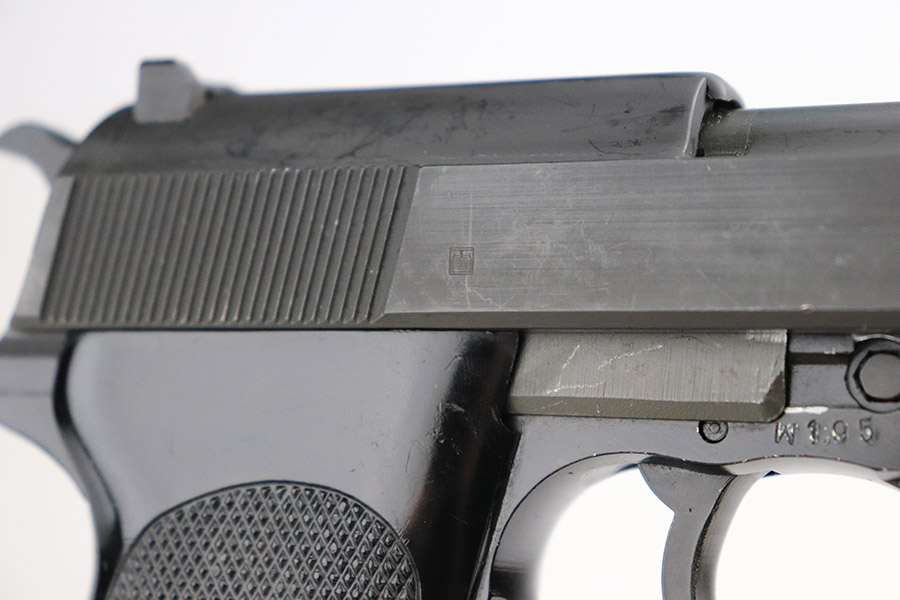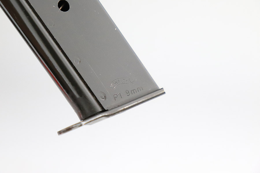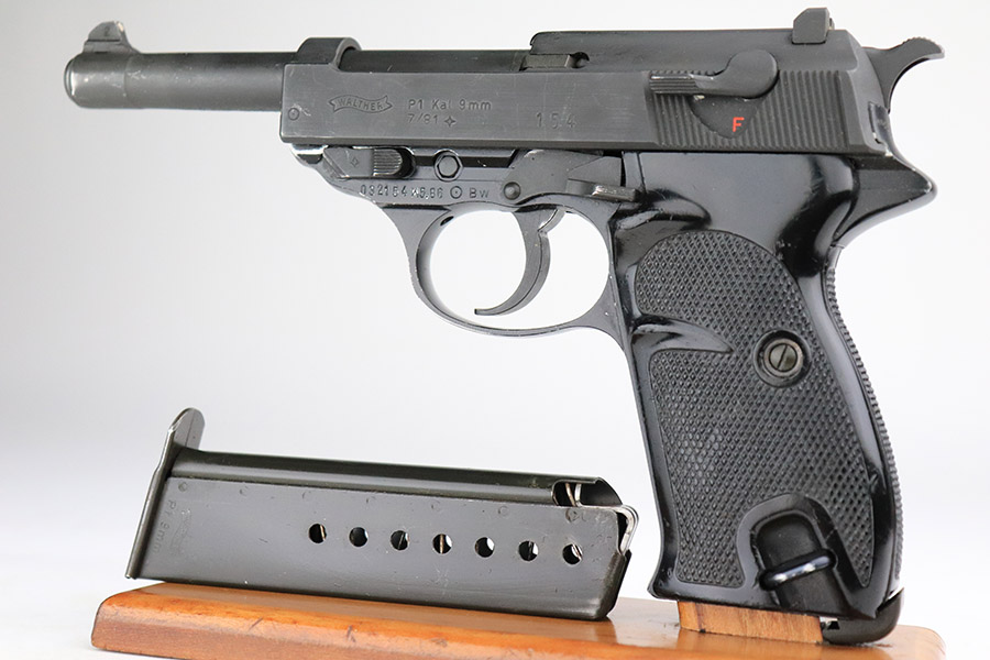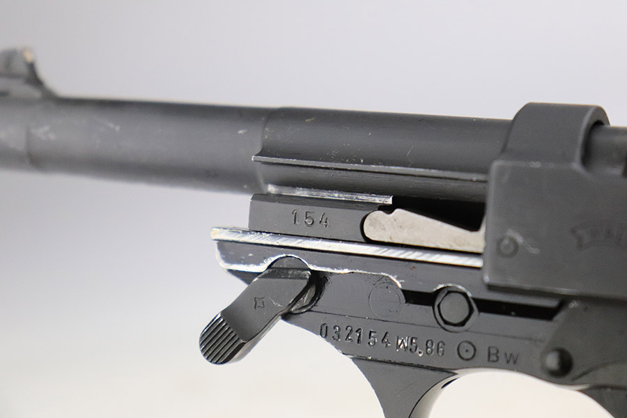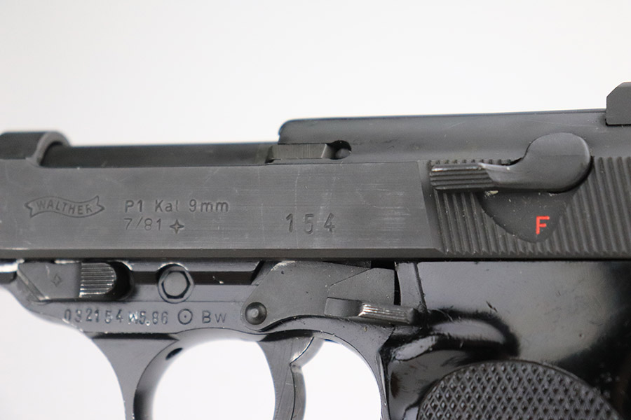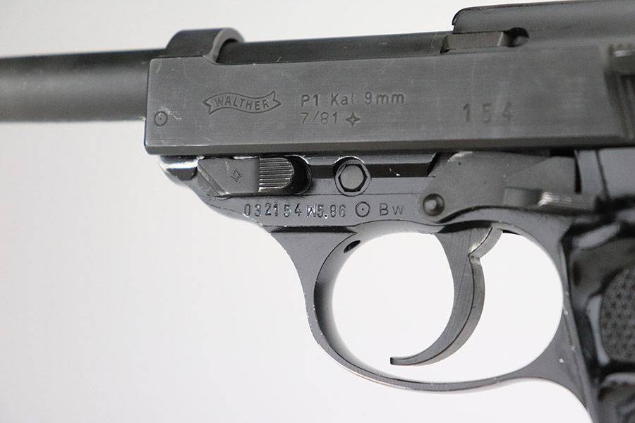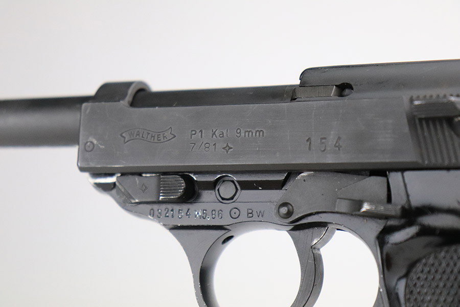 11/8/22 – This is an excellent example of a Walther P1 manufactured in July of 1981. It is all matching and has a “BW” marking on the left side of the frame, indicating this was issued to the Bundeswehr or West German military. There are also “W5.86” and “W1.95” markings on both sides of the frame – we assume these to be unit markings. Import mark on the underside of the barrel. The gun has retained about 97% of its original finish. There is very little actual finish loss, but there are some very light scuffs on both sides of the slide and some tiny scratches along the left side of the barrel. Minor wear around the very front edge of the frame. Comes with very nice black plastic grips (tiny scratches here and there) and a proper P1 magazine. Excellent bore with strong rifling. De-cocker is functional.