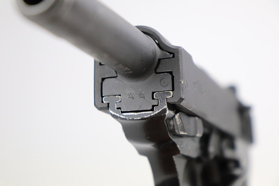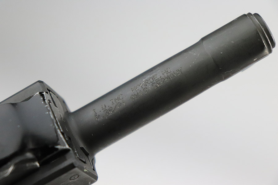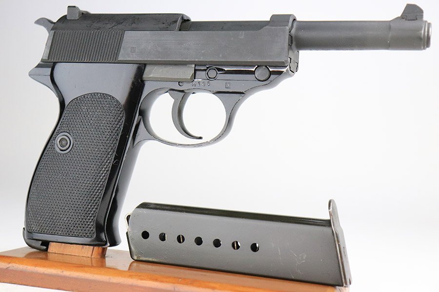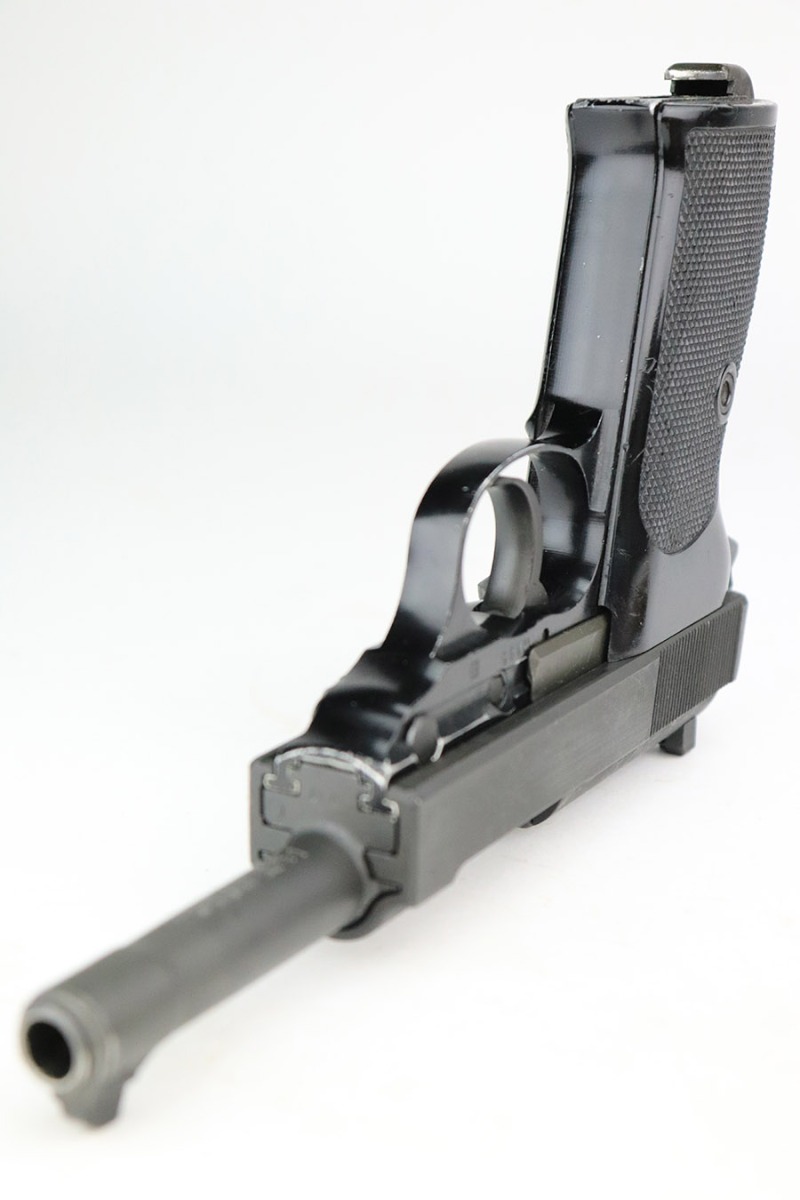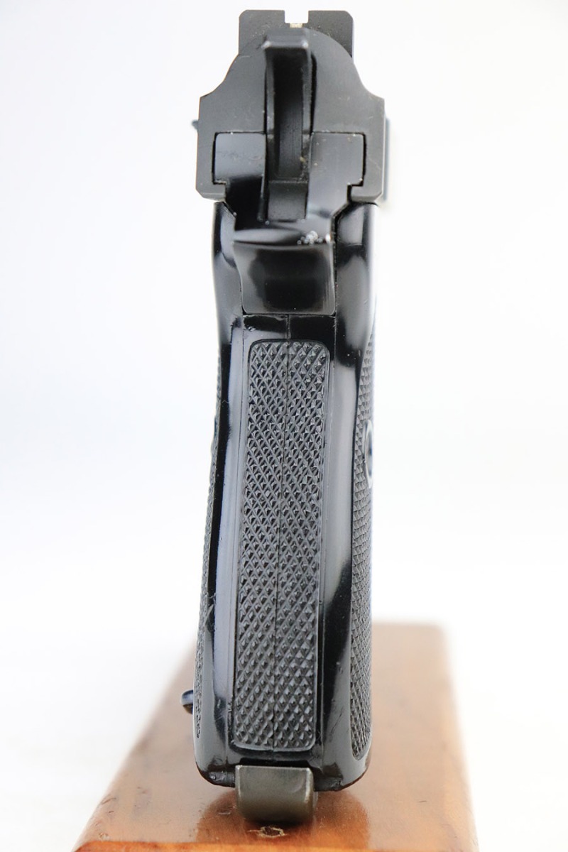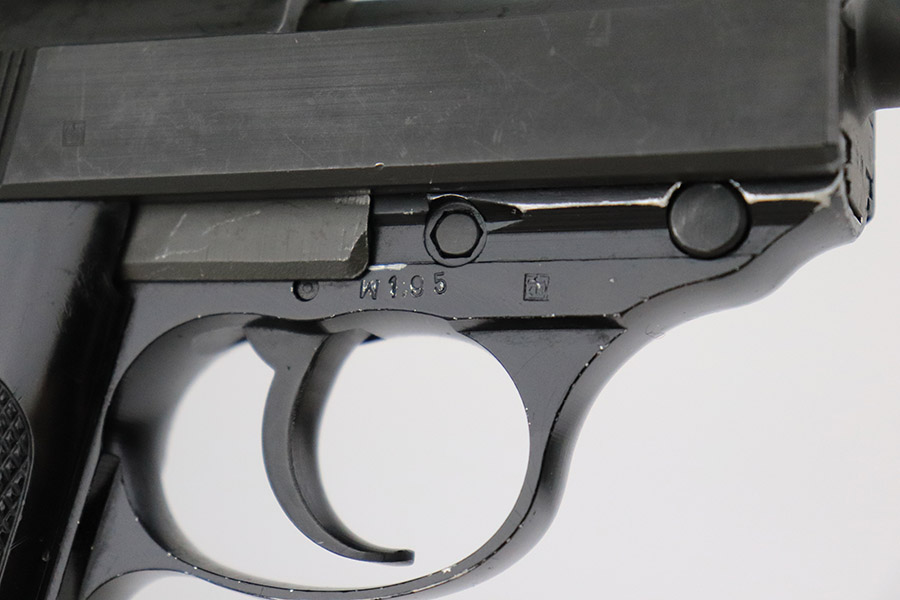 11/8/22 – This is an excellent example of a Walther P1 manufactured in July of 1981. It is all matching and has a “BW” marking on the left side of the frame, indicating this was issued to the Bundeswehr or West German military. There are also “W5.86” and “W1.95” markings on both sides of the frame – we assume these to be unit markings. Import mark on the underside of the barrel. The gun has retained about 97% of its original finish. There is very little actual finish loss, but there are some very light scuffs on both sides of the slide and some tiny scratches along the left side of the barrel. Minor wear around the very front edge of the frame. Comes with very nice black plastic grips (tiny scratches here and there) and a proper P1 magazine. Excellent bore with strong rifling. De-cocker is functional.