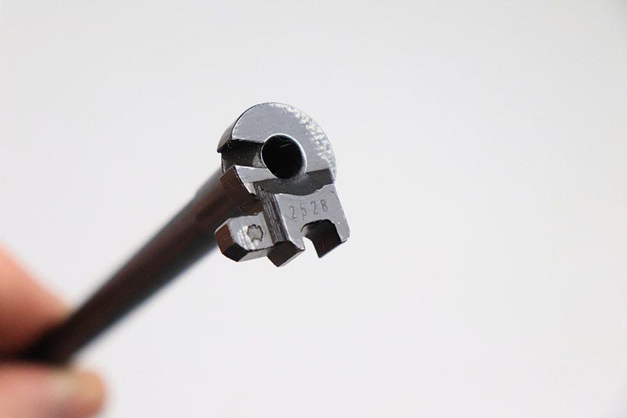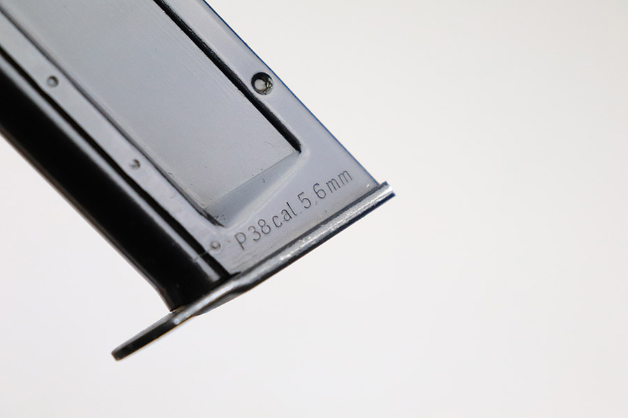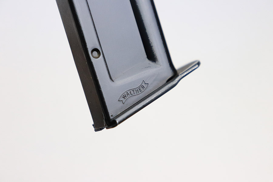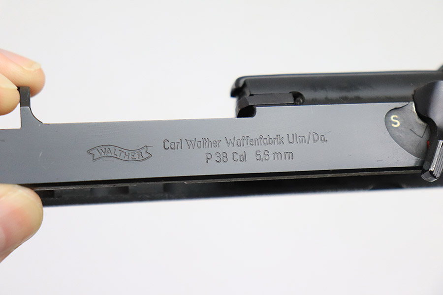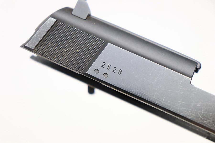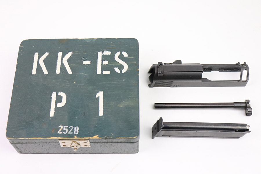 11/1/22 – This is an excellent example of an original Walther P1/P.38 .22 caliber conversion kit from the post-WW2 era. The metal of the included barrel, upper receiver, and magazine are in excellent condition retaining virtually all of their original finish. The slide shows minor signs of handling wear on it’s left-hand side. It features two “eagle 952” proof marks, indicating 1952 production, and serial number “2528” on its left side. The right side is marked “Walther Carl Walther Waffenbrik Ulm/Do. P 38 Cal 5,6mm”. The included barrel is also “eagle 952” proof marked on the breech and also serial numbered “2528”. The bore is in mint condition. The magazine is marked “Walther” on one side and “p 38 cal. 5,6 mm” on the other. The follower is in excellent condition. The spring is strong and function. The original green painted, wooden box included is in good condition overall, showing use wear throughout. The hinge and latch are both secure and functional. The front of the wooden case is marked “KK-ES P1 2528”.