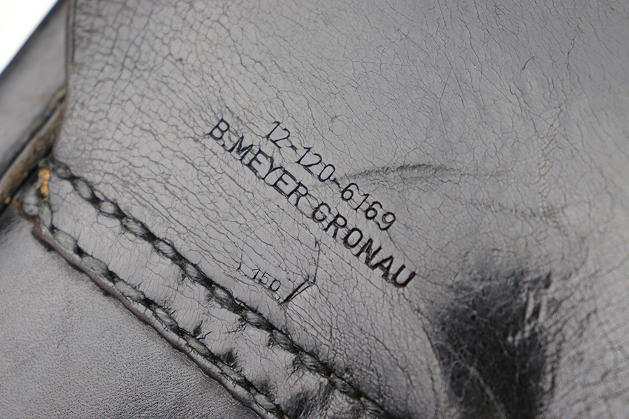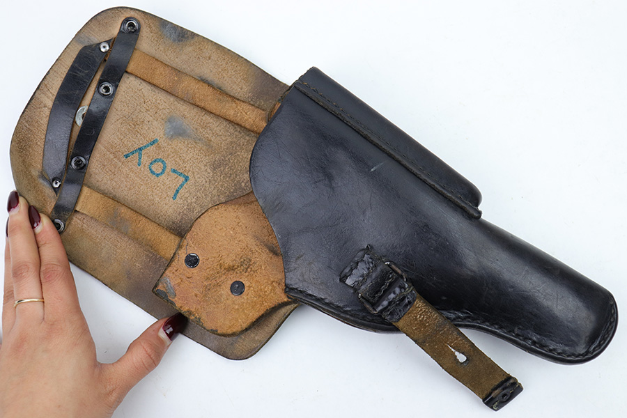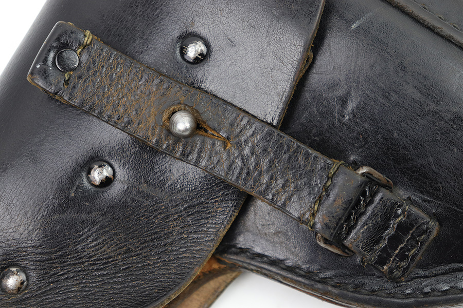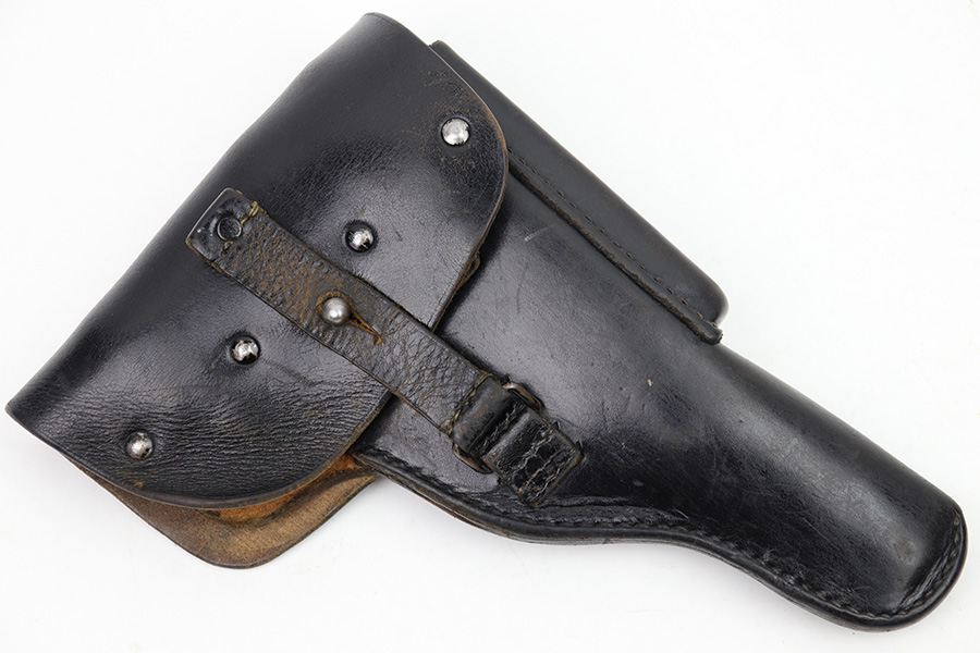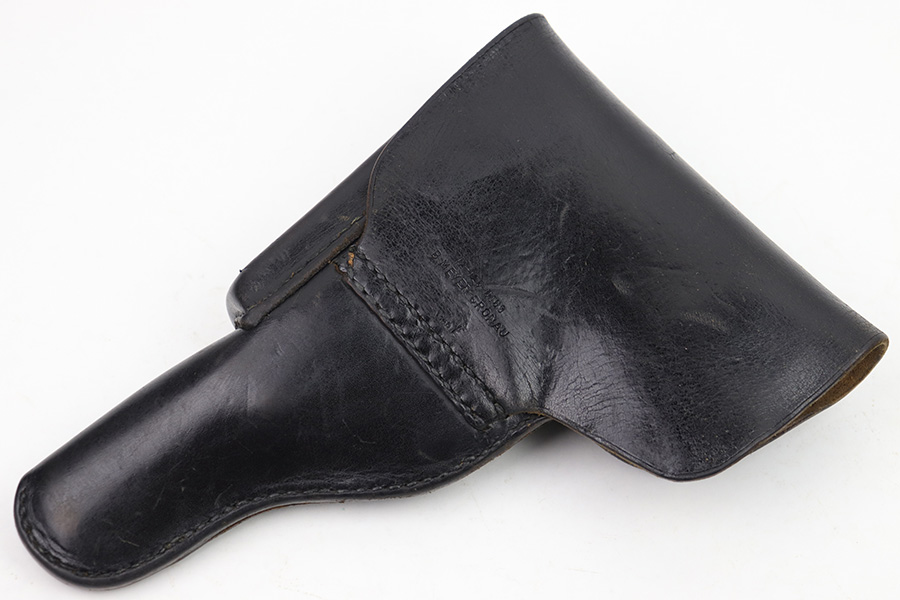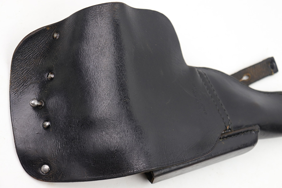 1/17/23 – This is a Post WW2 production Walther P1 or P.38 holster. The back leather is maker stamped and proof stamped as shown. Nice black leather and all original stitching intact. Some exterior leather wrinkling and mild use wear but no excessive damage.