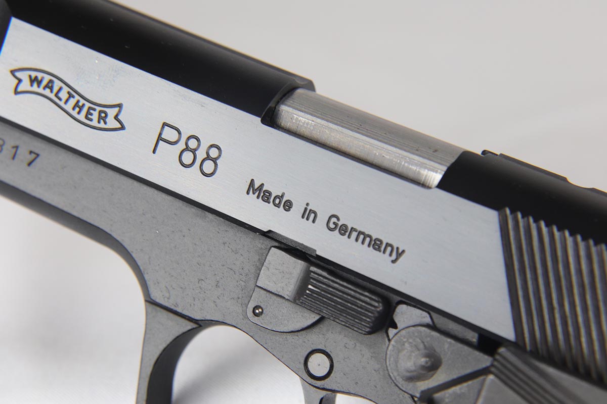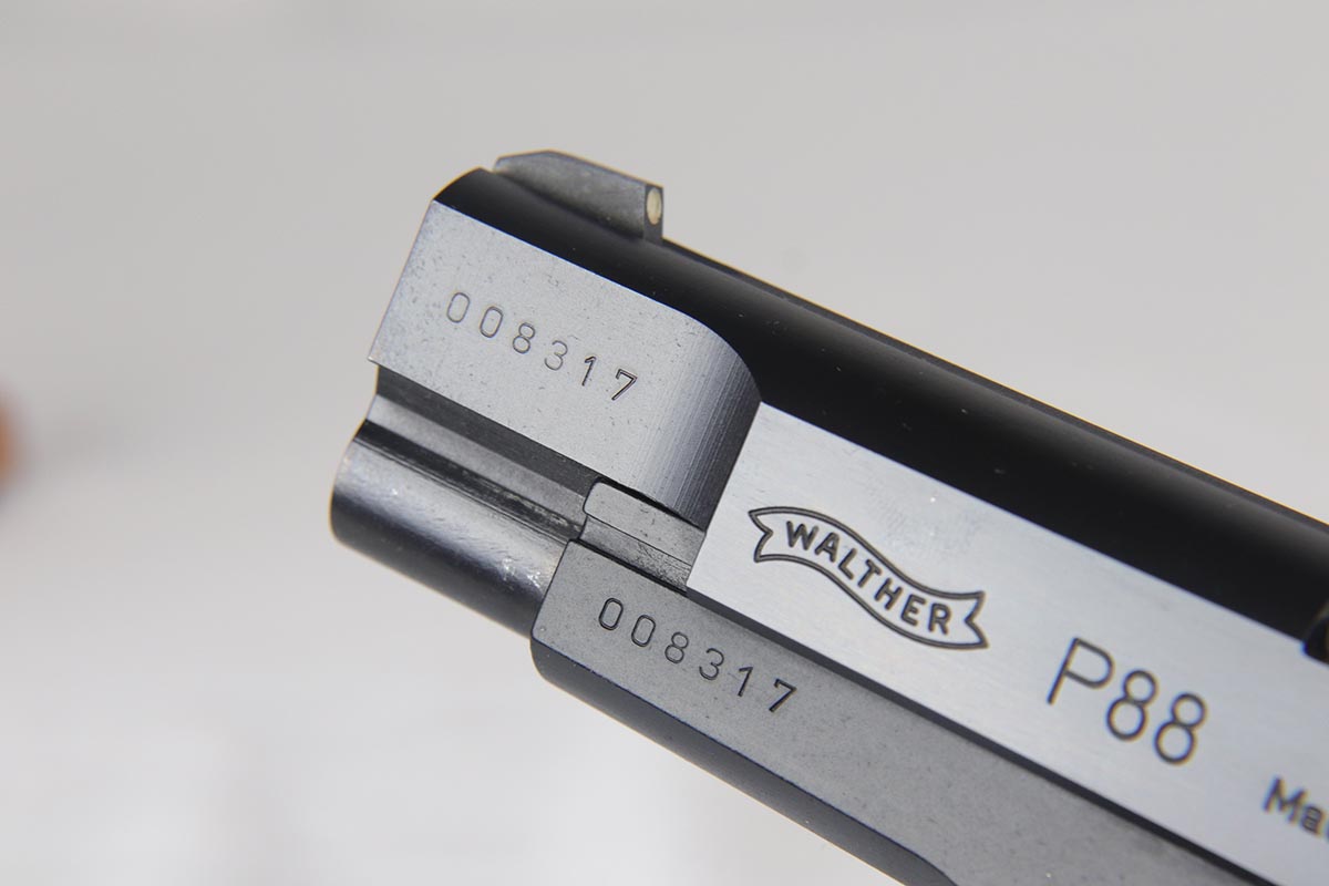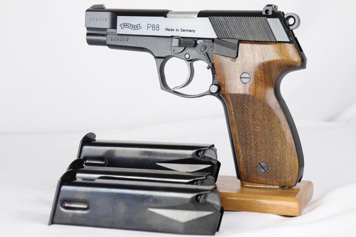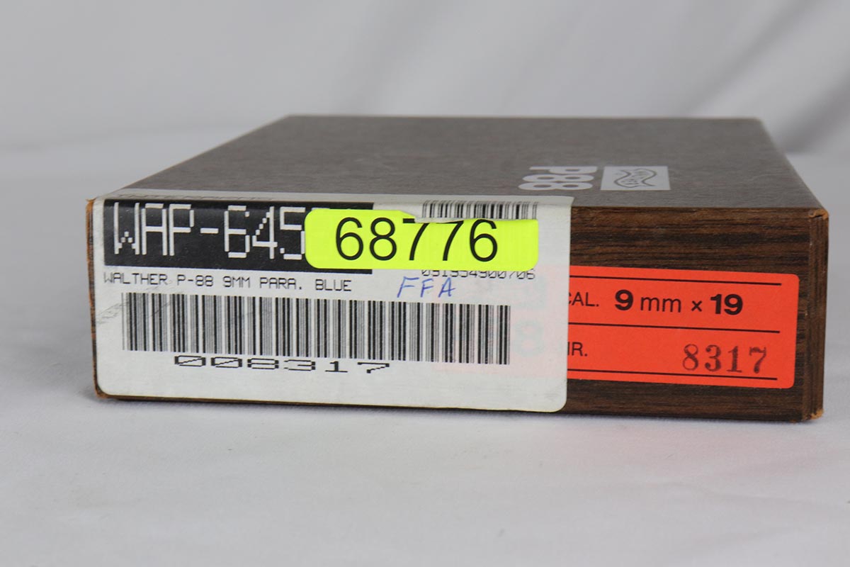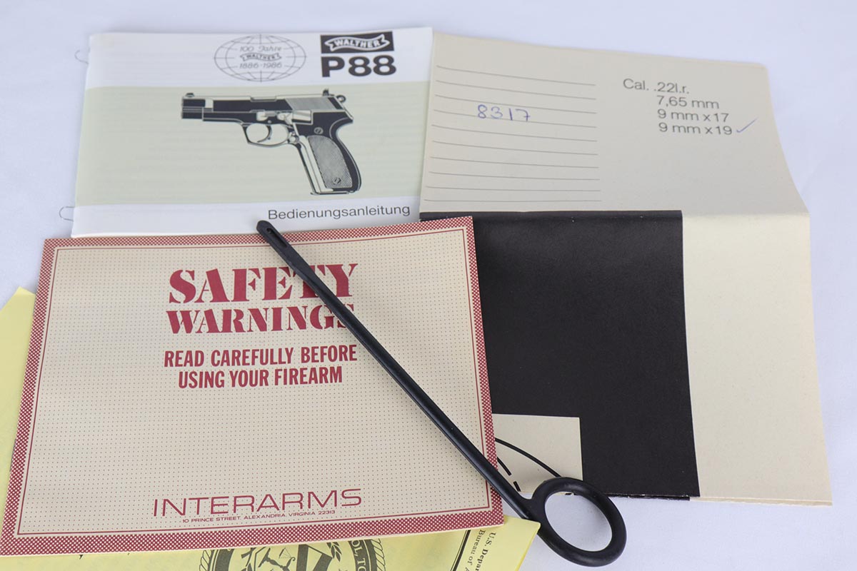 6/20/18 – This is an “as new in the box” Walther P88 pistol, chambered in 9mm Para, with double stack magazines.  It was made in Germany, and appears unfired after leaving the factory. Only about 11,000 of these guns were imported into the US in late 80s and early 90s and proved to be too expensive to manufacture. This particular set is complete with serialized box, test target, two extra magazines, cleaning rod and all the paperwork. The P88 is considered by many to be one of the best “out of the box” 9mm pistol, second possibly only to the SIG P210(which is three times more expensive).
