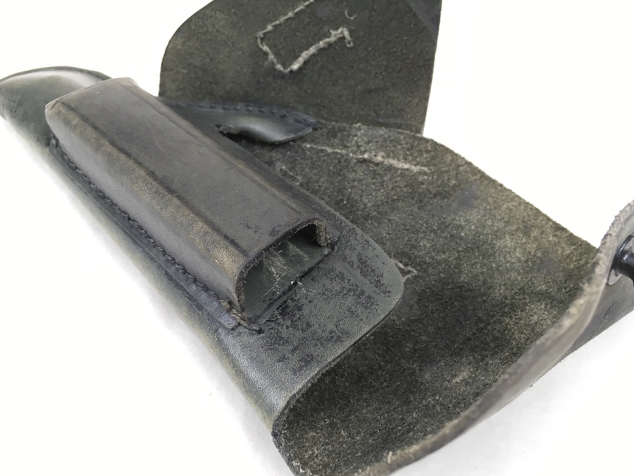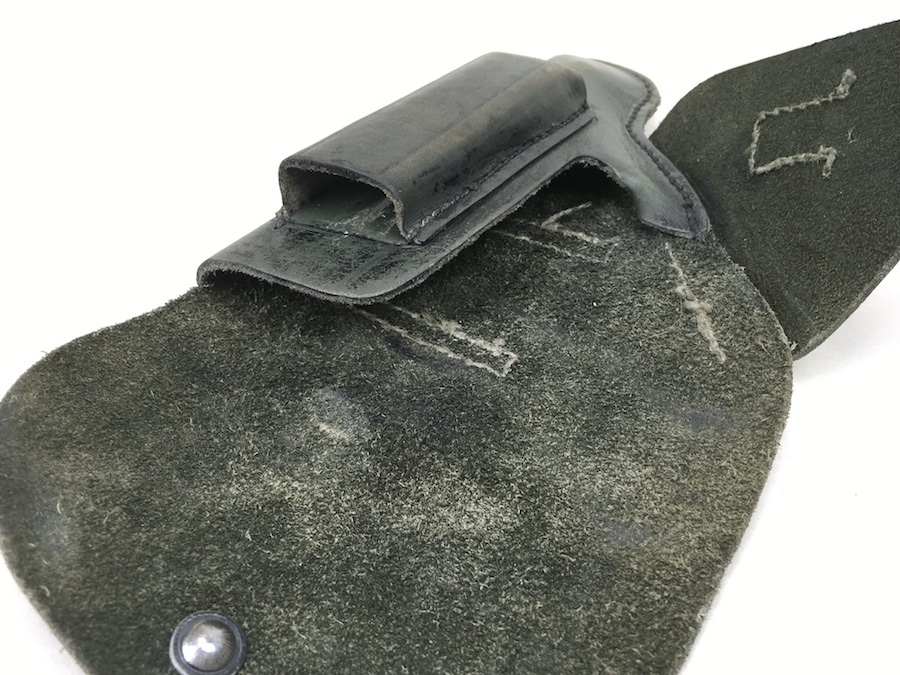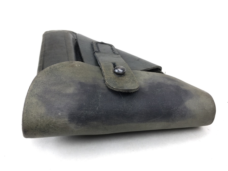 11/4/19 – This is an original AKAH style Walther PP holster from late WW2. This green color could be German Army or it could have been used by the Forestry Service or “Land Police”.  Also fits Mauser HSc, 38h and most other 7.65mm axis pistols. No maker mark or date, but the style and stitching indicates late war manufactured. The interior leather is fairly clean. Surface has minor scuffing, but otherwise in very good condition. All stitching is intact and secure.