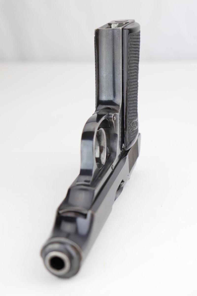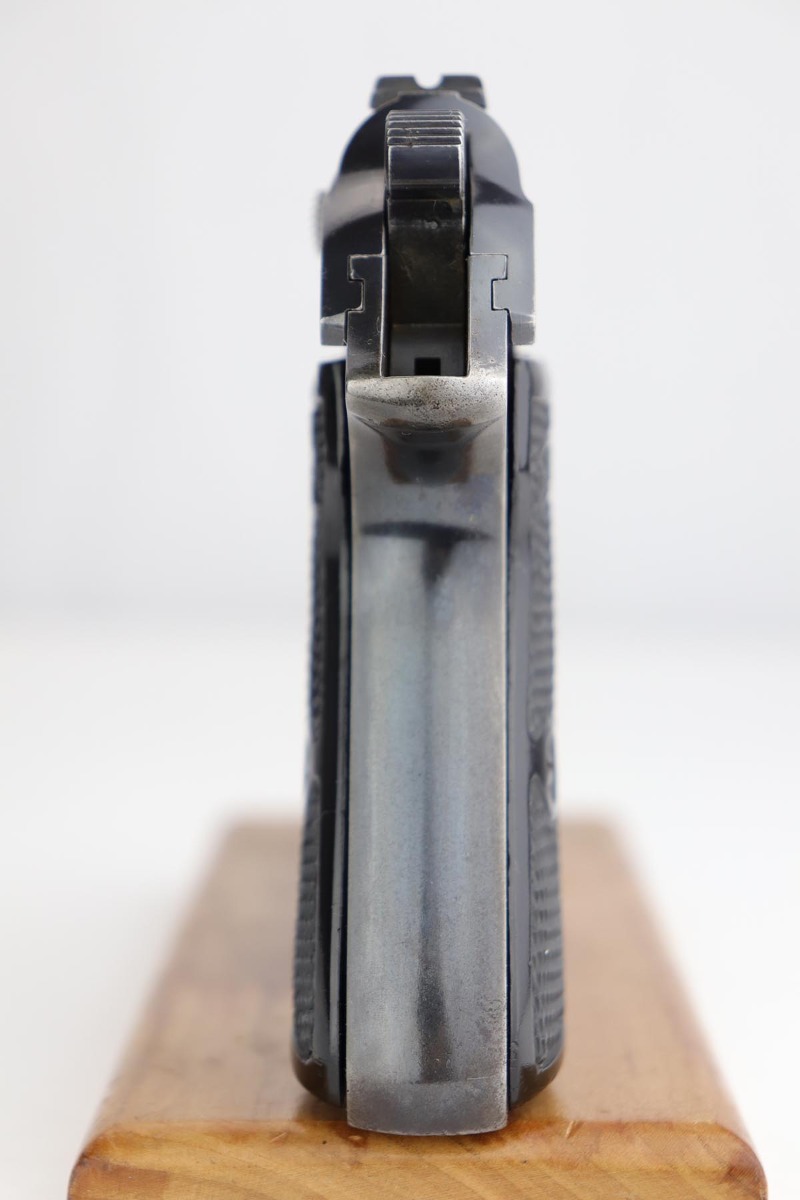5/19/20 – This is a rare, early 1st year of production Walther PP. The pistol has early features like a thicker hammer and fat safety lever. Further, this pistol has the ultra-rare original “X-Grips”. The pistol has nice all original finish that rates in about 90-92% condition. There’s light discoloration and finish loss throughout the edges of the slide and near the muzzle. The straps have some browning patina throughout and light finish loss. The bore is very nice with minimal wear, 9/10. All original and authentic.