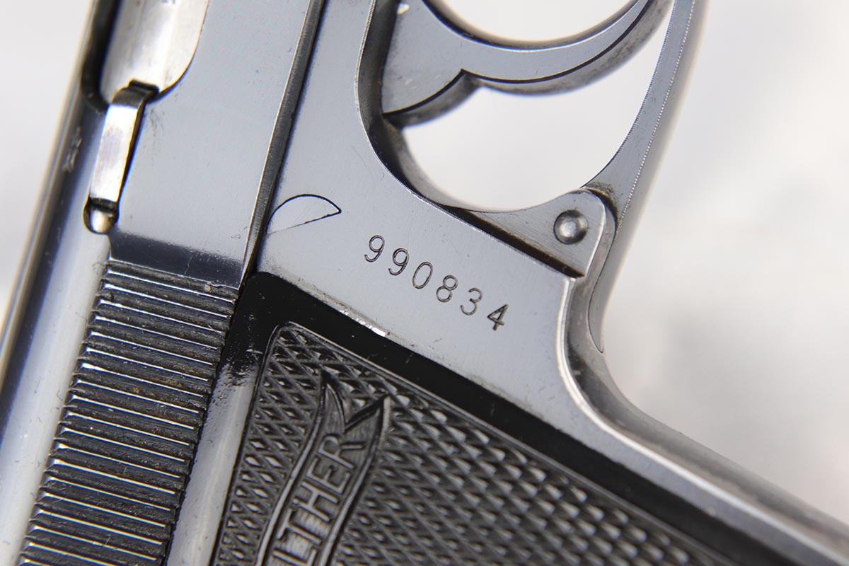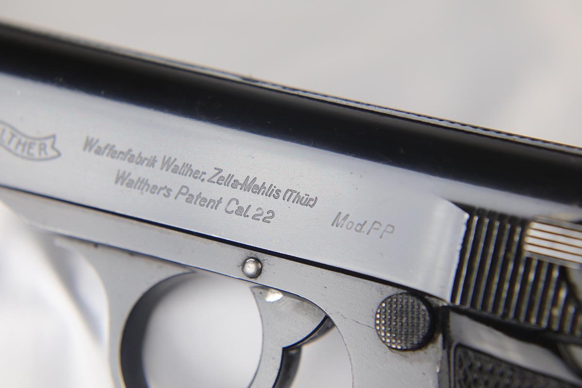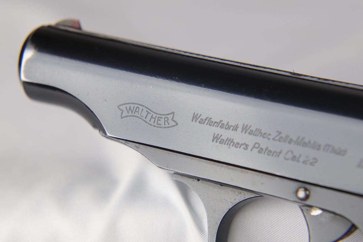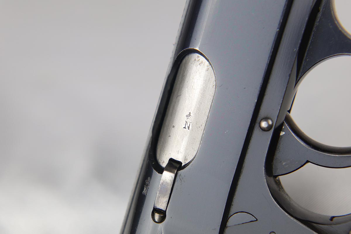 6/19/18 – This is a Nazi era Walther PP that is chambered in .22 caliber. The pistol is all original with about 80% high-polish blue. The profile view is excellent but the straps show notable finish loss, especially the back strap. The bore is near-mint so this one could make an excellent and affordable shooter. Post-war magazine. Excellent grips.