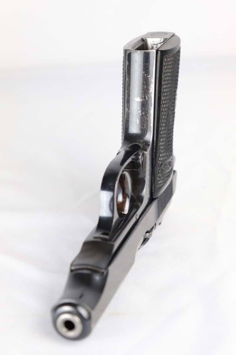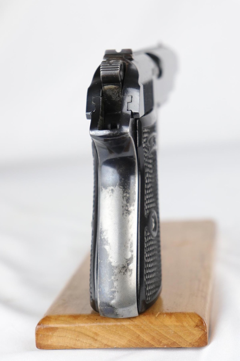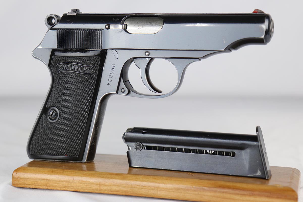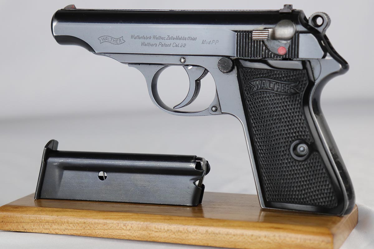 6/19/18 – This is a Nazi era Walther PP that is chambered in .22 caliber. The pistol is all original with about 80% high-polish blue. The profile view is excellent but the straps show notable finish loss, especially the back strap. The bore is near-mint so this one could make an excellent and affordable shooter. Post-war magazine. Excellent grips.
