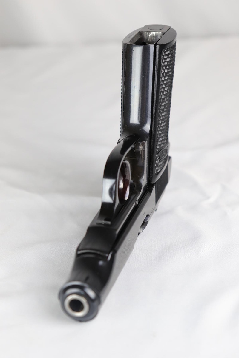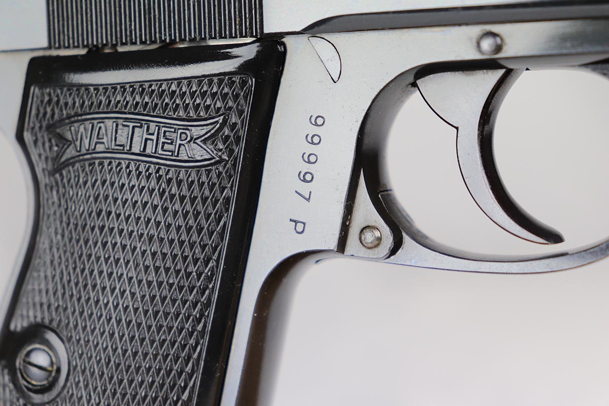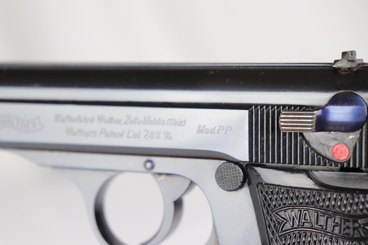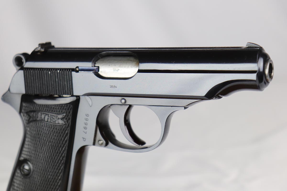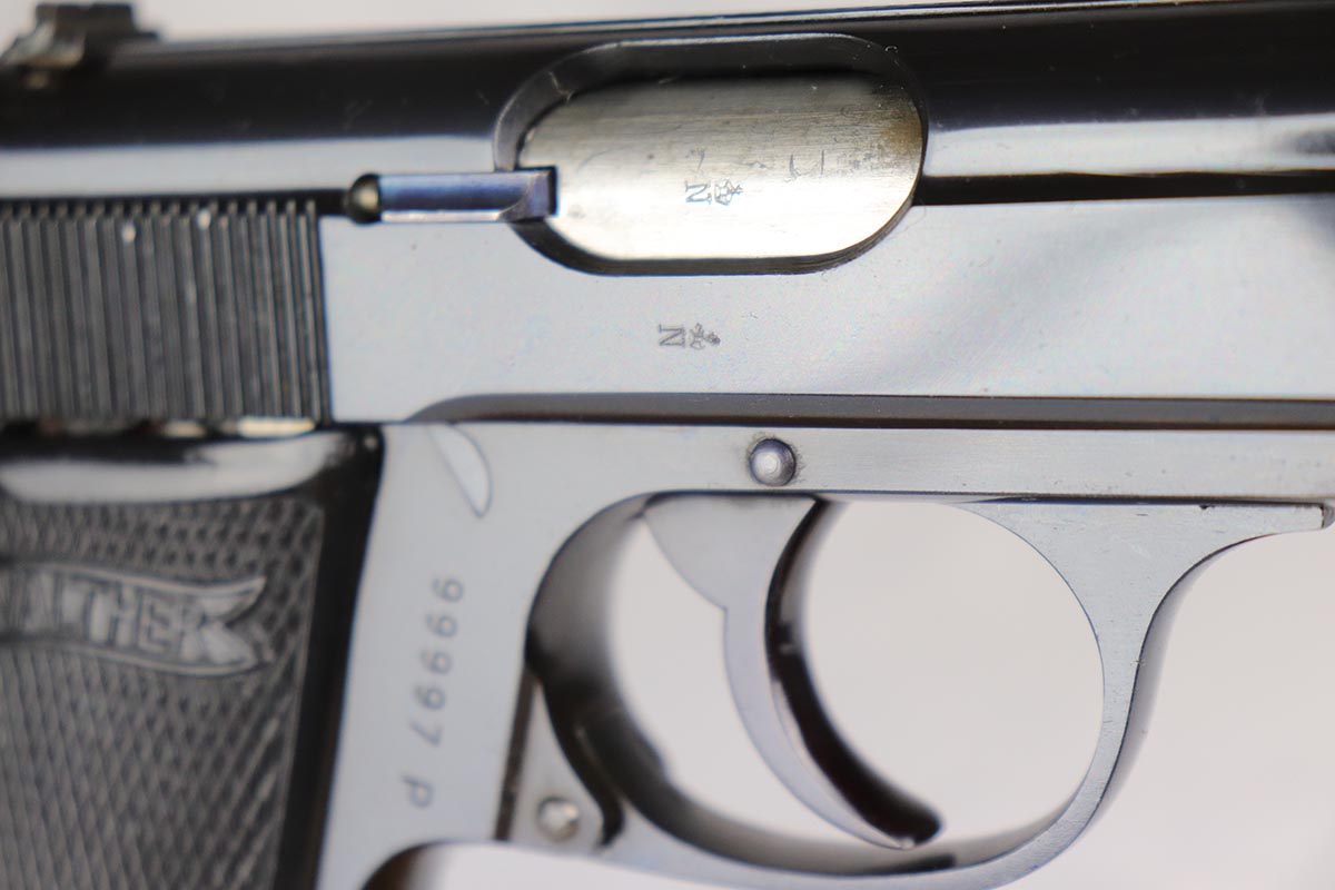 3/13/18 – This is a rare WW2 production Walther PP with a 5 digit serial number. There are only about 20 known wartime PPs with 5 digit serial numbers, this one being the latest recorded serial number. The known serial number range is 98895 through 99997. There are estimated only 1k pistols made with a 5 digit serial number during WW2. This pistol has about 99% of the original blued finish still in tact, with the only notable wear being on the back strap near the base / magazine well. The fire blued safety is minty, as is the rest of the gun. The pistol comes with an early PP finger extension magazine, and a near mint bore. Guaranteed original and authentic – comes from our owner’s collection!