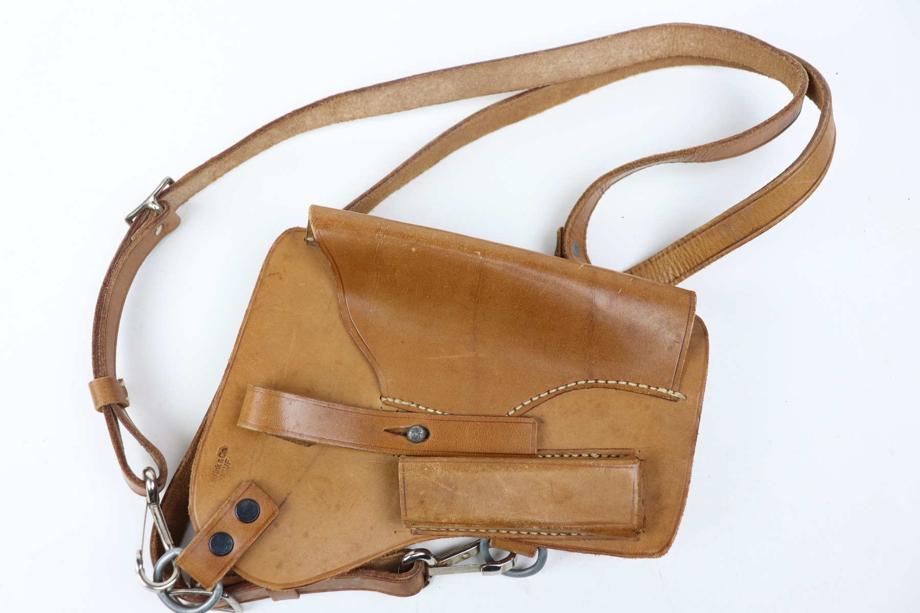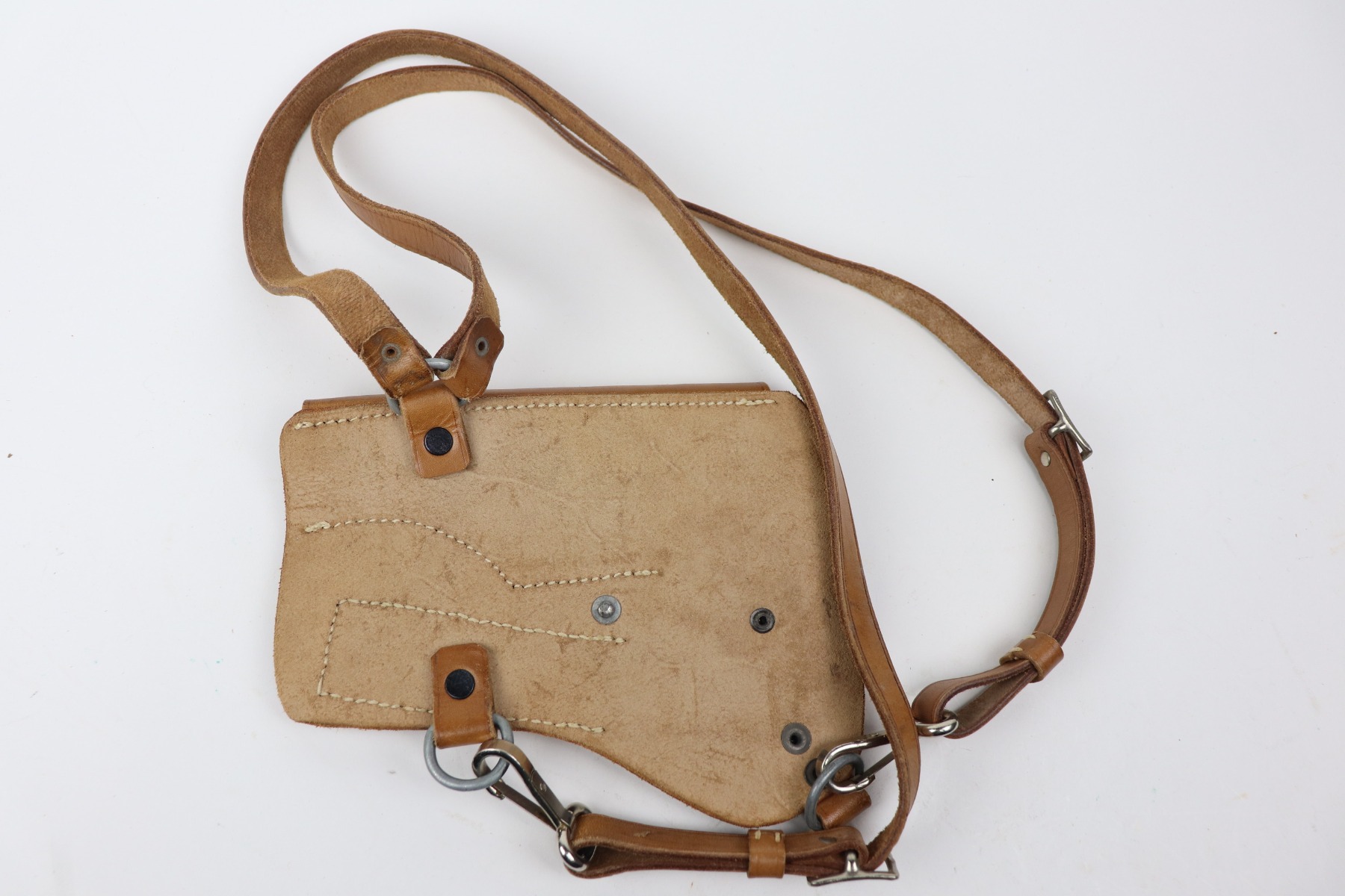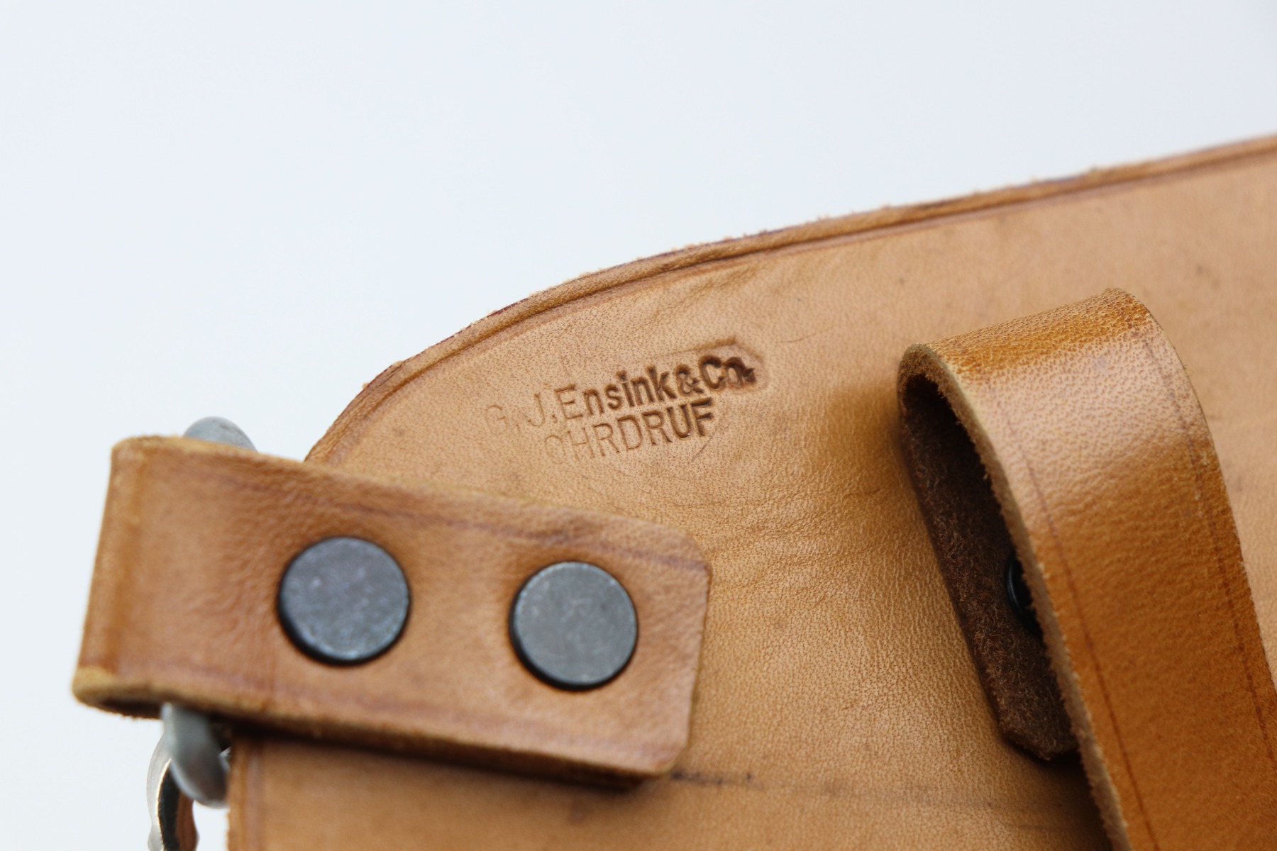 2/3/21 – This is a post WW2 production shoulder holster for a Walther PP or similar sized pistol. The holster is in minty overall condition with excellent, strong light brown leather and all stitching in tact. The front leather is stamped by maker G.J. Ensink & Co.