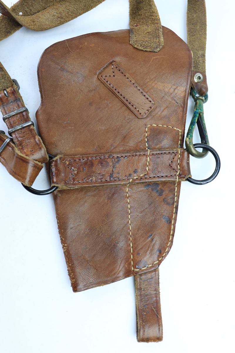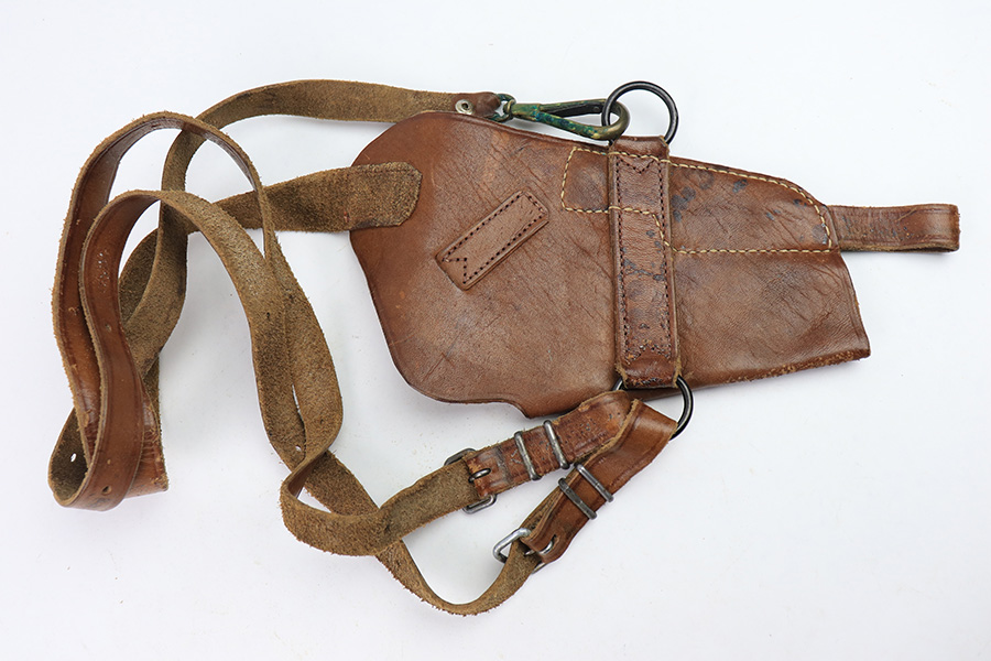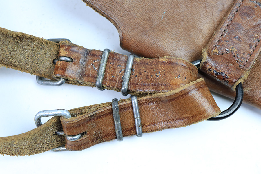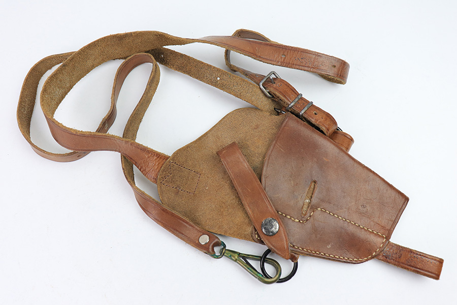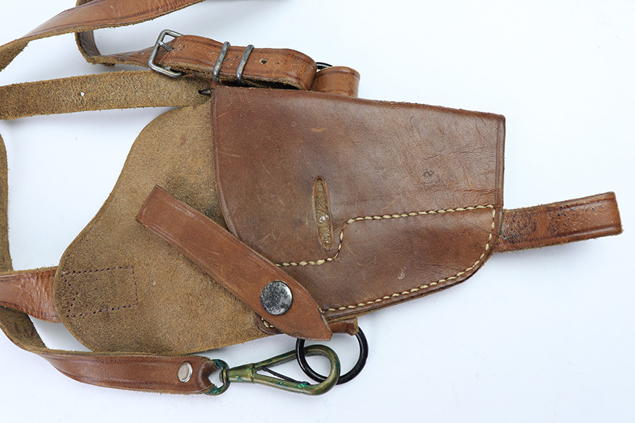 12/27/22 – This is a post WW2 production shoulder holster for a Walther PP or similar sized 7.65mm pistol. The holster has no maker markings or stamps but is all leather construction and in great overall condition. There’s some mild exterior surface wrinkling but no cracking or excessive wear. No notable stitching issues and nice metal clasps and hardware.