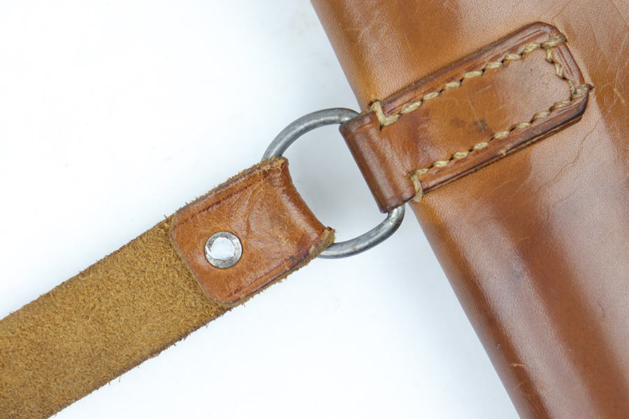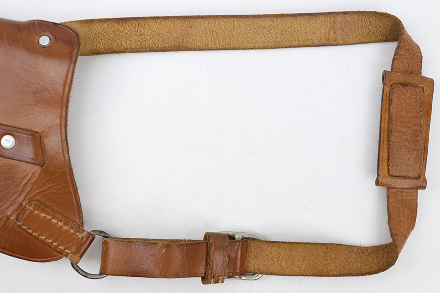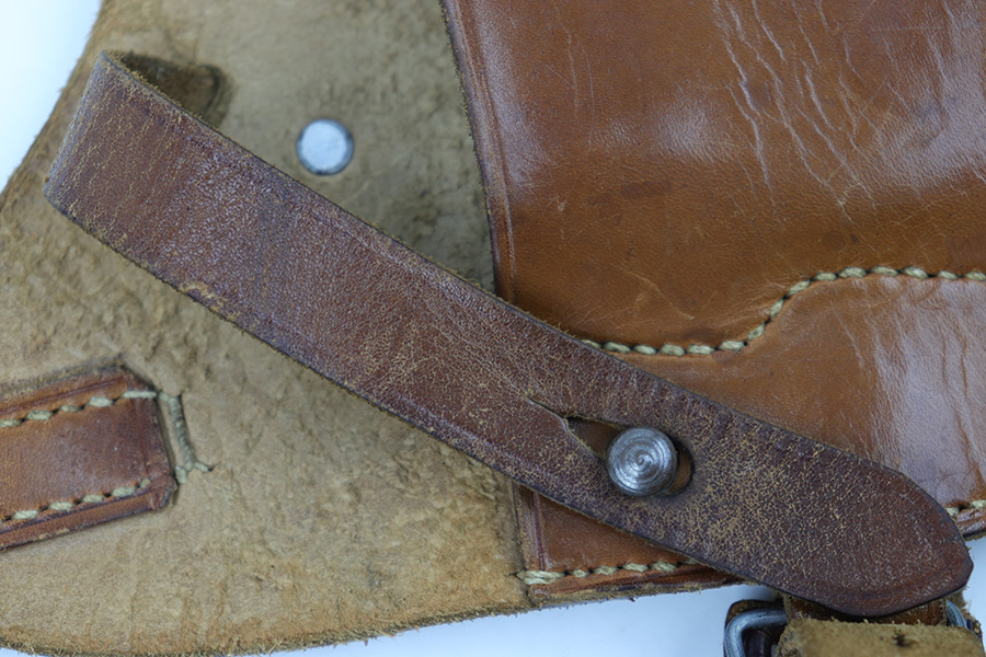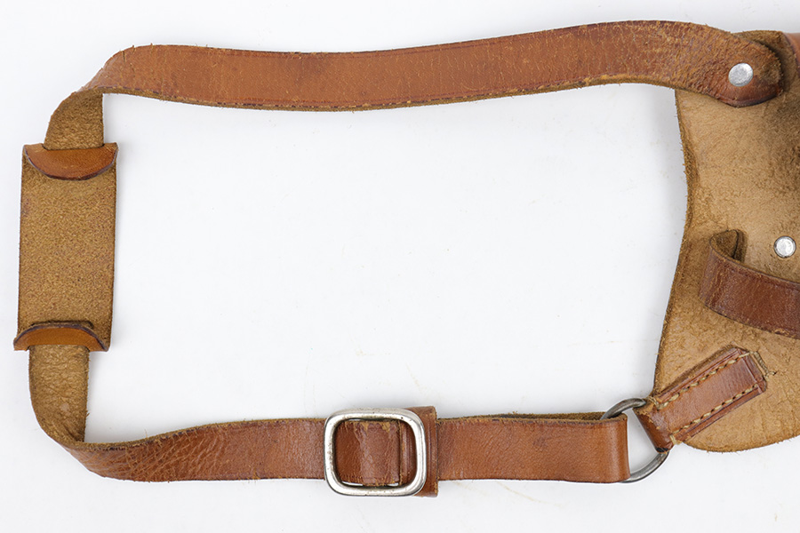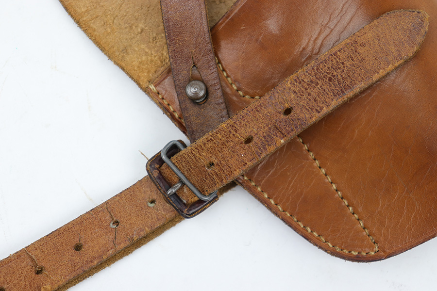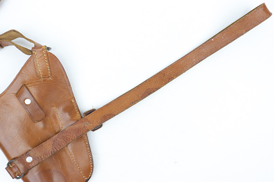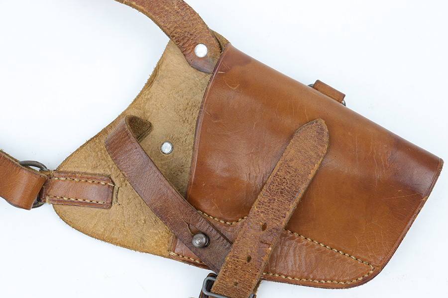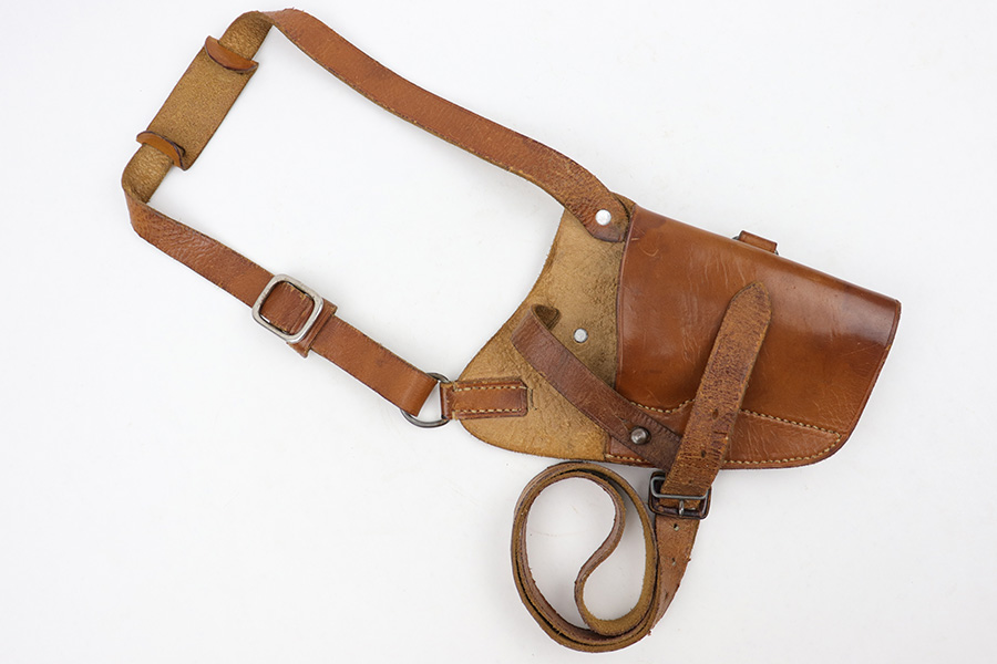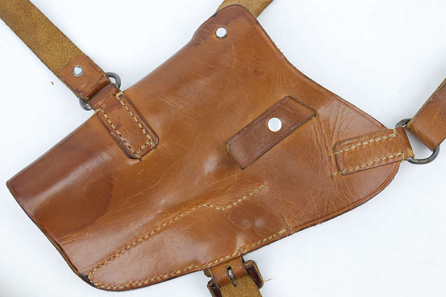 4/7/23 – This is an unmarked leather shoulder holster that fits a Walther PP or similar sized 7.65mm Axis pistol. The holster has typical style and wear patterns of a WW2 German production holster. However this could be an immediate postwar production. Priced accordingly. The holster has excellent light brown leather and all original stitching intact. There’s some mild surface cracking and wrinkling on the shoulder straps, but this is surface wear and doesn’t go deep into the leather.