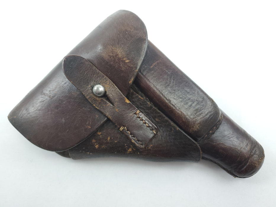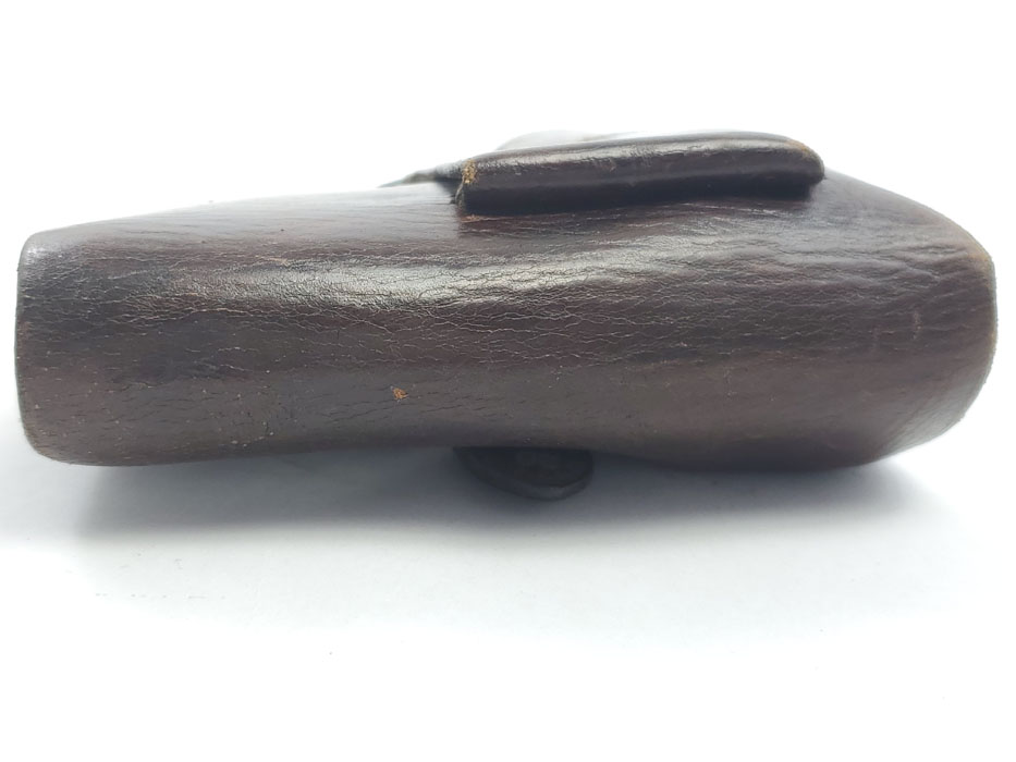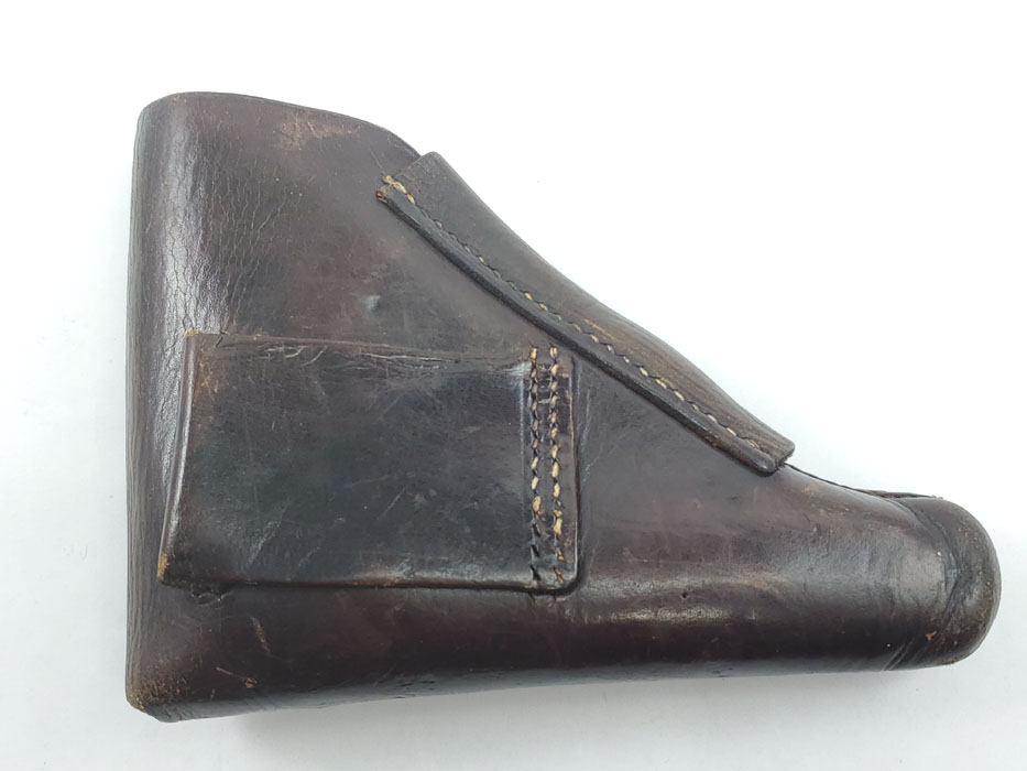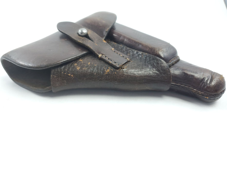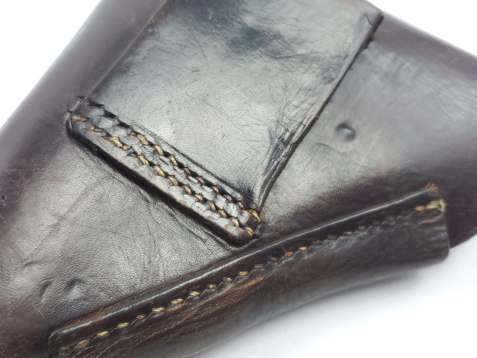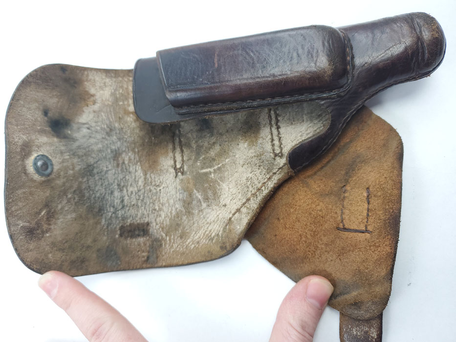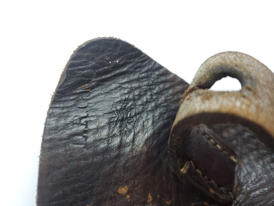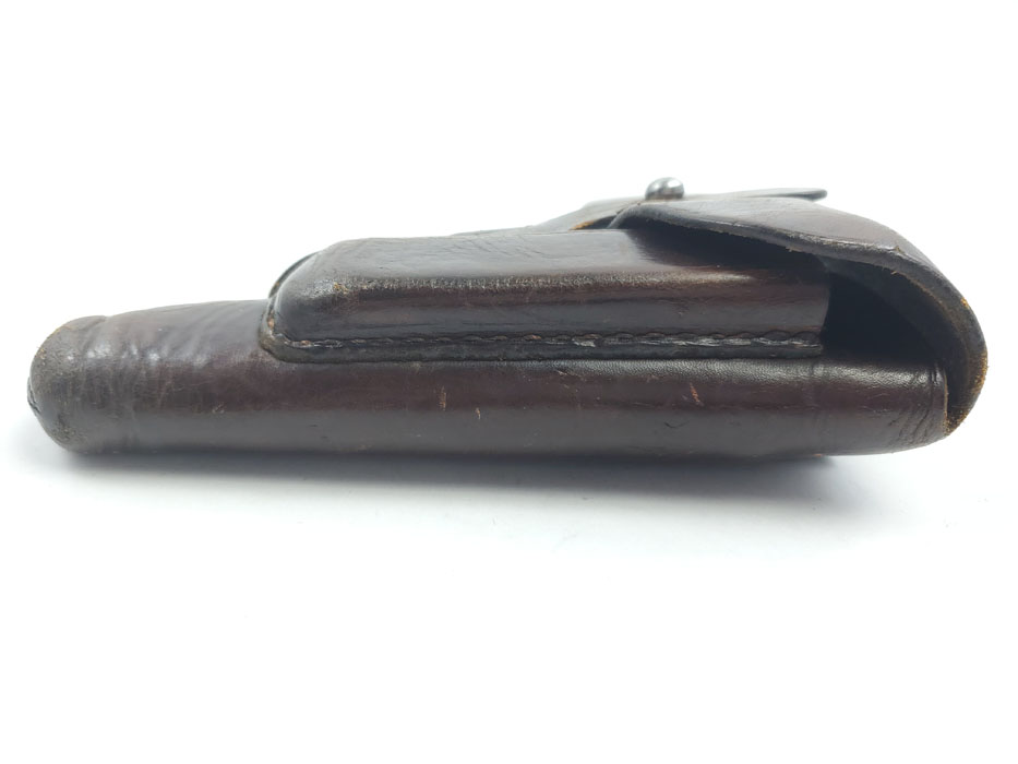 4/3/20 – This is a WW2 wartime production Walther PP holster made by AKAH. Under the closure strap is the crossed rifle logo and D.R.G.M. stamp. The leather has some very small scuffs and light wrinkling, but no major damage. The interior leather is slightly scuffed and stained. No notable stitching issues. A nice, straight-forward example.