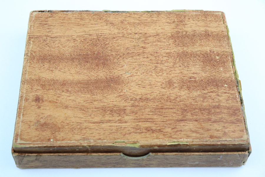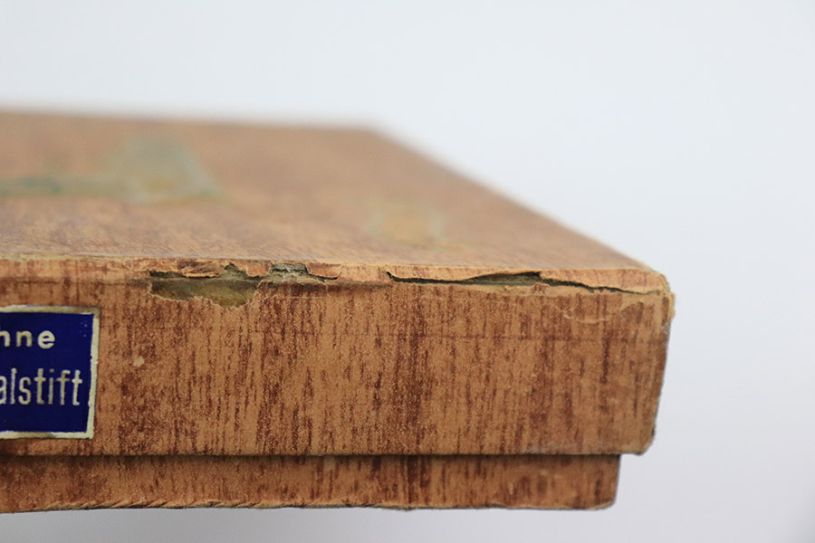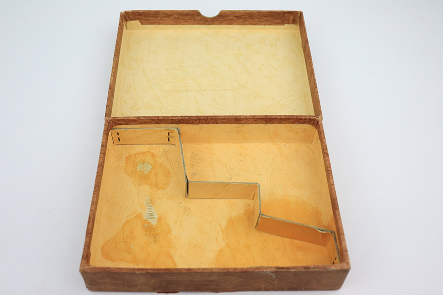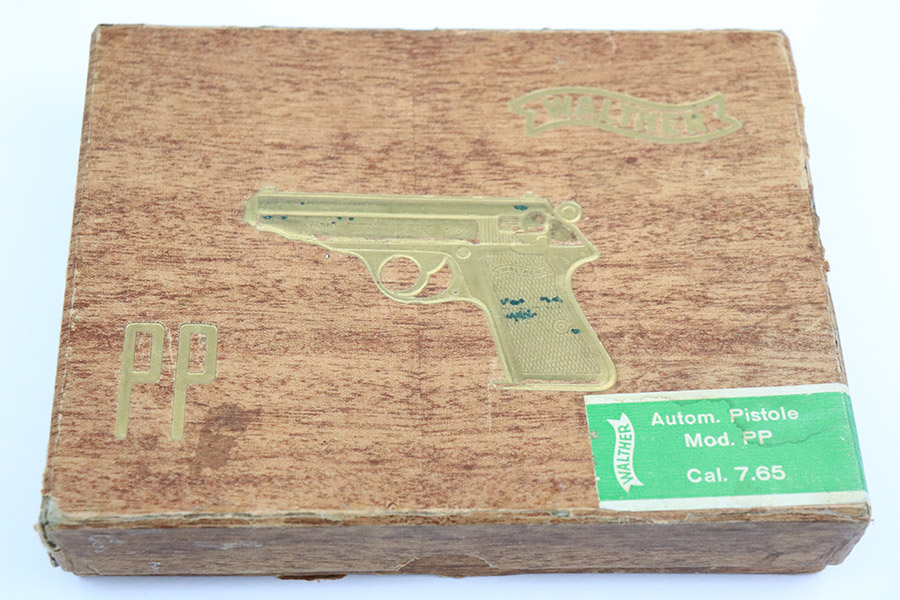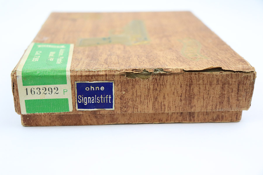 10/24/22 – This is a great example of an original Walther PP box from the 1930s. The exterior of the box is in great condition. The lid features an original label reading serial number “163292p”. The front left corner of the lid is separated at the seam but the sides are still rigid and hold their shape. The back left corner of the lid has separated, but been repaired with clear glue. The edges of the lid and bottom have some minor fraying but are structurally sound. The bottom has some gluing along the front and right edge. The interior is very clean with some with minor wear in the bottom and two patches of more noticeable rub wear. The partition is sturdy in place and fully intact.