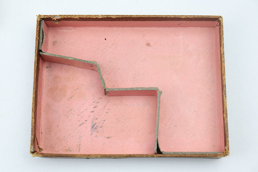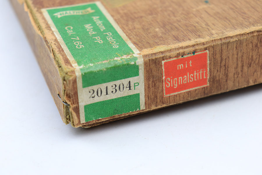 3/4/21 – This is an original Walther PP factory box, cleaning rod, and tin. The tin is “complete” with an oiler and Walther cleaning rag inside (as shown in photos). The box is structurally sound with no major issues, but there are some normal signs of aging and wear on the corners and edges of the box. The interior divider of the box is still in tact, which is hard to find. Original labels are still in tact on the exterior of the box. Great for a commercial Walther PP from the WW2 era.
