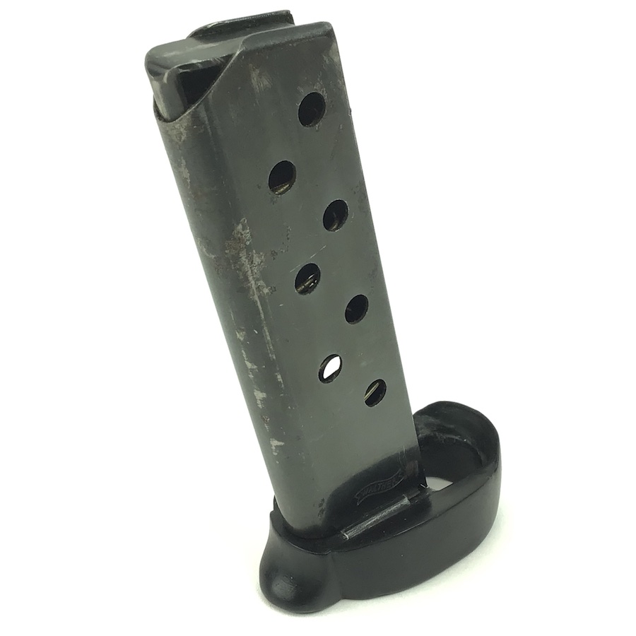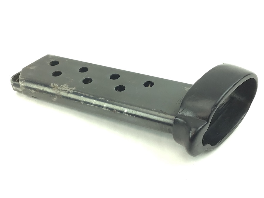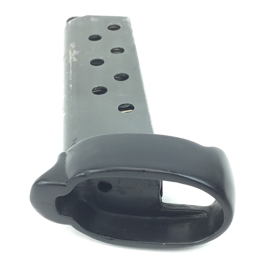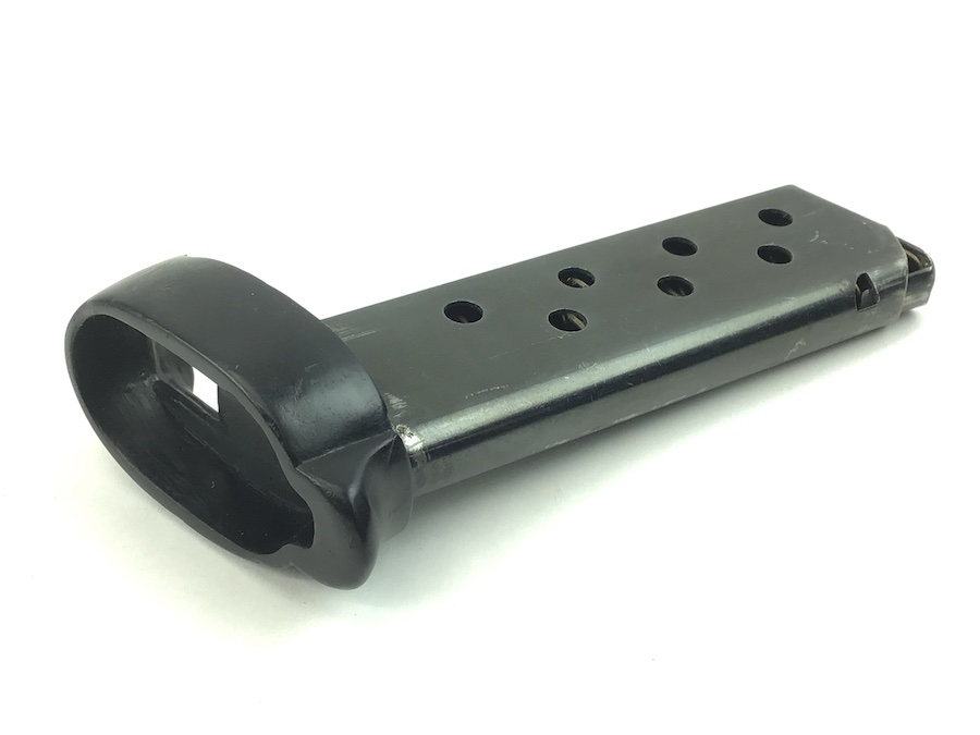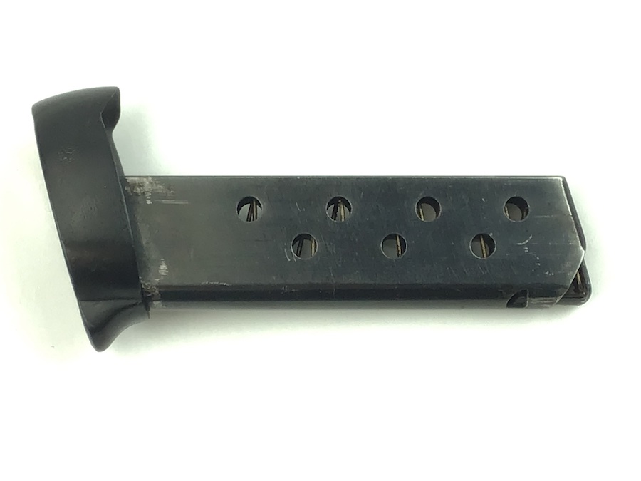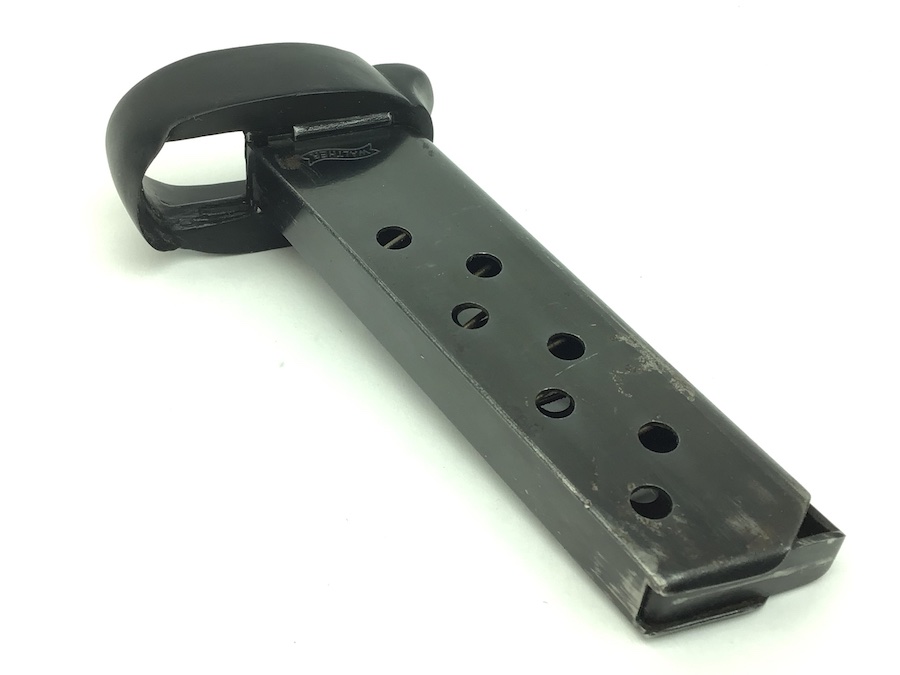 4/21/21 – This is a great condition early, pre-WWII Walther PP magazine with a black “box”  finger extension. The finger extension is in excellent condition with no cracks or chips. Original black bakelite base. Overall great condition – the magazine tube is original minor bluing loss. Strong, smooth spring.