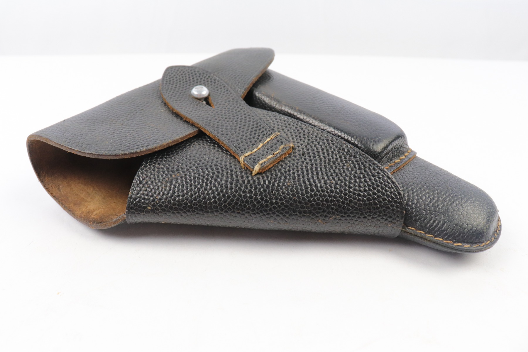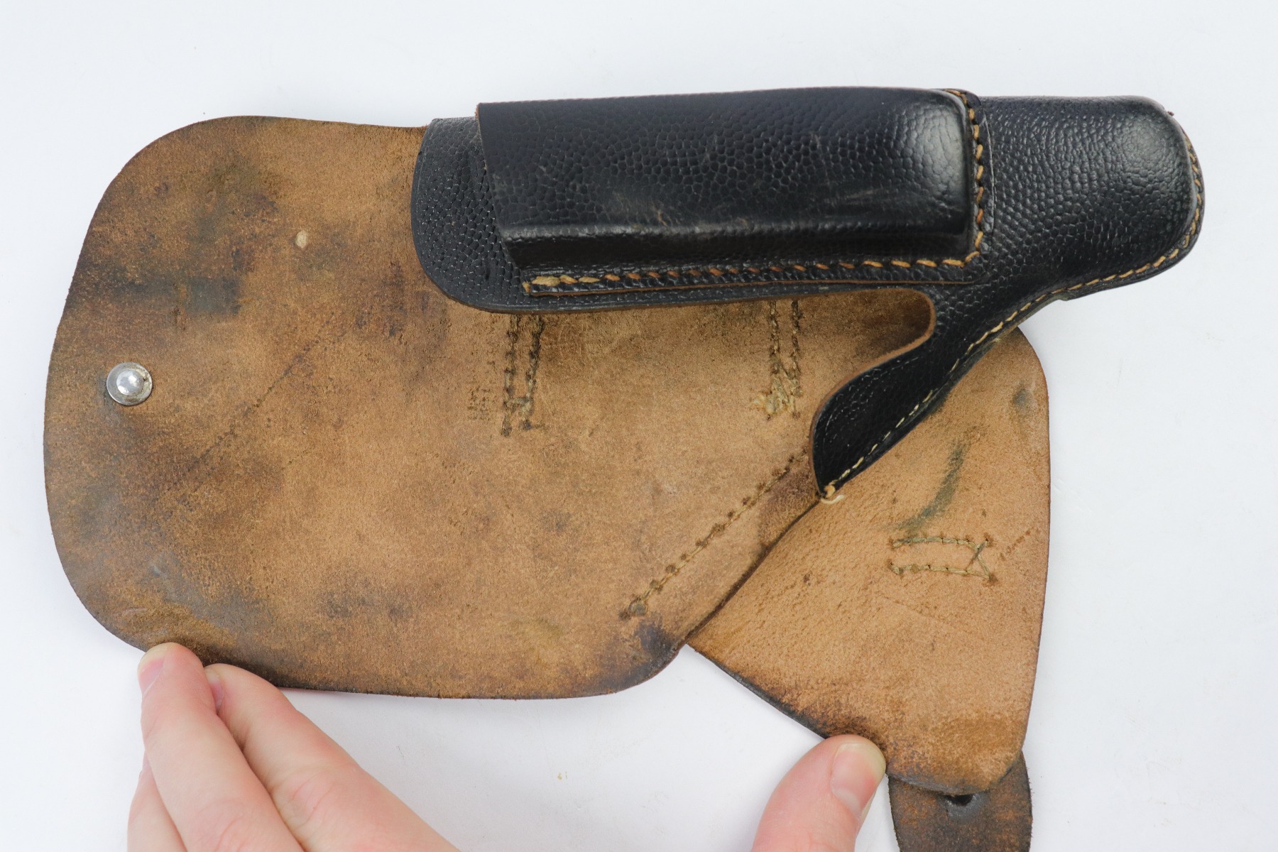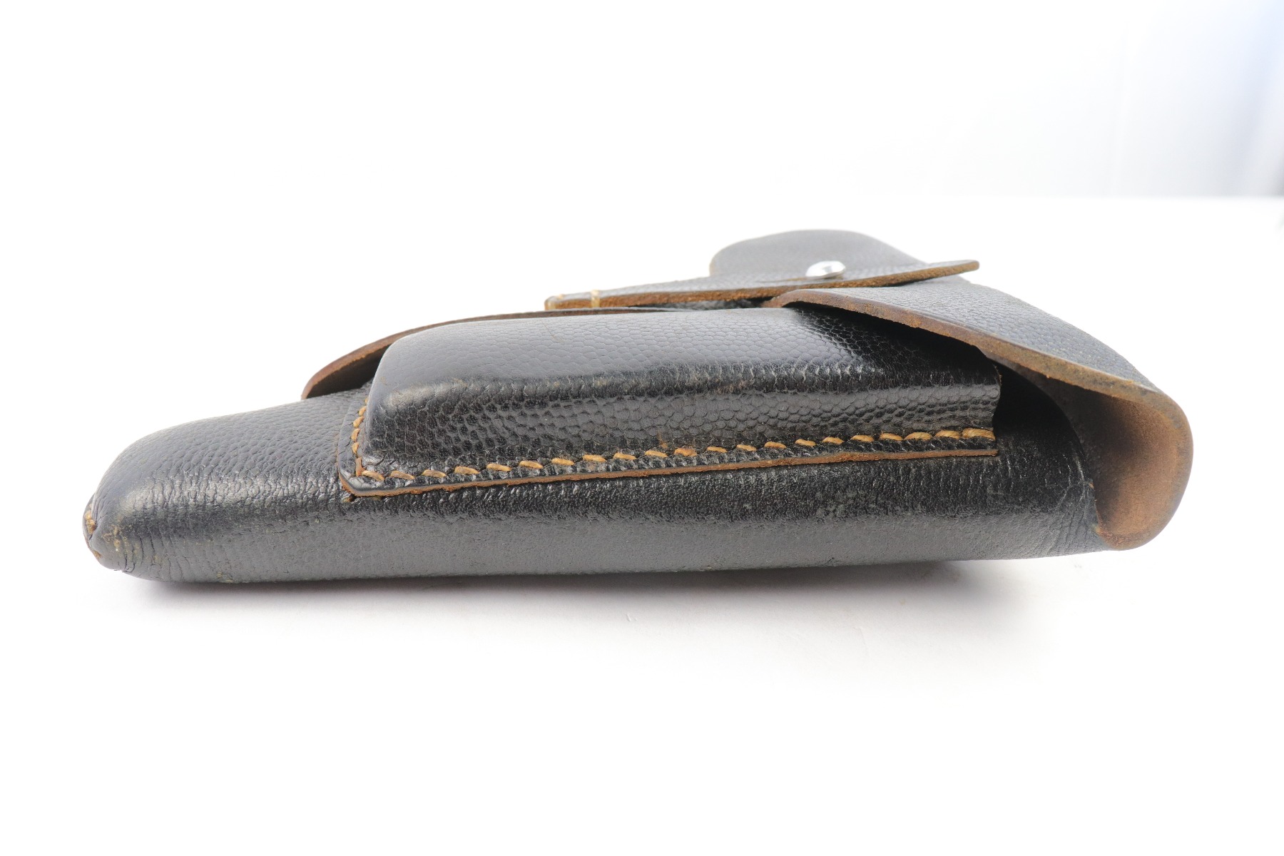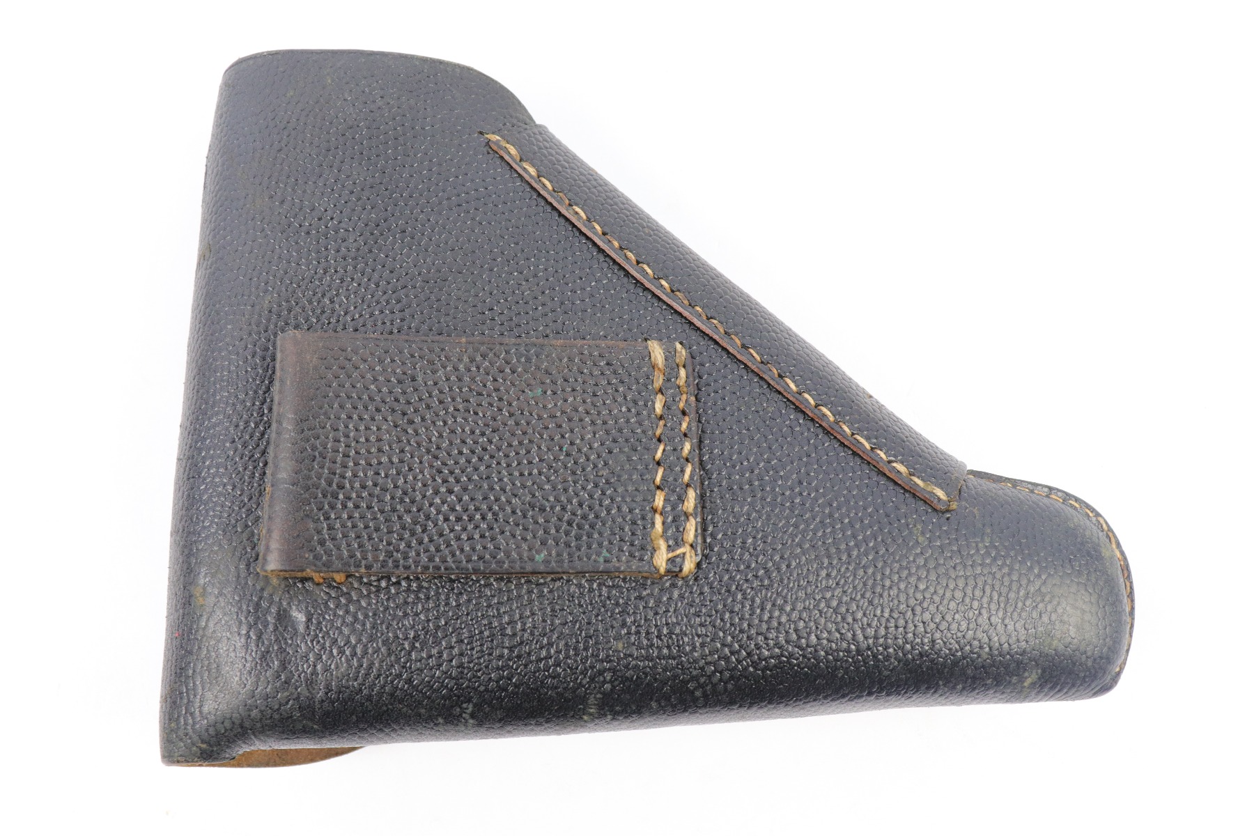 4/5/18 – This is an original pebble grain holster that fits a Mauser HSc, Sauer 38h, CZ-27, or Walther PP. The holster has a “bdr” maker code and 1943 date stamp on the interior along with a waffen eagle proof stamp. The pebble grain leather has some honest wear but no excessive or notable flaws. All original stitching is in tact. The interior leather is fairly clean. Guaranteed original and authentic.
