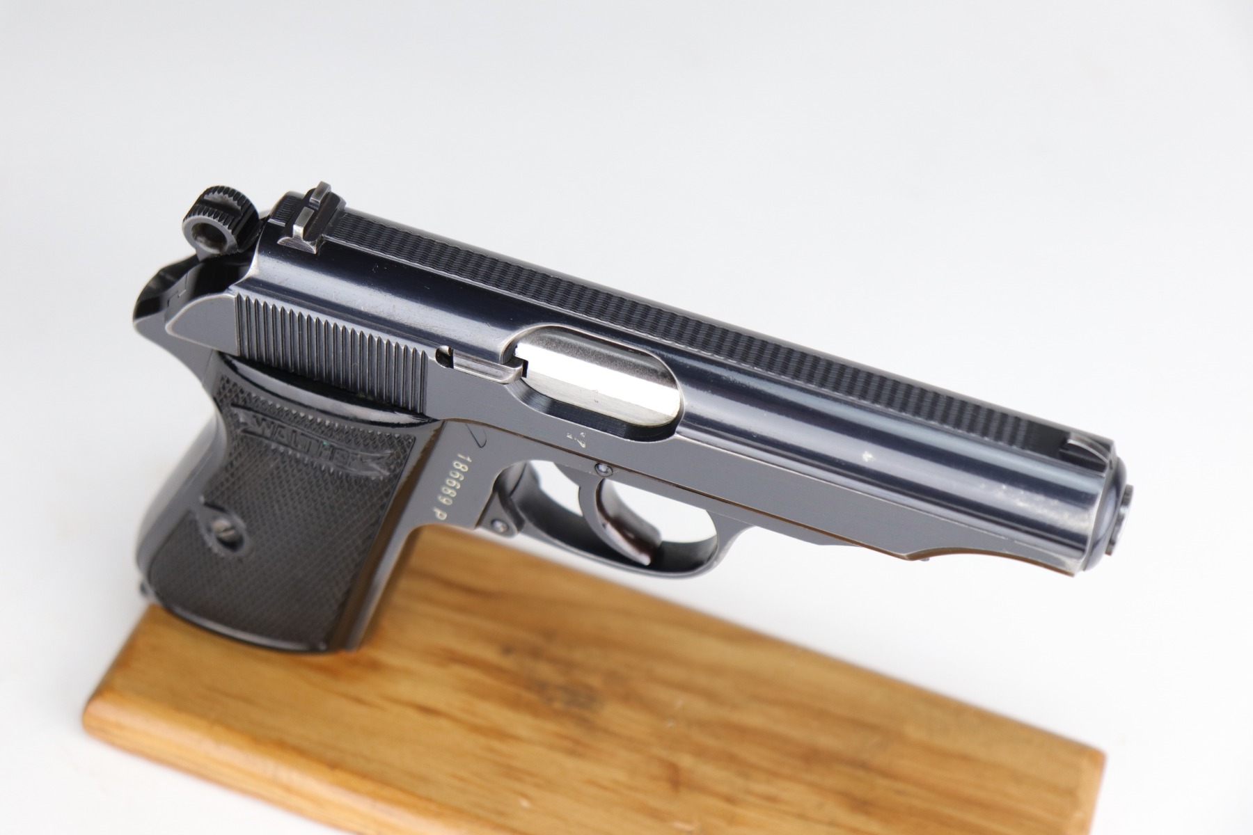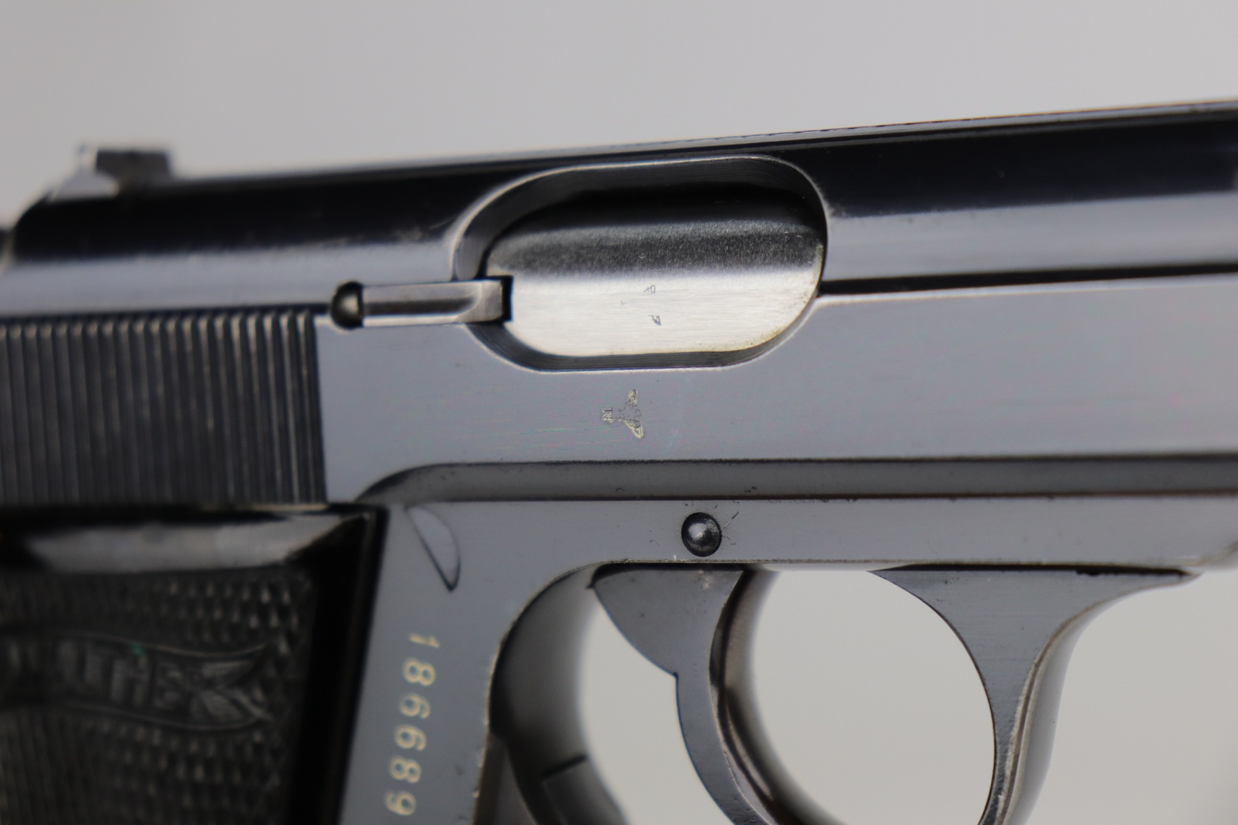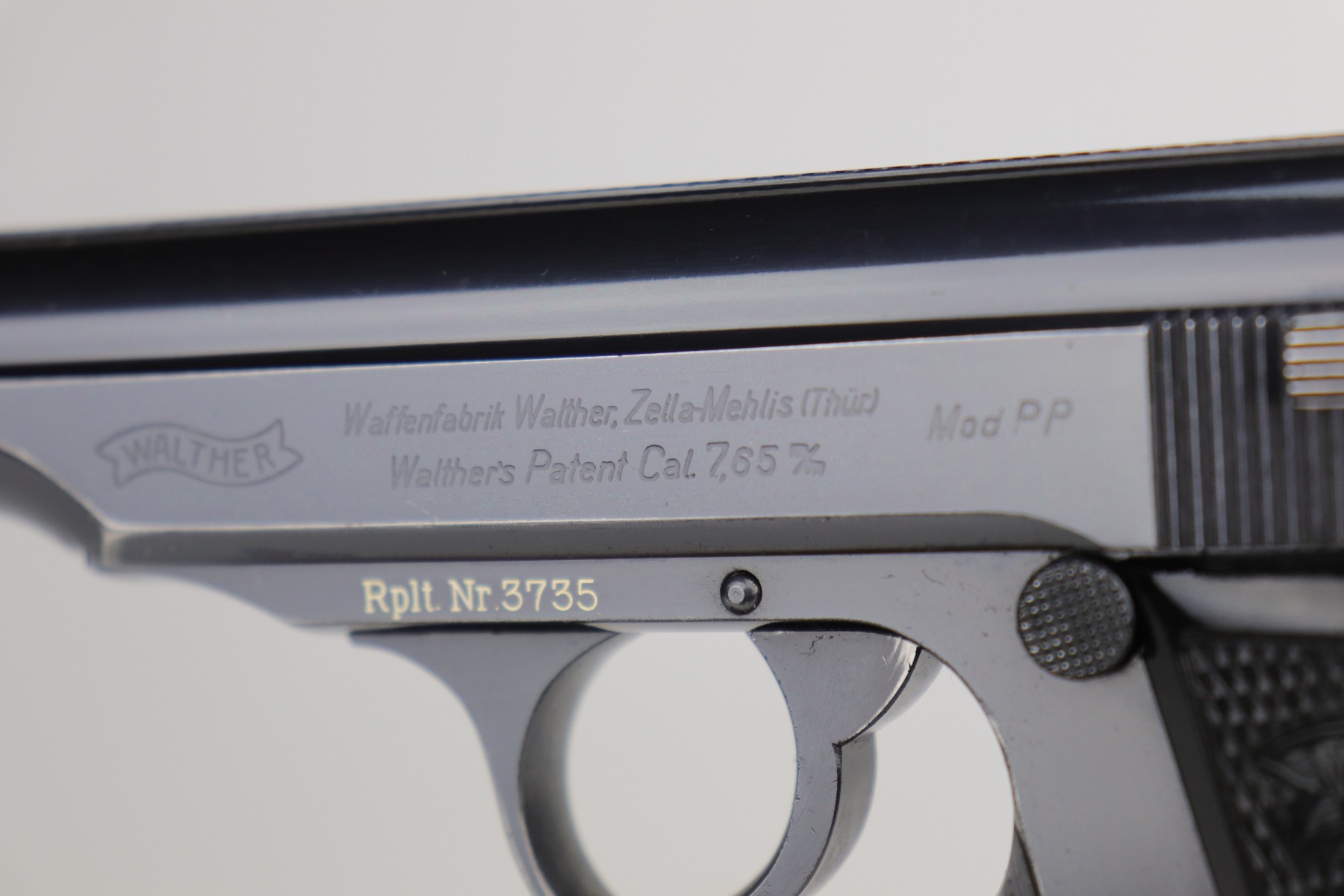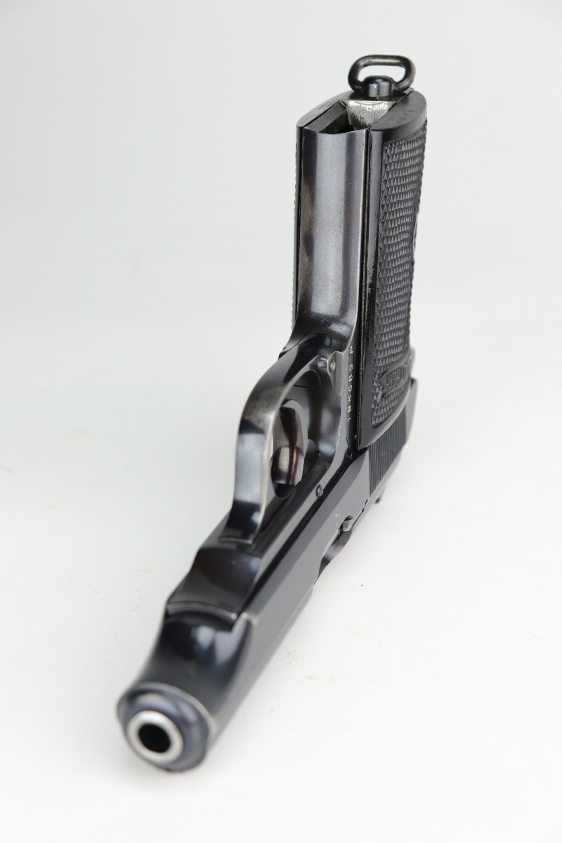10/30/20 – This is a very nice example of a Walther PP that was order by the Danish Police from the Walther factory in 1940. This is evidence by the Danish Police unit marking on the left side of the frame “Rplt. Nr. 3735” (done at the Walther factory) and the lanyard ring on the butt of the frame. These were ordered directly from the factory. This one is in exceptional condition for this variation as most were later reworked. This one is completely original and unaltered. This particular gun has retained about 90-92% of its original bluing. The fire blue on the safety lever is almost completely in tact. The profile views are excellent – most of the wear is on the straps. There is minor muzzle wear, wear on the high edges of the slide, and some light scratching along the peak edge of the right side of the slide. Light pin-pricking on both straps. There is one spot of discoloration on the underside of the trigger guard and a small area of oxidation on the underside of the slide. Comes with excellent Walther grips and a proper Walther banner magazine. The bore is near-mint.