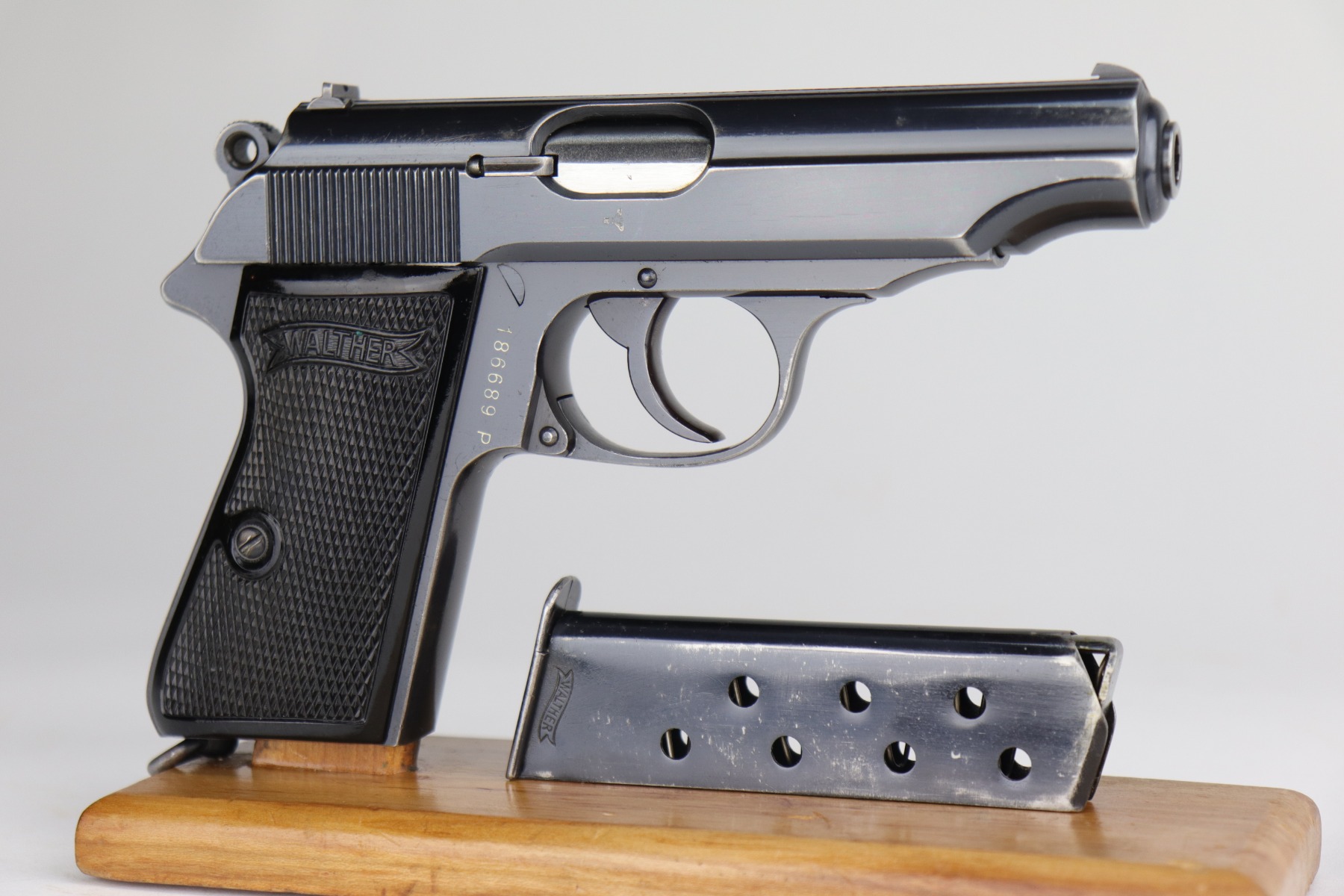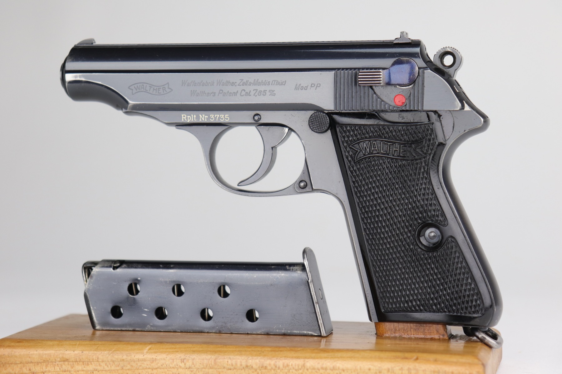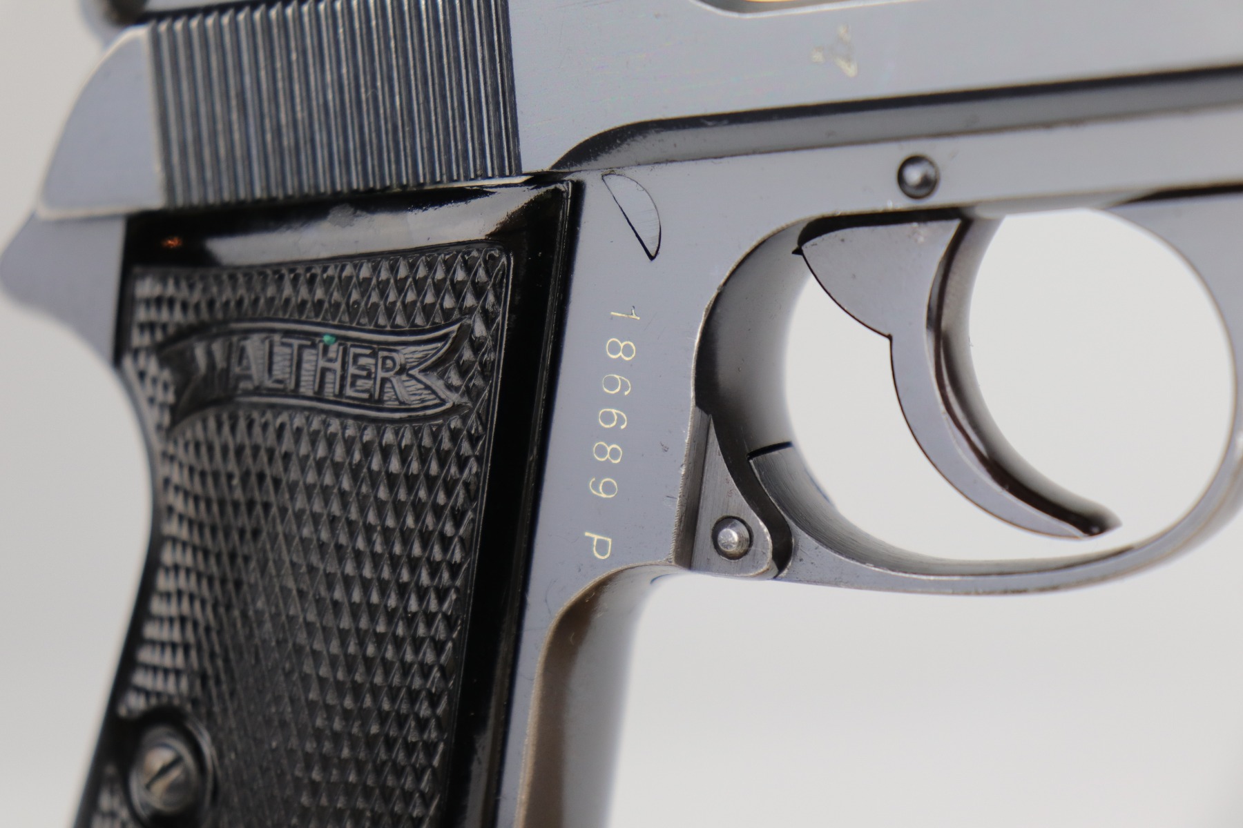 10/30/20 – This is a very nice example of a Walther PP that was order by the Danish Police from the Walther factory in 1940. This is evidence by the Danish Police unit marking on the left side of the frame “Rplt. Nr. 3735” (done at the Walther factory) and the lanyard ring on the butt of the frame. These were ordered directly from the factory. This one is in exceptional condition for this variation as most were later reworked. This one is completely original and unaltered. This particular gun has retained about 90-92% of its original bluing. The fire blue on the safety lever is almost completely in tact. The profile views are excellent – most of the wear is on the straps. There is minor muzzle wear, wear on the high edges of the slide, and some light scratching along the peak edge of the right side of the slide. Light pin-pricking on both straps. There is one spot of discoloration on the underside of the trigger guard and a small area of oxidation on the underside of the slide. Comes with excellent Walther grips and a proper Walther banner magazine. The bore is near-mint.