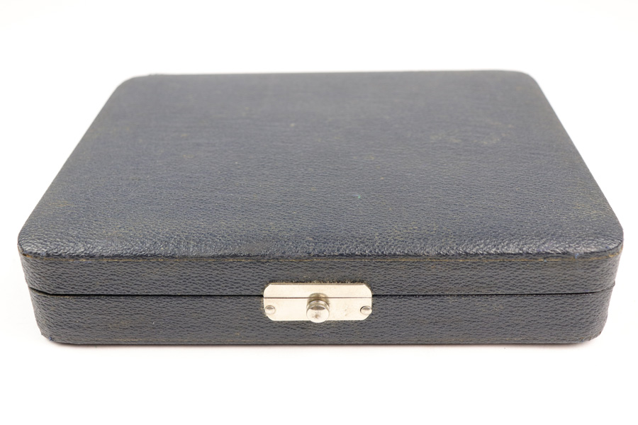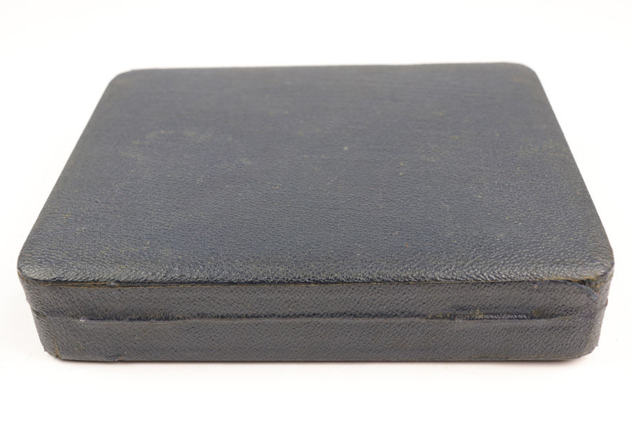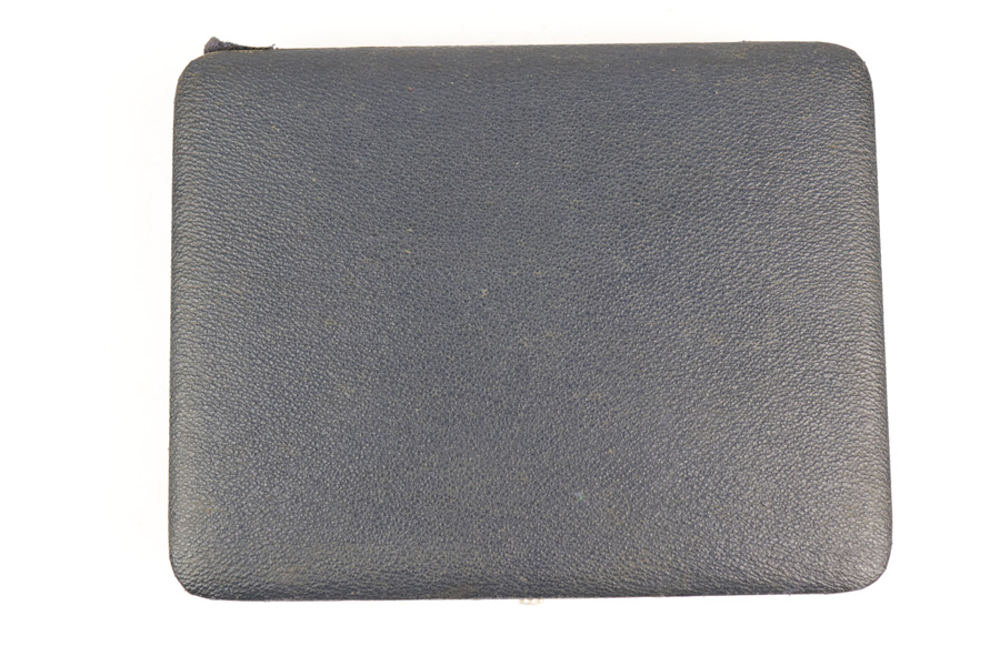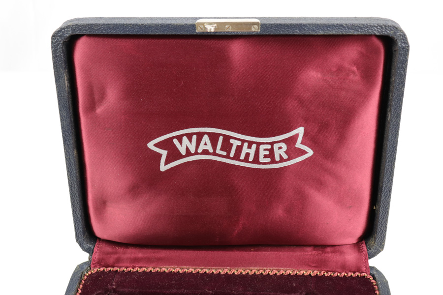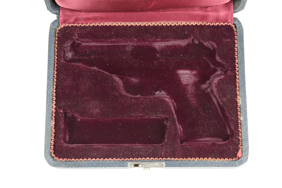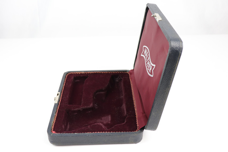 11/28/18 – This is an original Walther PP pistol presentation case from the 1960s. The case has excellent stretched blue leather exterior with minimal wear. The interior is clean and lacks the typical “sand leak” which comes from the interior lid foam leaking through the red liner. The foam on the interior is broken down and settled mostly at the bottom of the lid when opened, but does not leak out. The interior is clean with no issues. Guaranteed original and authentic.