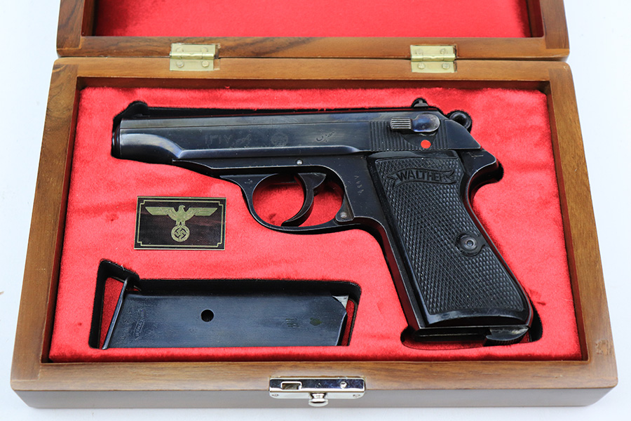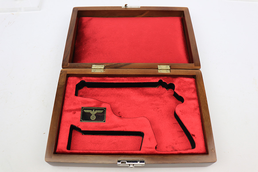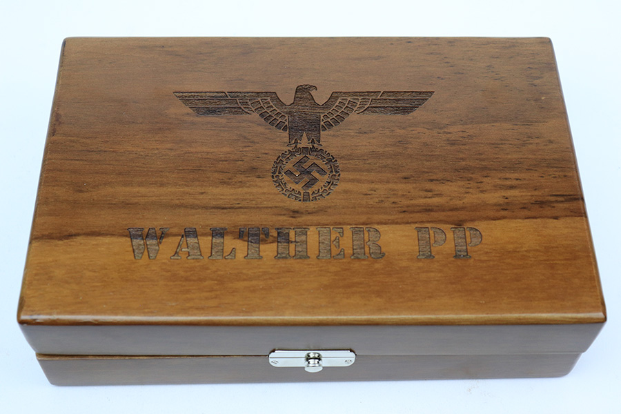 4/26/22 – This handmade wooden box is a great display or storage solution for Walther PP’s. The top is laser etched and the interior is cushioned with red felt. The box fits a Walther PP and has an additional slot to store an additional magazine or the single magazine separately. The pictured magazine does not have a finger extension but the case will easily fit one in the magazine slot and the gun slot if inside the firearm. Note: the pictured firearm is not included with the case.