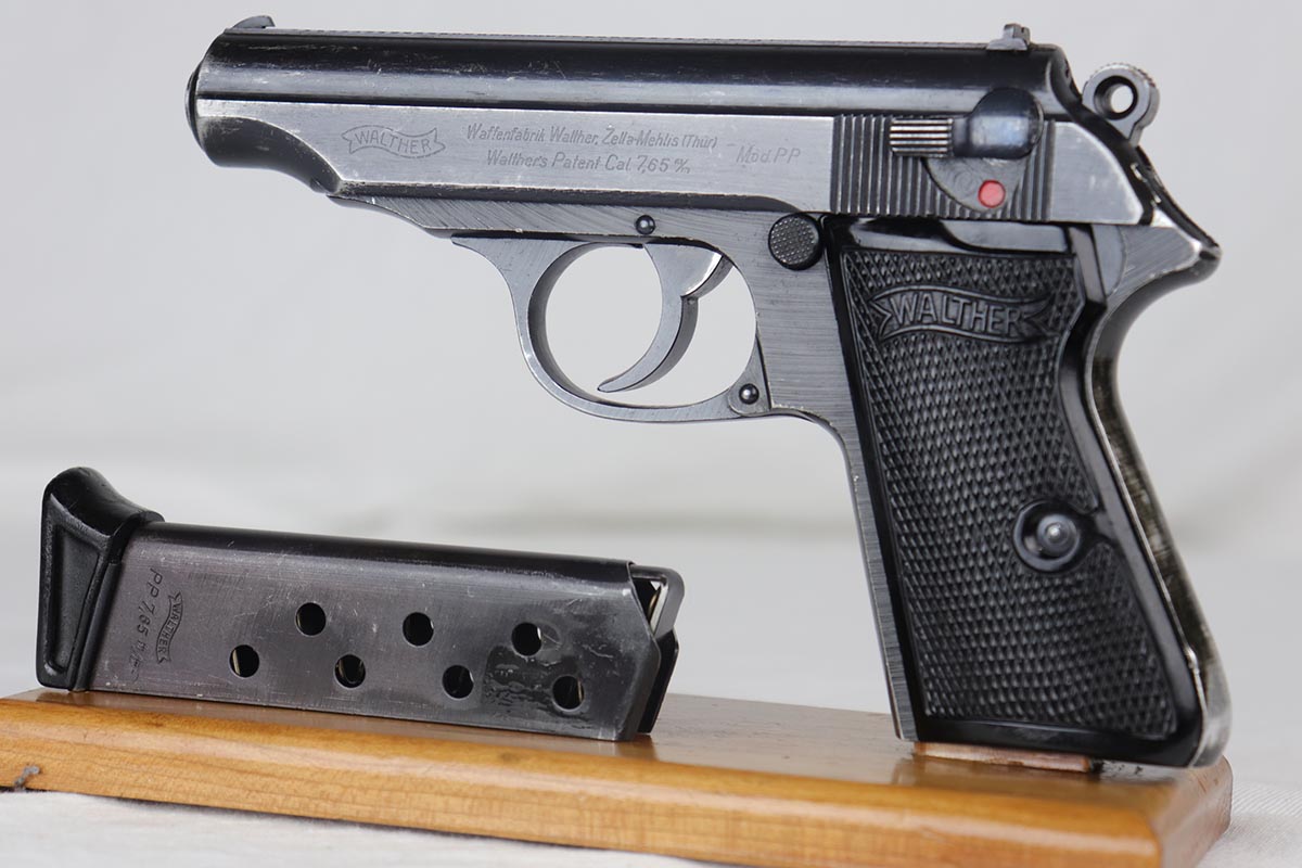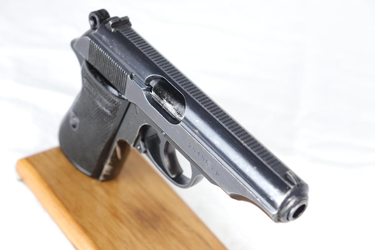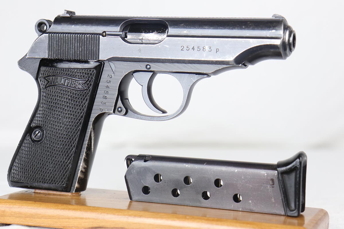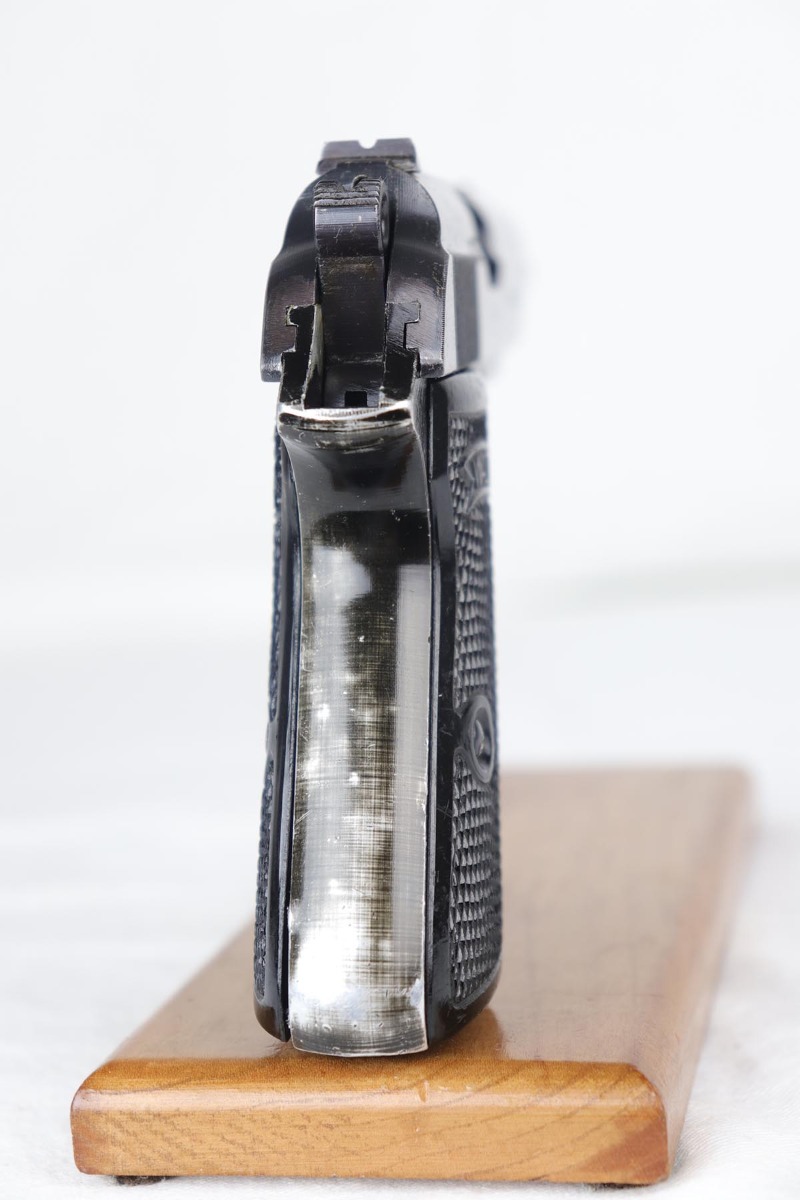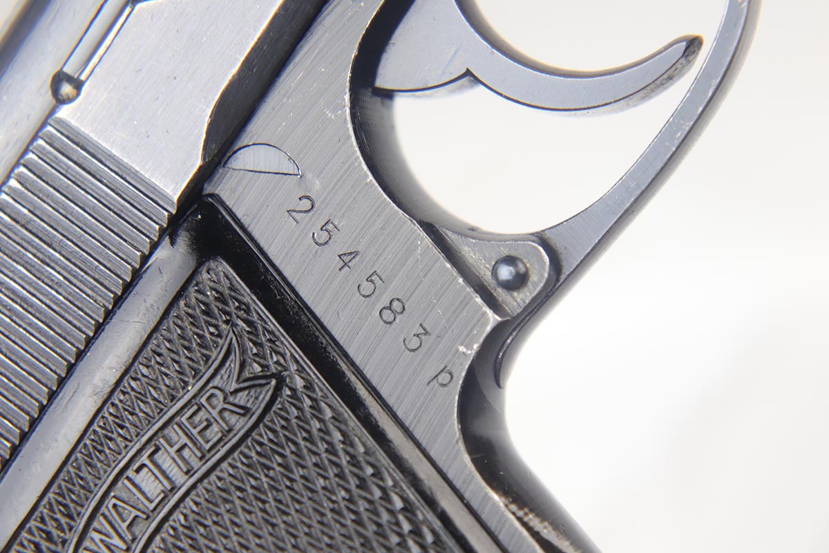 4/18/19 – This is an original WW2 Walther PP with lightweight duraluminum frame. Manufactured in 1942 with all matching numbers. Original finish rates at about 85-90% with most finish loss on the straps. This is common as the finish on duraluminum frames seems to wear more easily. There’s also some muzzle wear and edge wear on the slide. Nice grips with minor scuffs and dings but no major cracks or chips. Finger extension magazine has a couple surface scratches, but overall is in great condition. Bore is minty with strong rifling. All original and fully functional.