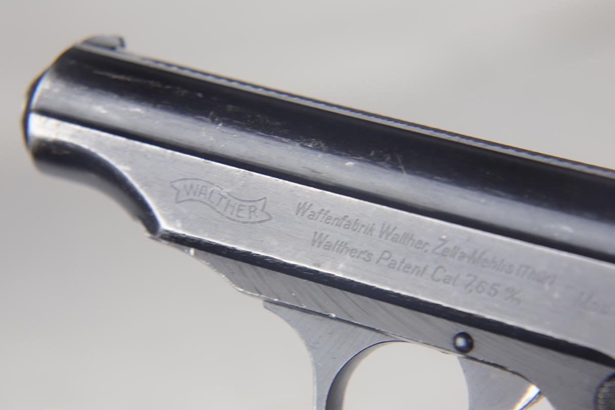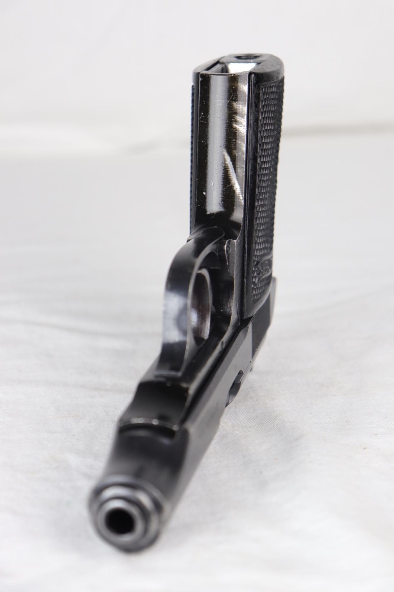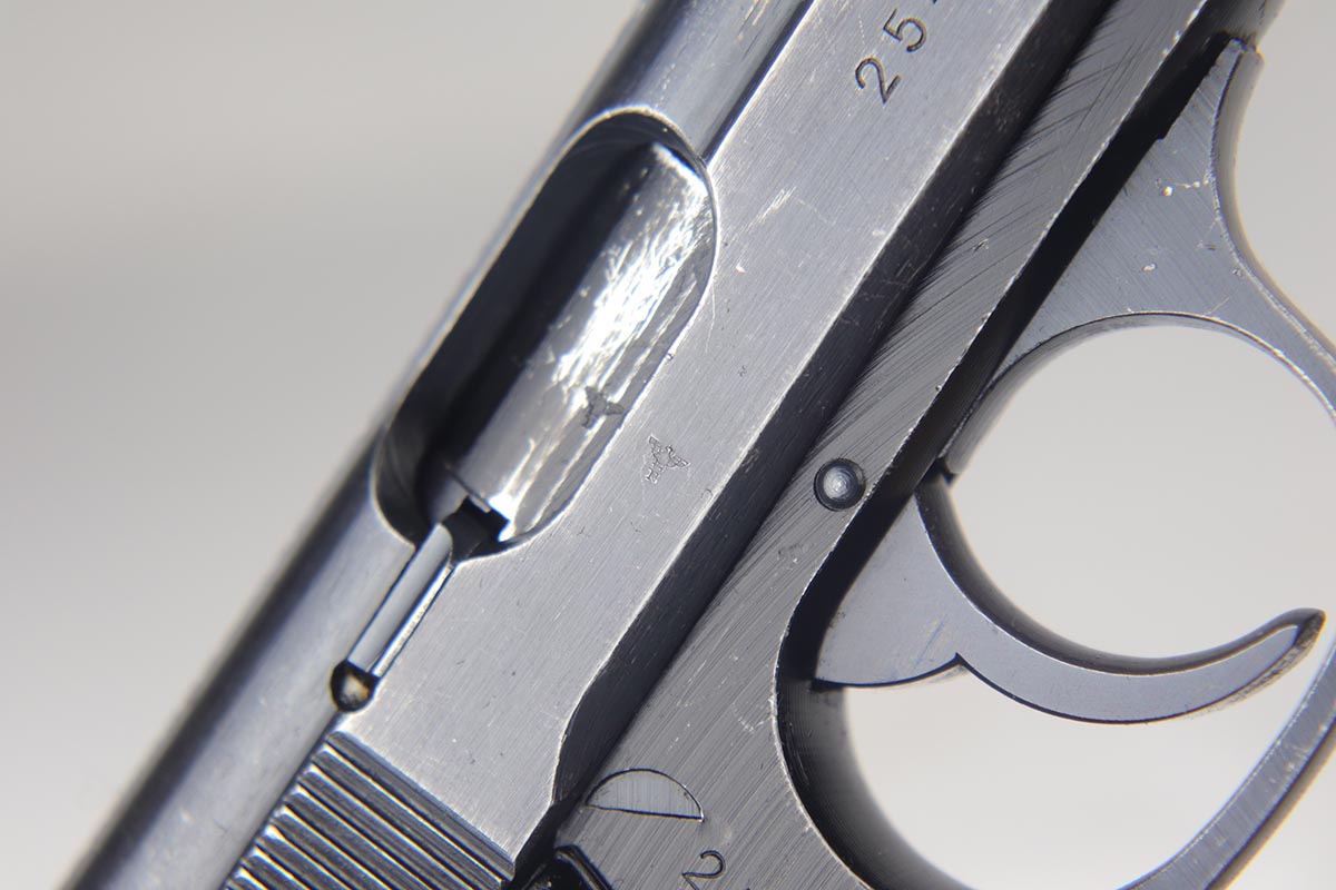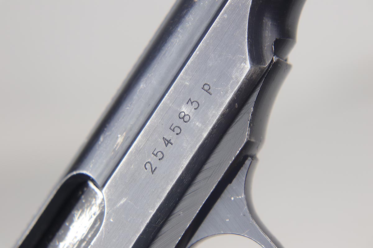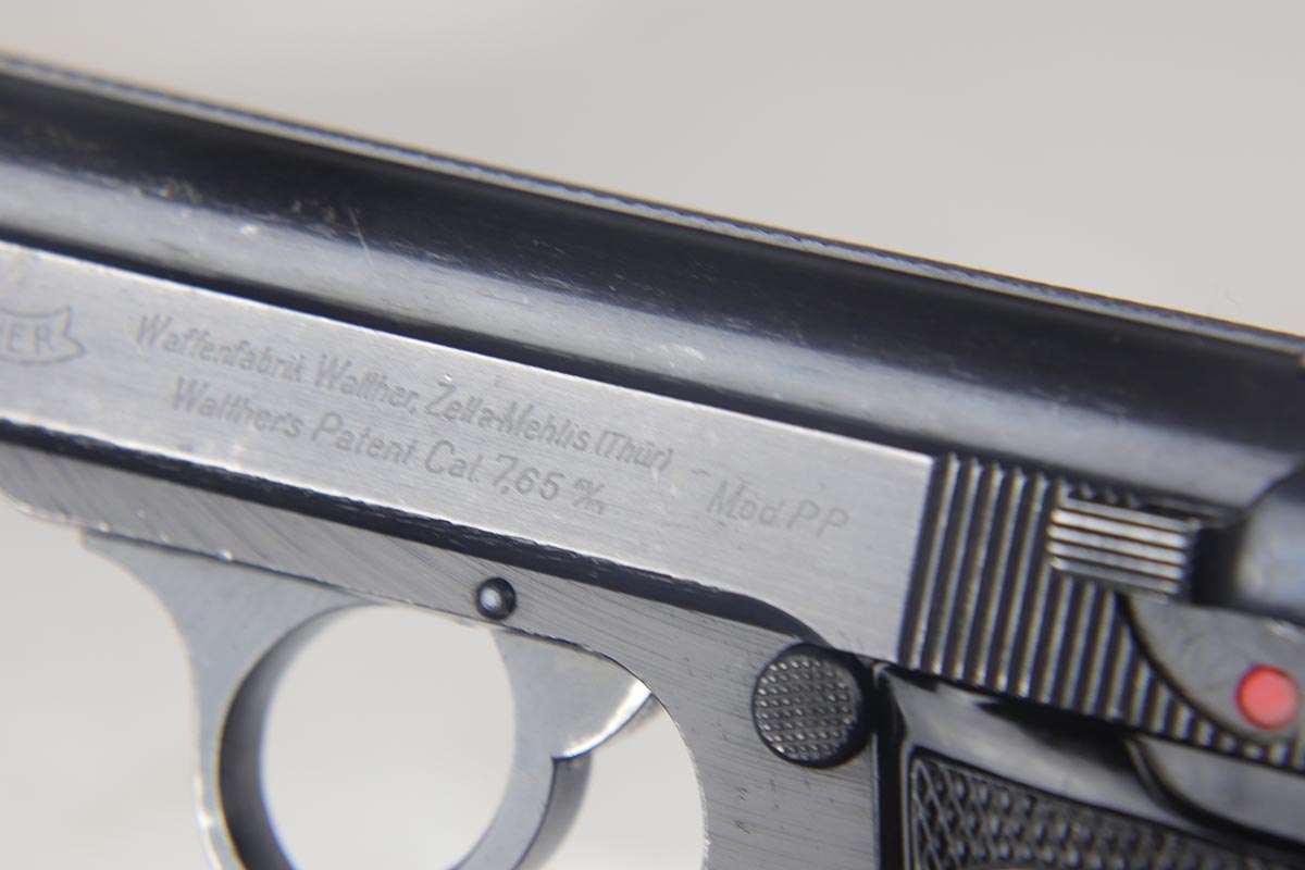 4/18/19 – This is an original WW2 Walther PP with lightweight duraluminum frame. Manufactured in 1942 with all matching numbers. Original finish rates at about 85-90% with most finish loss on the straps. This is common as the finish on duraluminum frames seems to wear more easily. There’s also some muzzle wear and edge wear on the slide. Nice grips with minor scuffs and dings but no major cracks or chips. Finger extension magazine has a couple surface scratches, but overall is in great condition. Bore is minty with strong rifling. All original and fully functional.