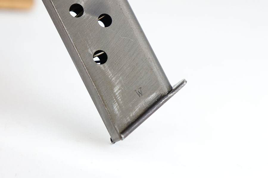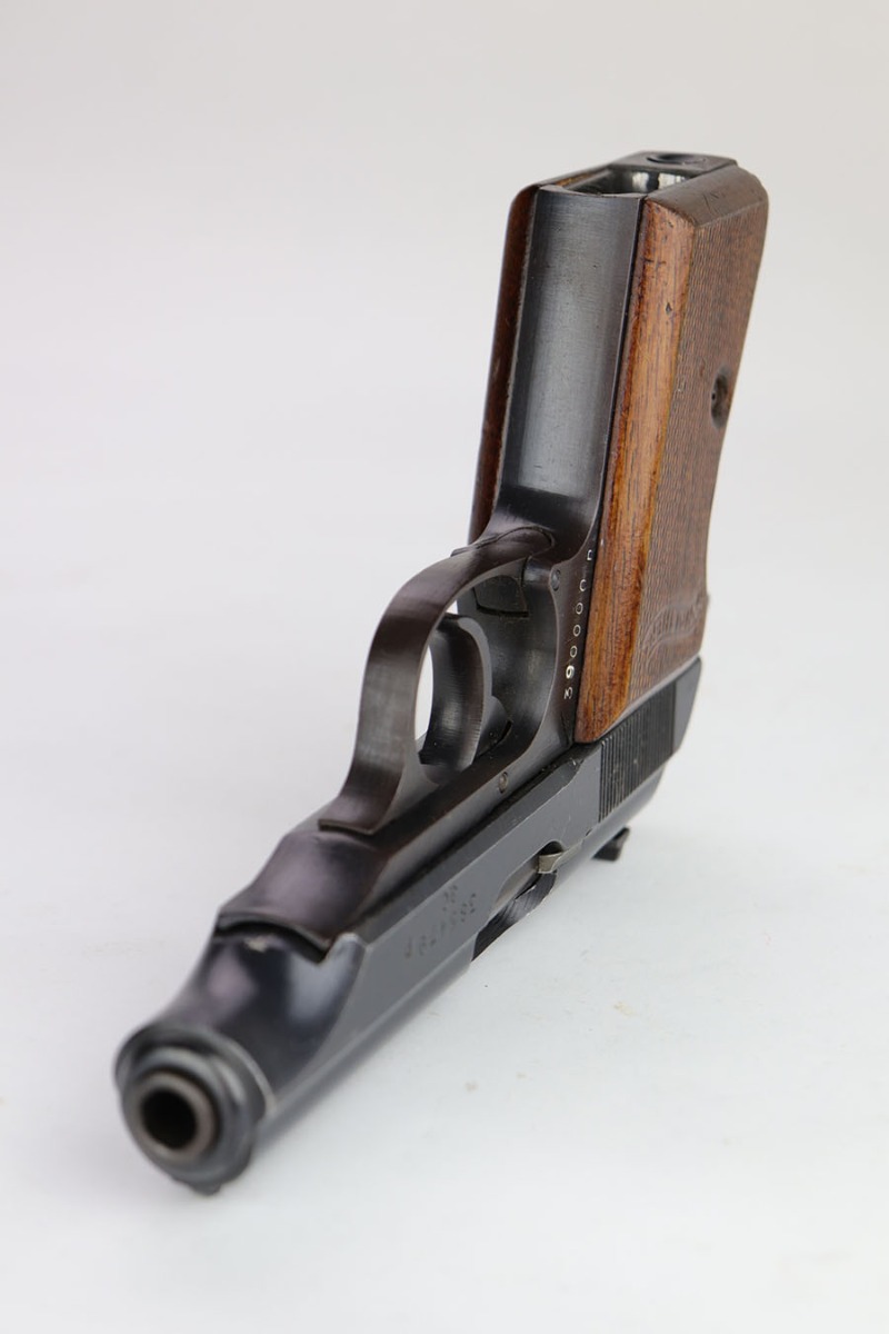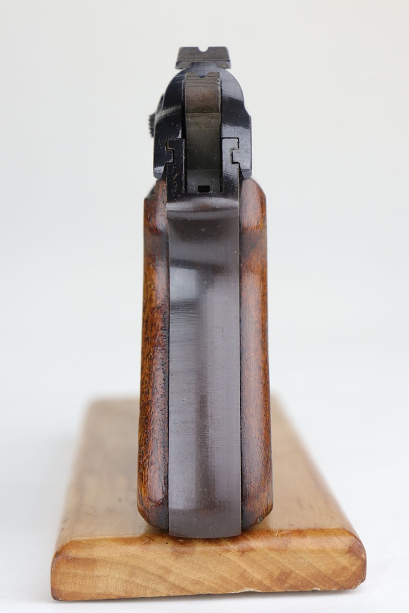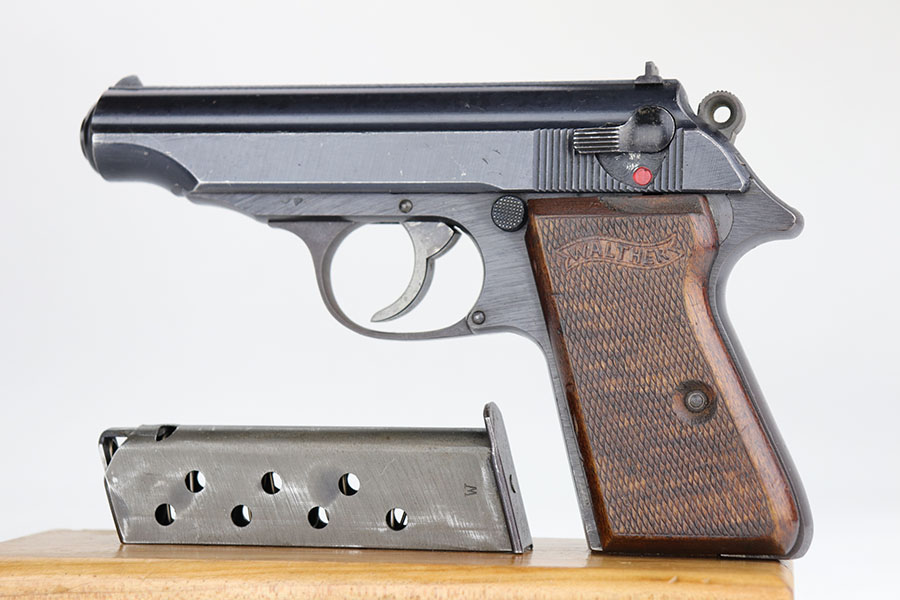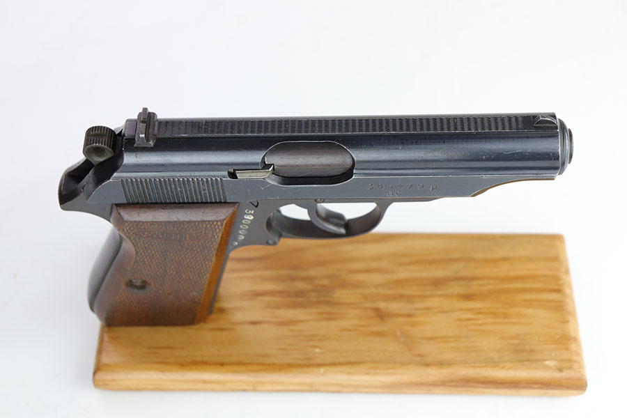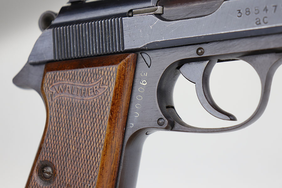 4/16/20 – This is a near-mint example of a very late Walther PP variation. Produced in 1945, this is a documented variant that is sometimes referred to as a ‘GI mismatch’, as slide and frame are not matching. Left side of slide is blank and right side will have ‘ac’ proof under the serial. This one shows very little bluing loss, and just a bit of patina to the frame. Terrific bore and wood grips. Minty magazine with ‘W’ proof.