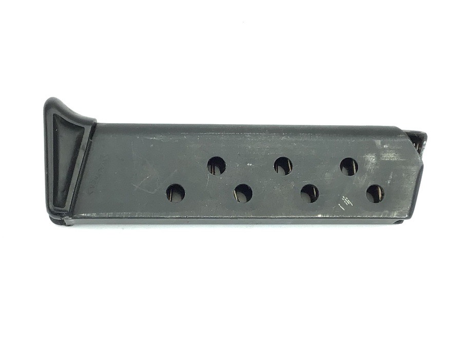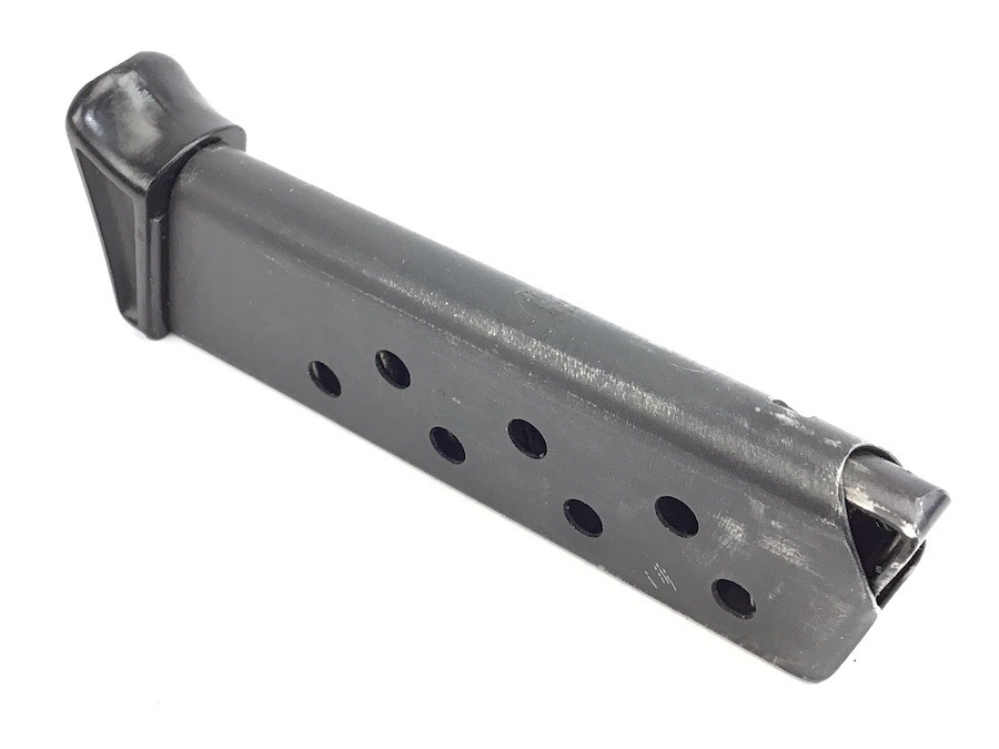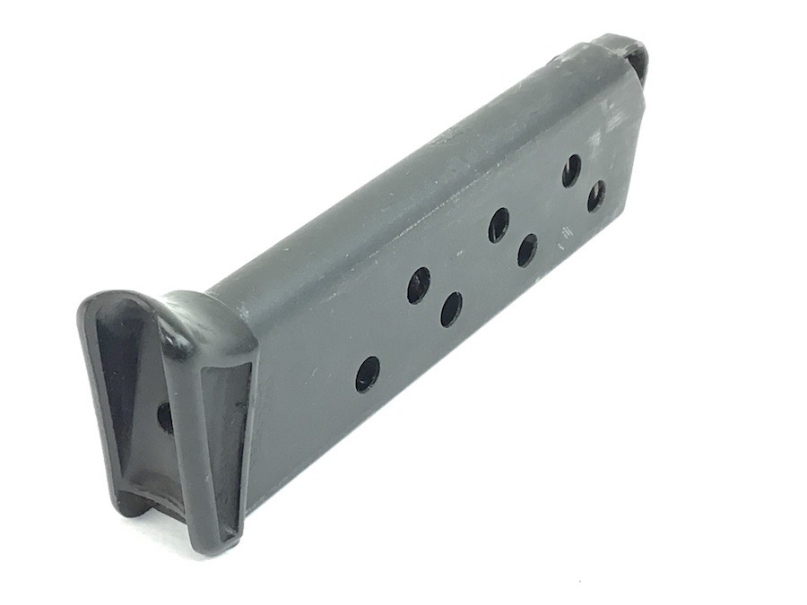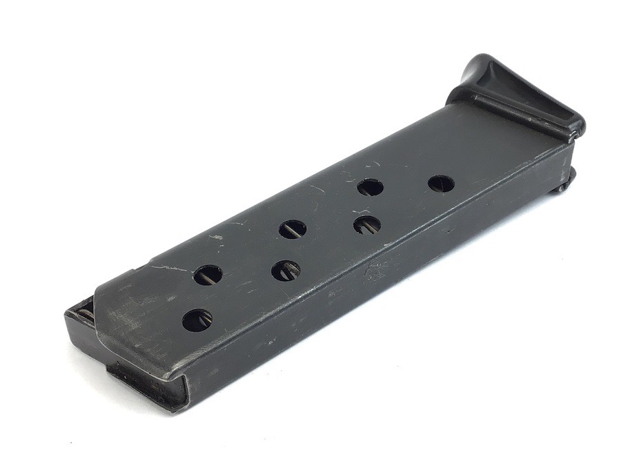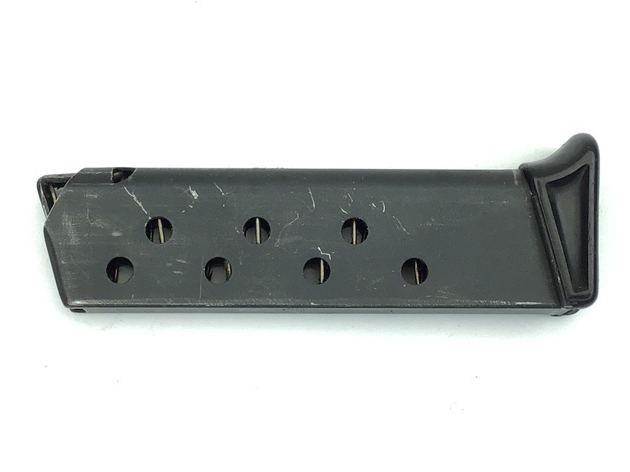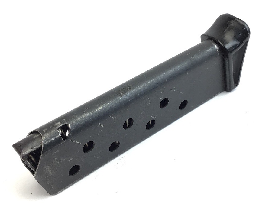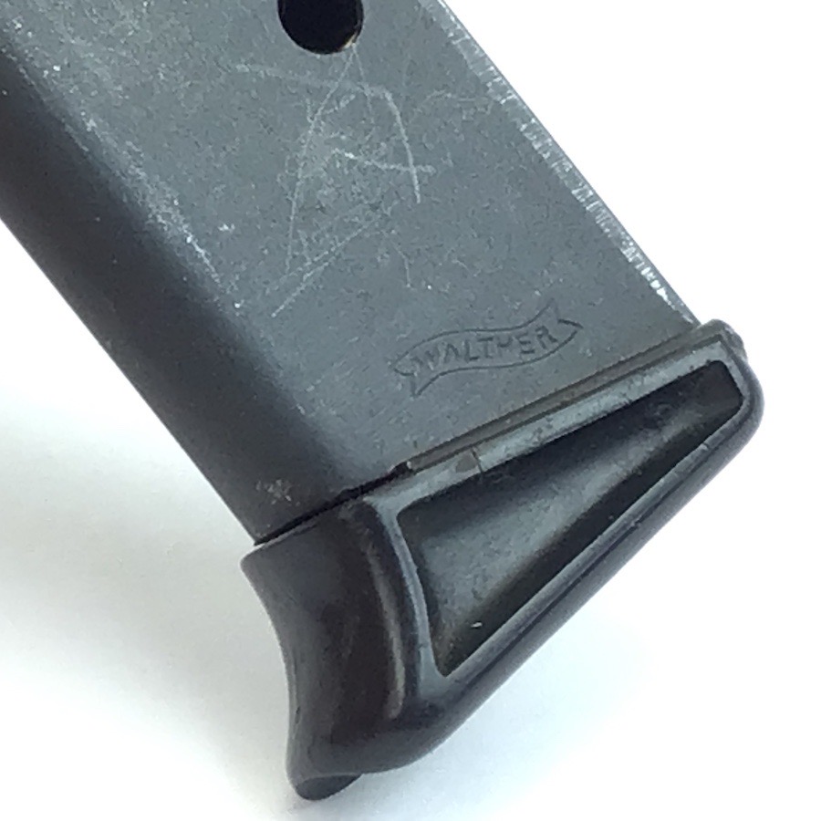 8/2/23 – Original and excellent condition. Pre WWII, Walther PPK, finger extension magazine. The black base is the thin lip style. No cracks. Magazine tube has the banner only stamp. Smooth, strong spring.