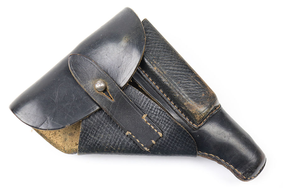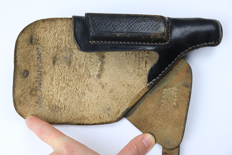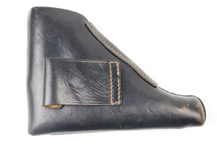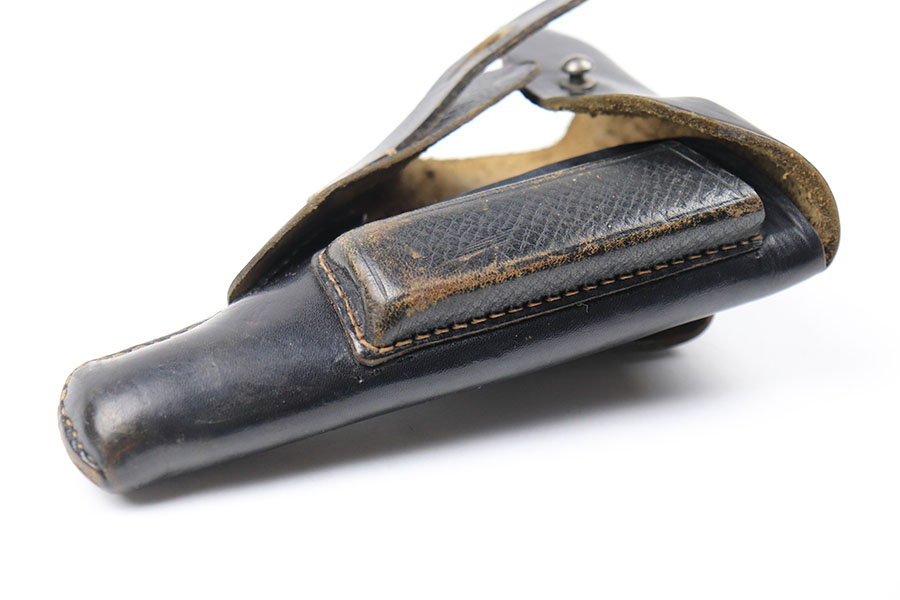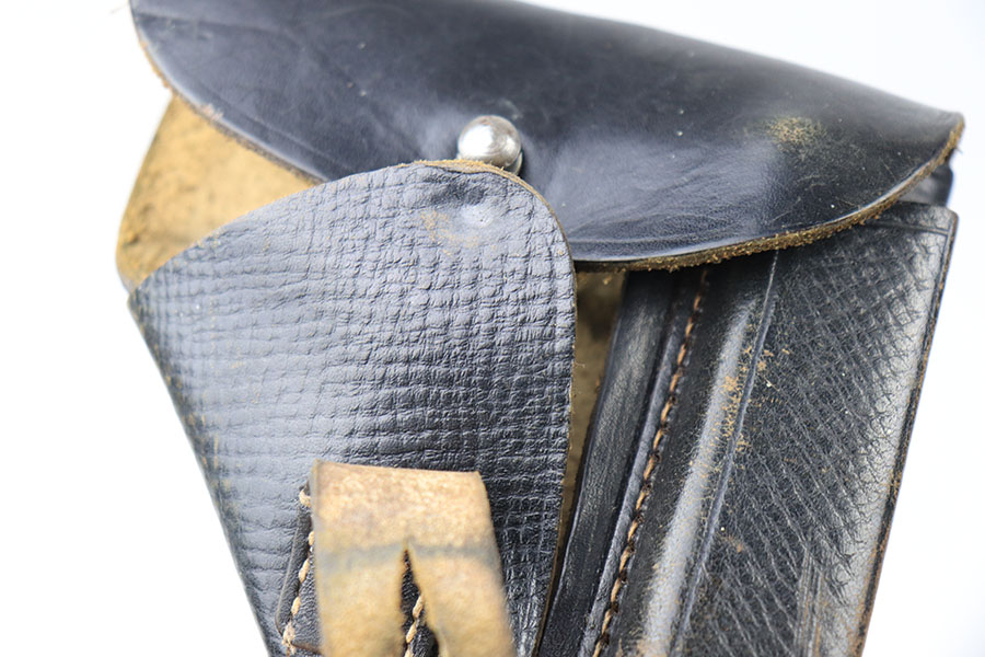 8/6/21 – This is an original WW2 era Walther PP Holster from WW2. The holster is in great condition and has very nice black leather and all original stitching in tact. The holster appears to be similar style to an AKAH holster, but surprisingly doesn’t have any maker markings or stamps. There’s a name written in ink on the interior leather, but this is too hard to decipher due to aging. A great condition collectible holster.