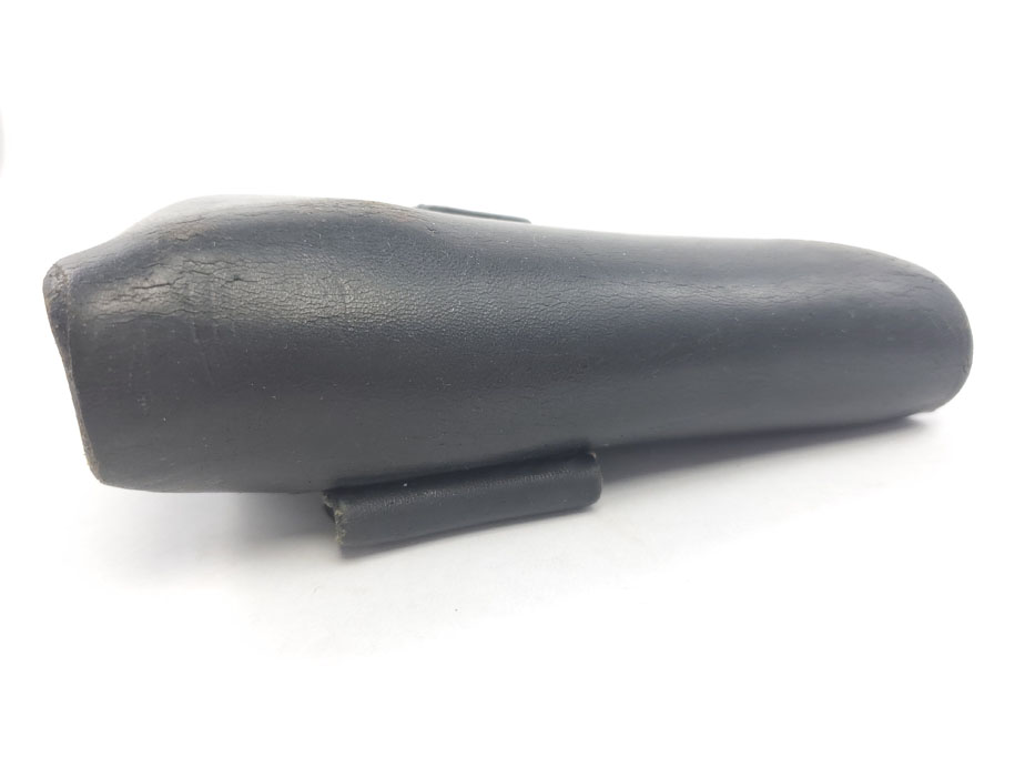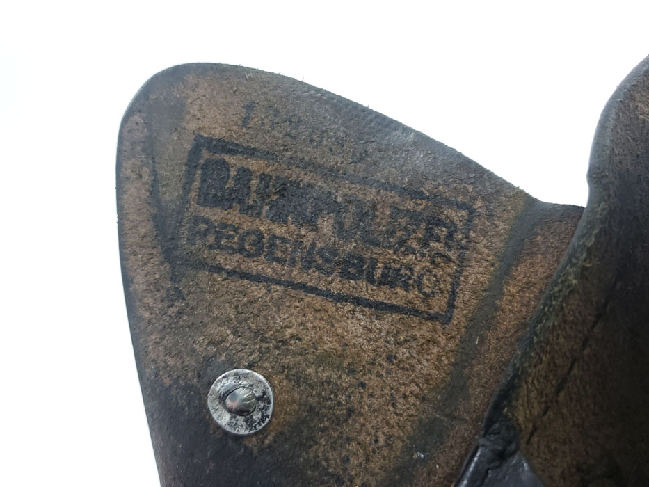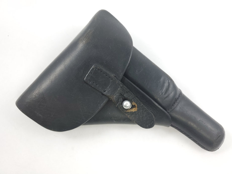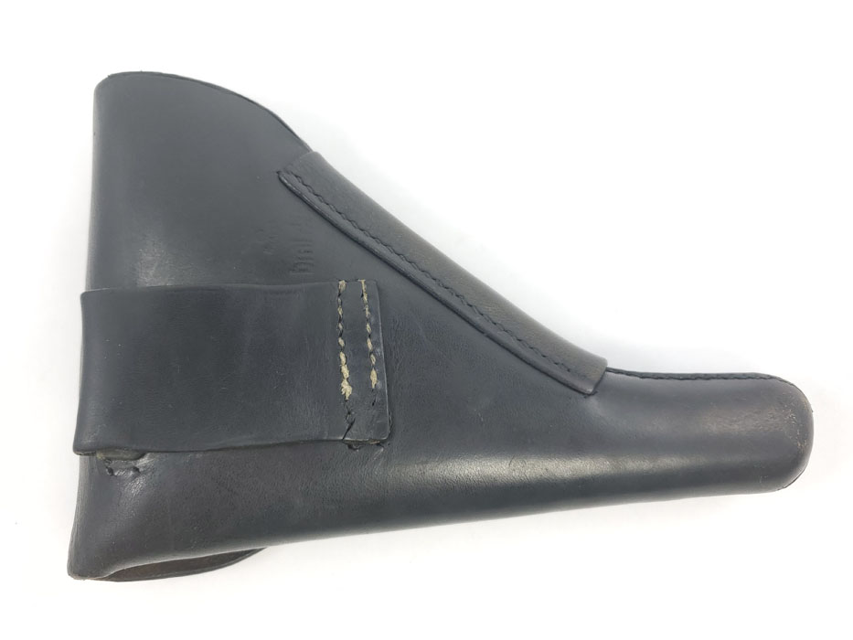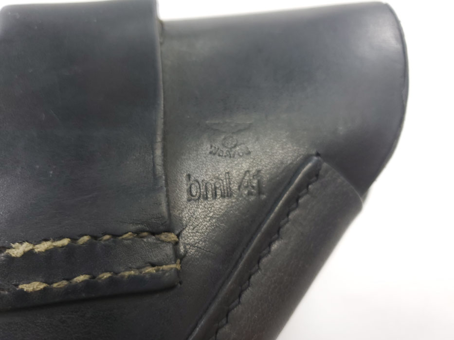 5/5/20 – This is a very unusual and unique Walther PP holster, or rather a FN Browning 1922 holster that was likely used by the Railway Police with a Walther PP. The holster is fashioned for a model 1922 with the longer toe, but the interior ink stamps indicate RBD (see photos). Also, faintly stamped on the interior leather is a PP serial number “132085” (or 132065). Also another PP serial number is hand-written inside “132728”. Our guess is this holster was original intended for a model 1922, but ended up in the hands of a railway police worker who stamped the interior himself. The back of the holster is 1941 dated, bml maker stamped, and waffen proofed. The condition is fair with the belt loop stitching likely being replacement (notice it’s a different color than the other black stitching). Priced accordingly.