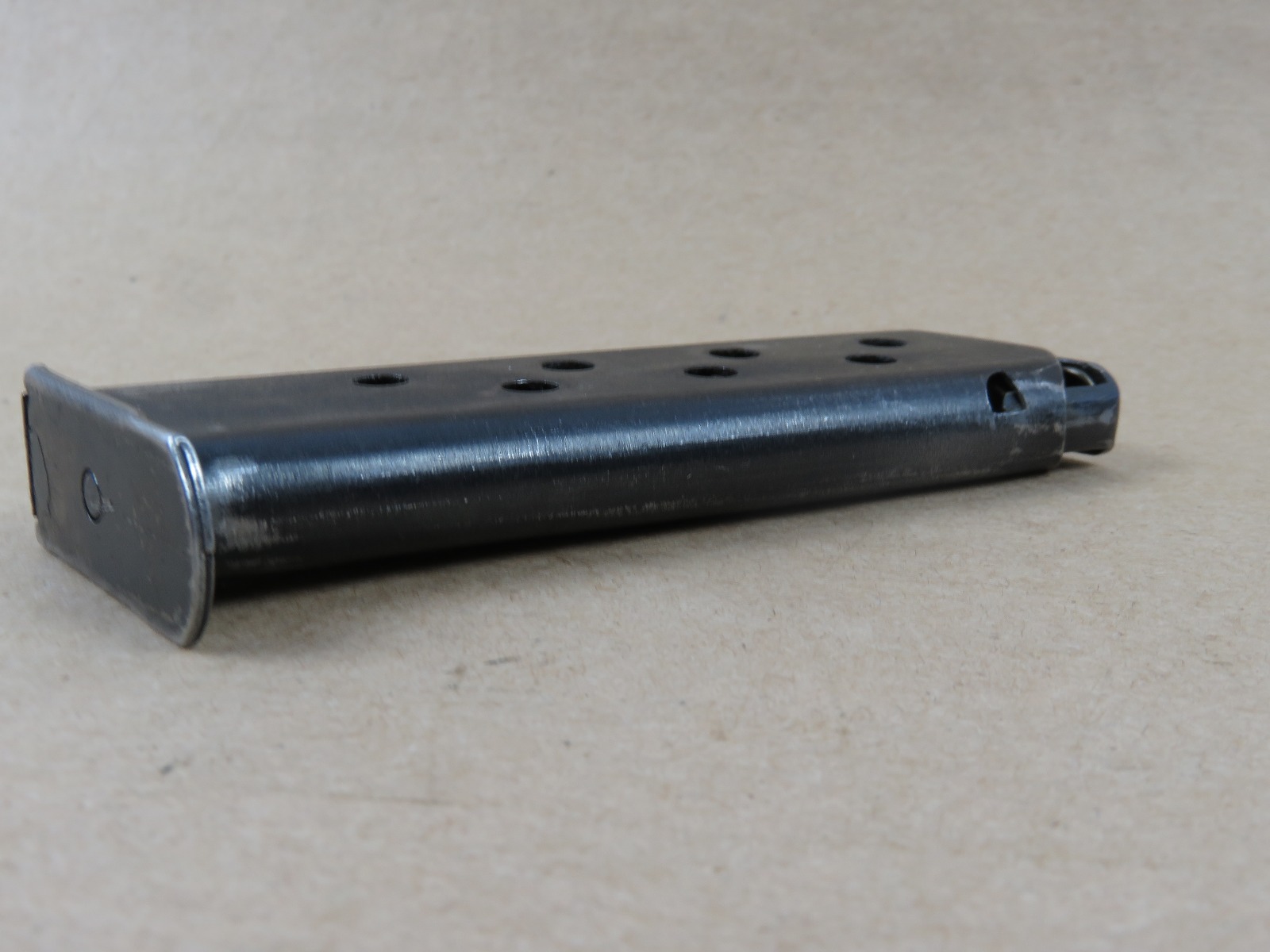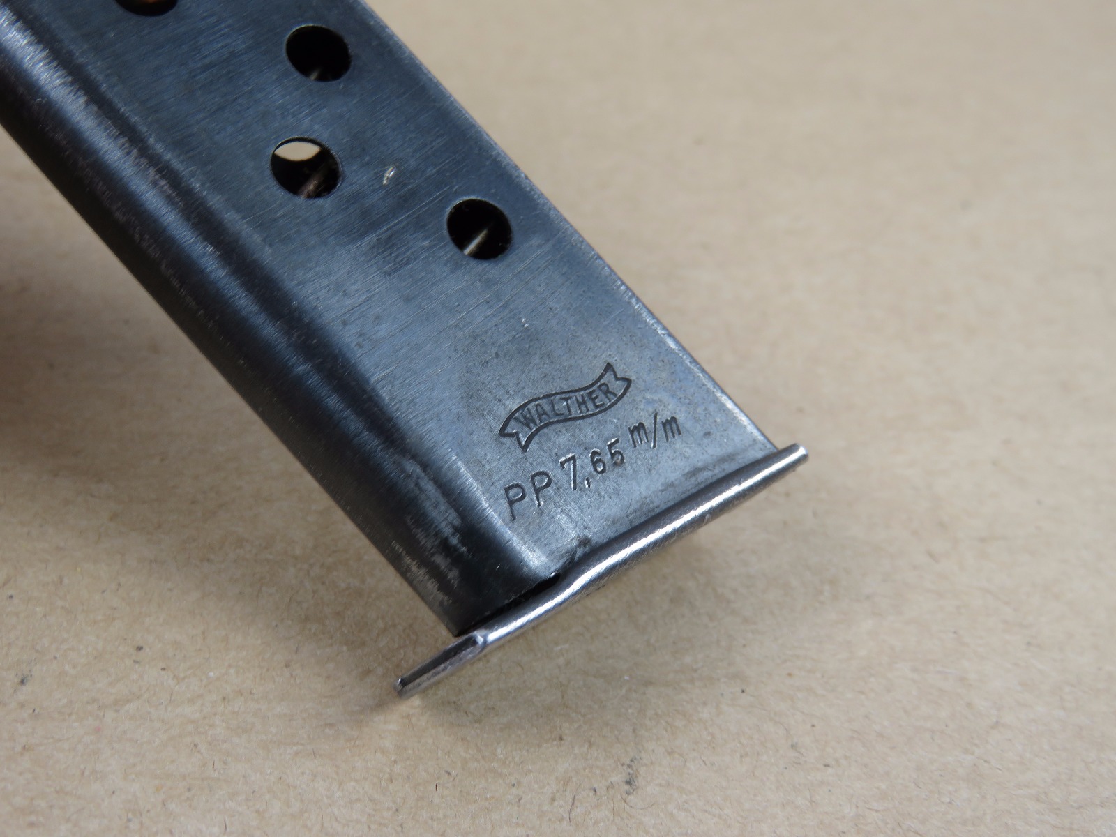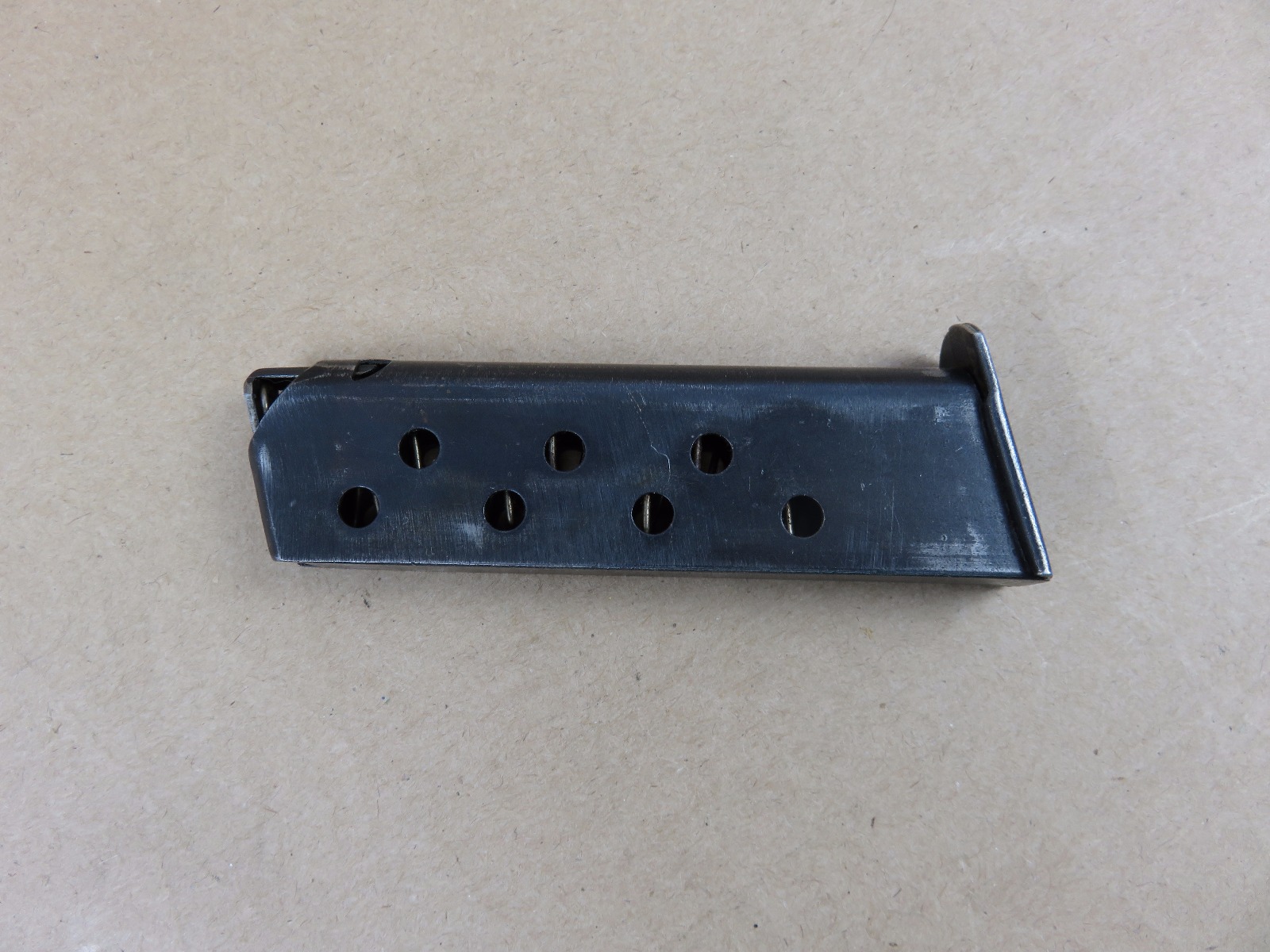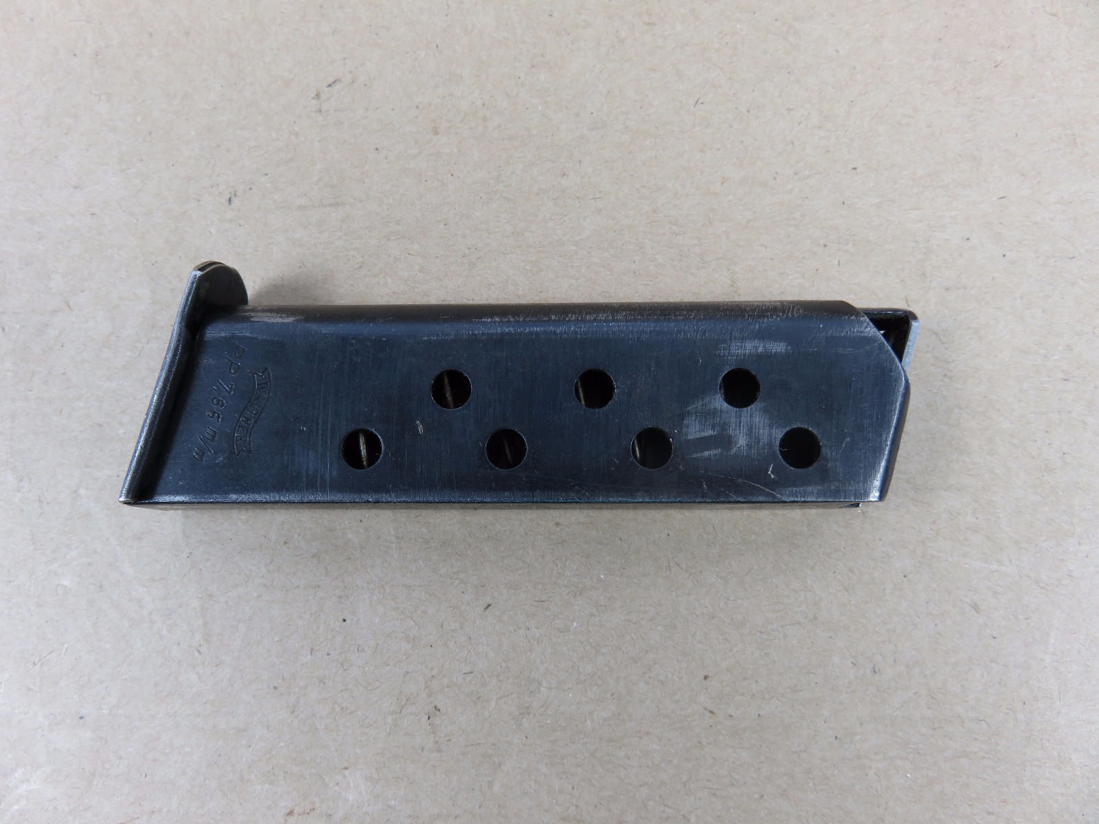 6/14/17 – This is an original WW2 wartime production Walther PP magazine. The magazine has no rust or pitting, but there is some normal use wear and bluing loss. The magazine spring is strong and fully functional. Guaranteed original and authentic from WW2.