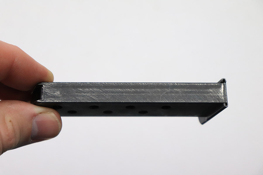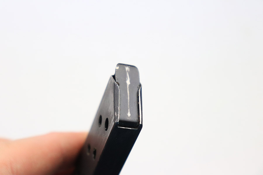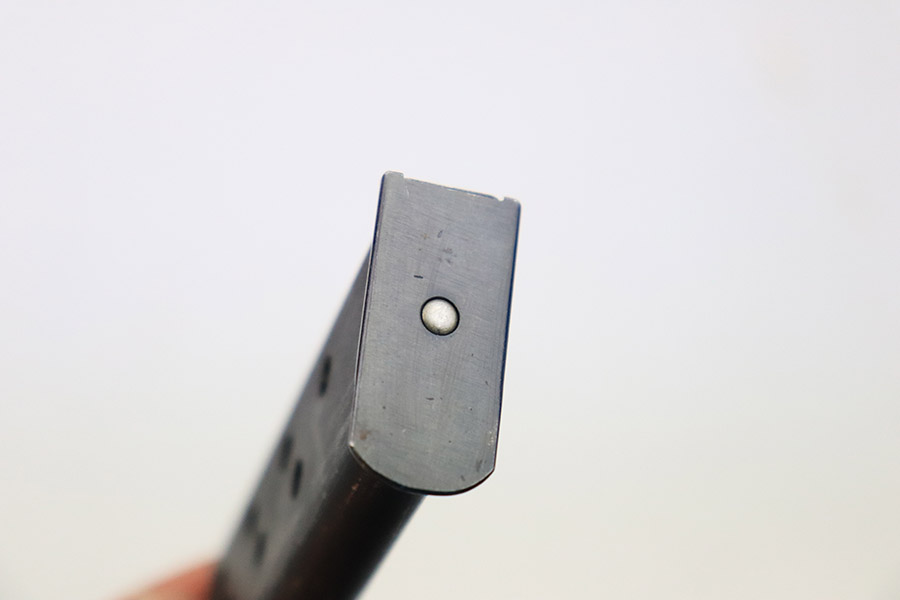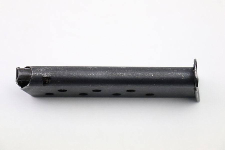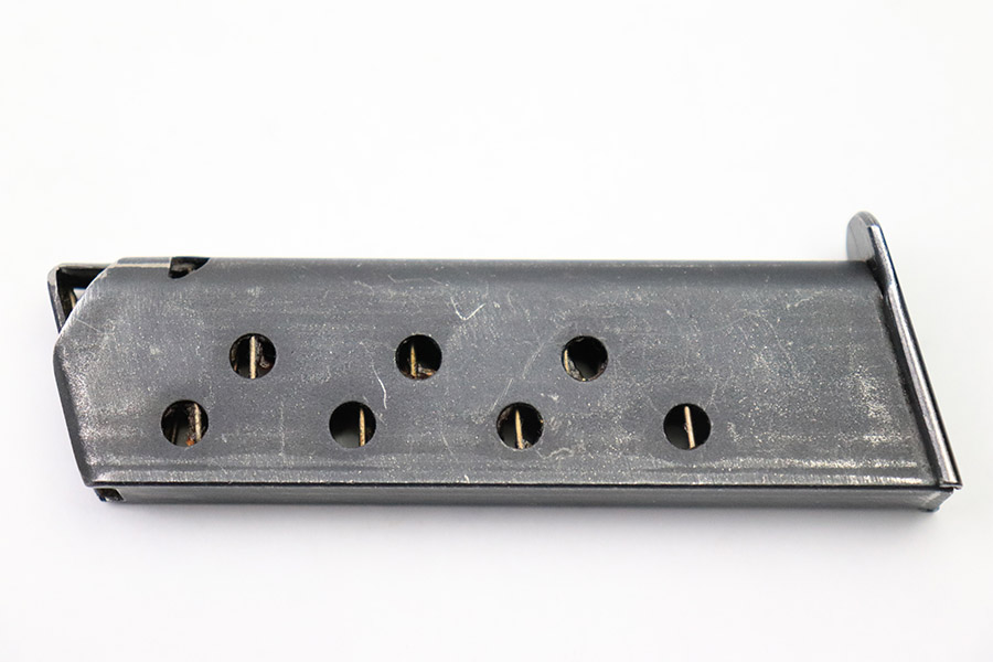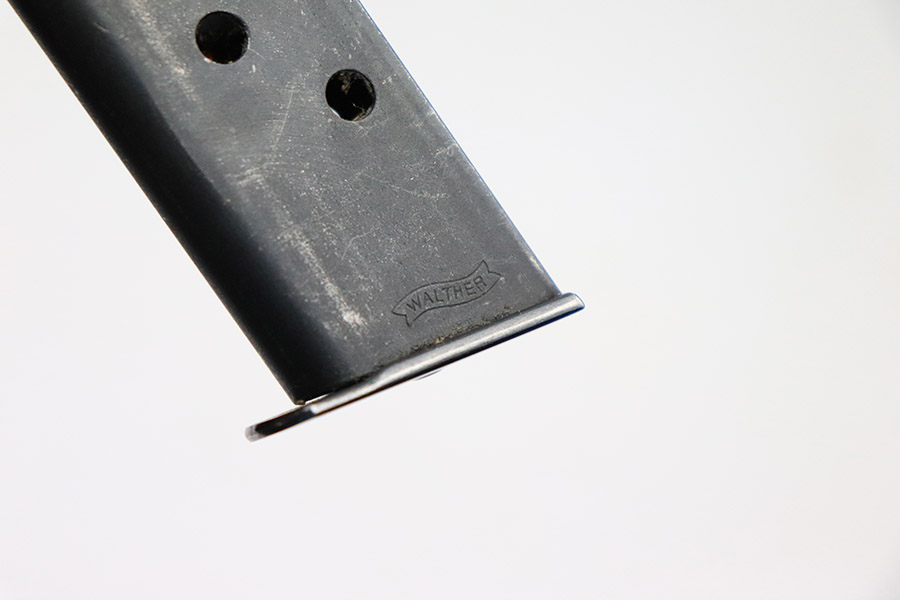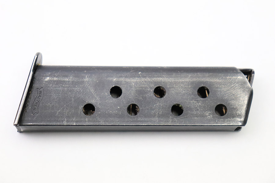 10/25/22 – This is a great example of an original Walther PP magazine from WW2. The left-hand side of the magazine tube features a Walther banner mark. The magazine has a high-polish blue finish flat bottom and a matte wartime blued tube. There is minimal finish loss throughout the magazine, but there is some typical use wear on the tube causing minor thinning/finish loss. The spring is strong and functional. No rust or pitting throughout.