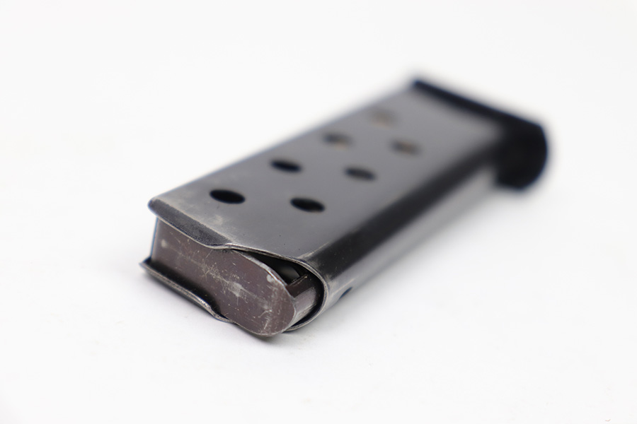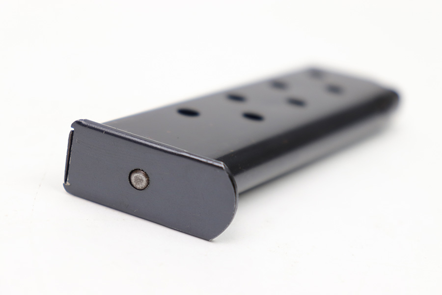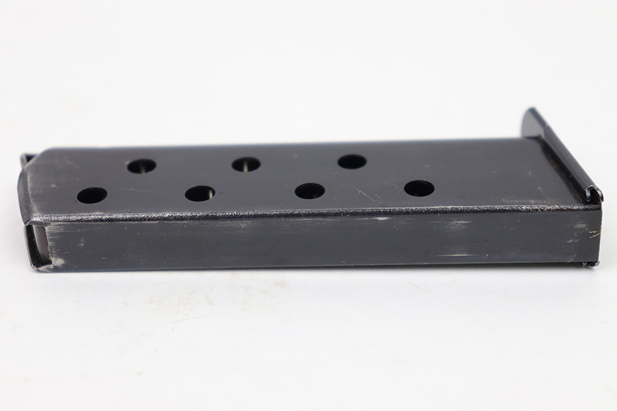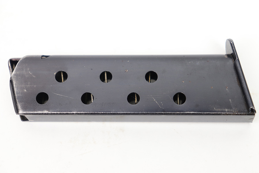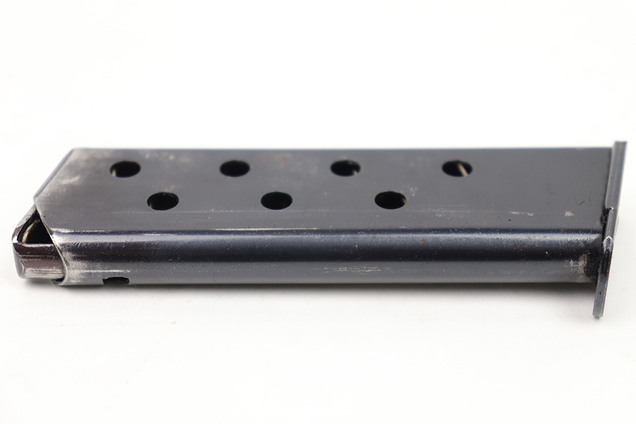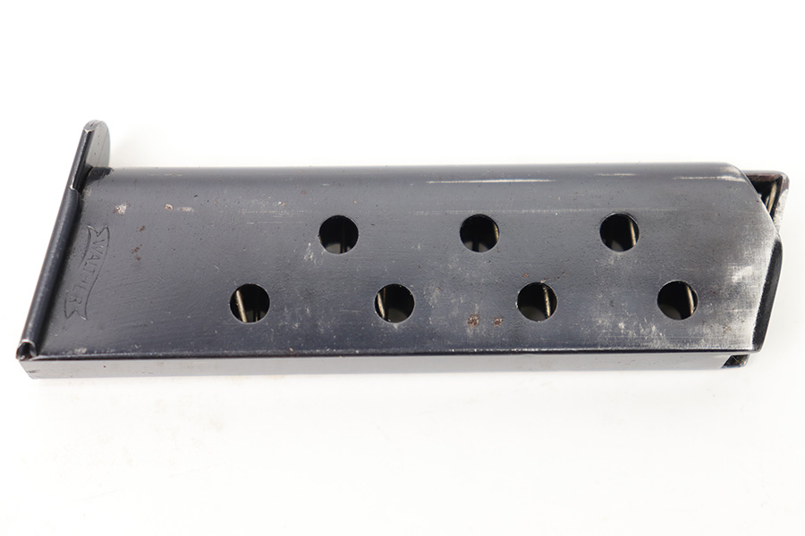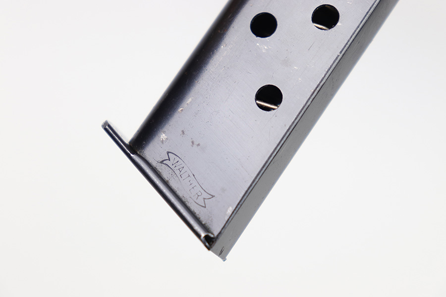 1/11/23 – This is an early / pre WW2 production Walther PP magazine in 7.65mm. The magazine is in excellent condition except for some small spots of surface patina and minor finish loss. We also noticed a very small hairline crack near the top of the feed lips. This doesn’t affect functionality as the magazine has a strong, functional spring.