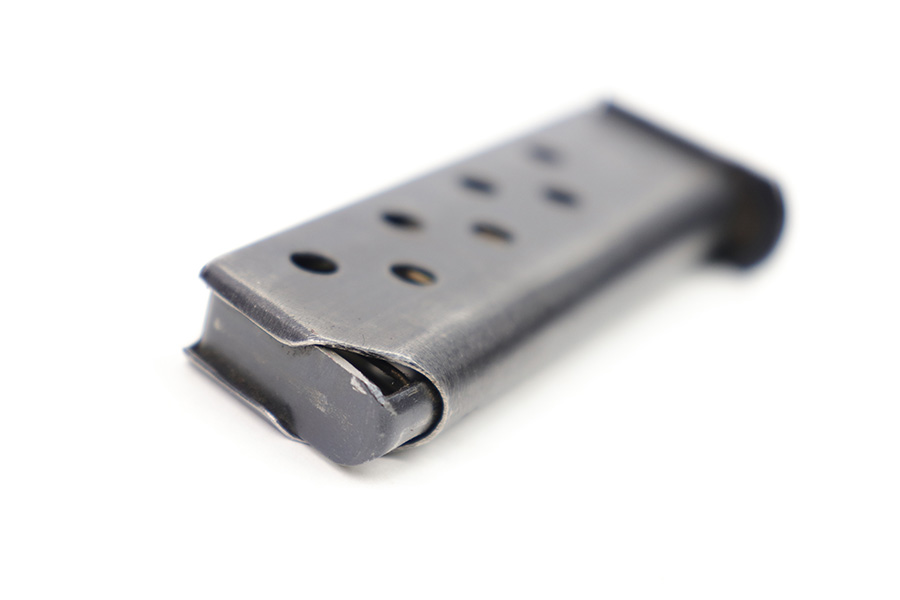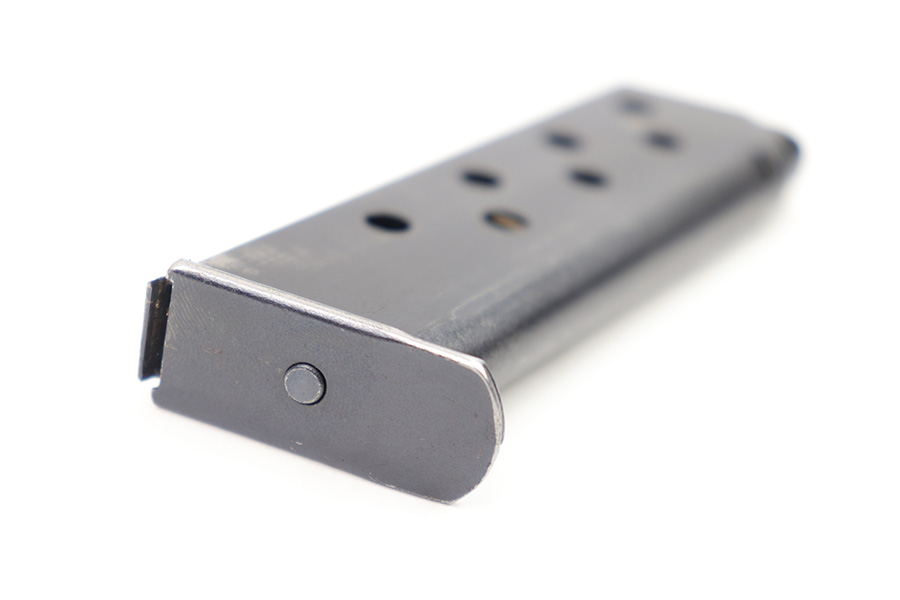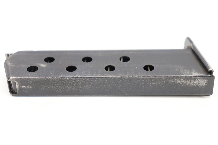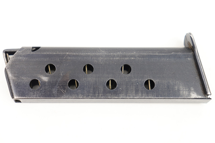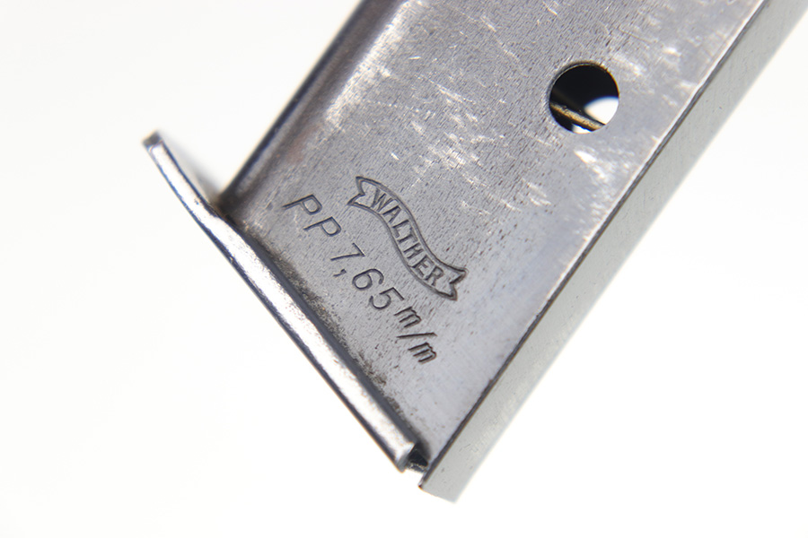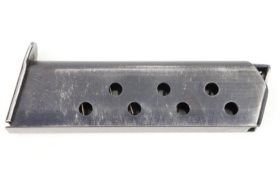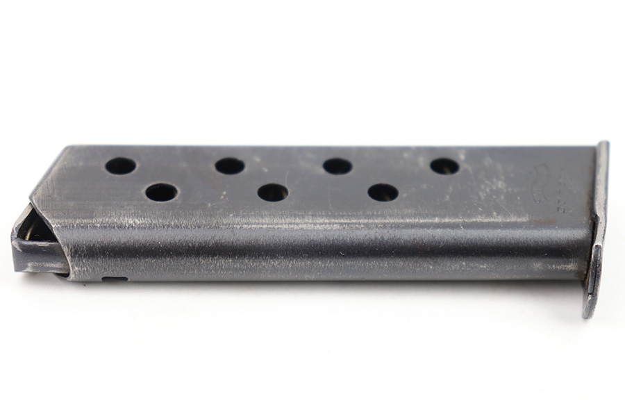 2/8/23 – This is an original WW2 wartime production Walther PP magazine. The magazine has a dull blued finish and caliber information stamped under the Walther banner on the left side. There’s mild finish loss and thinning throughout the tube, and the base is excellent. The spring is strong and fully functional.