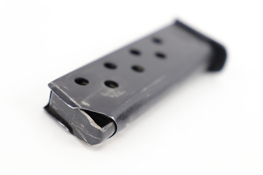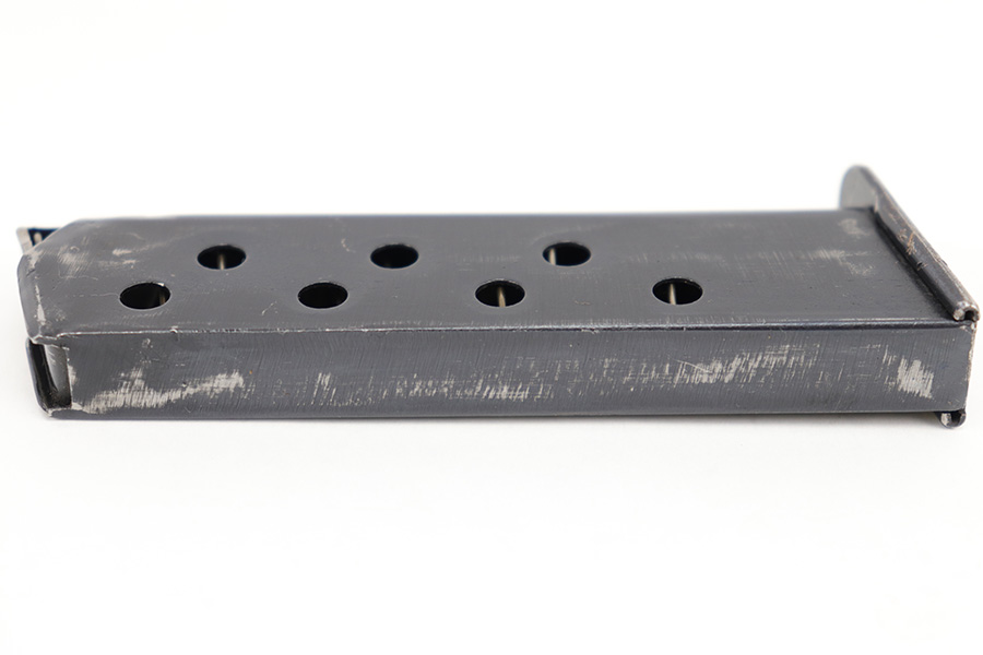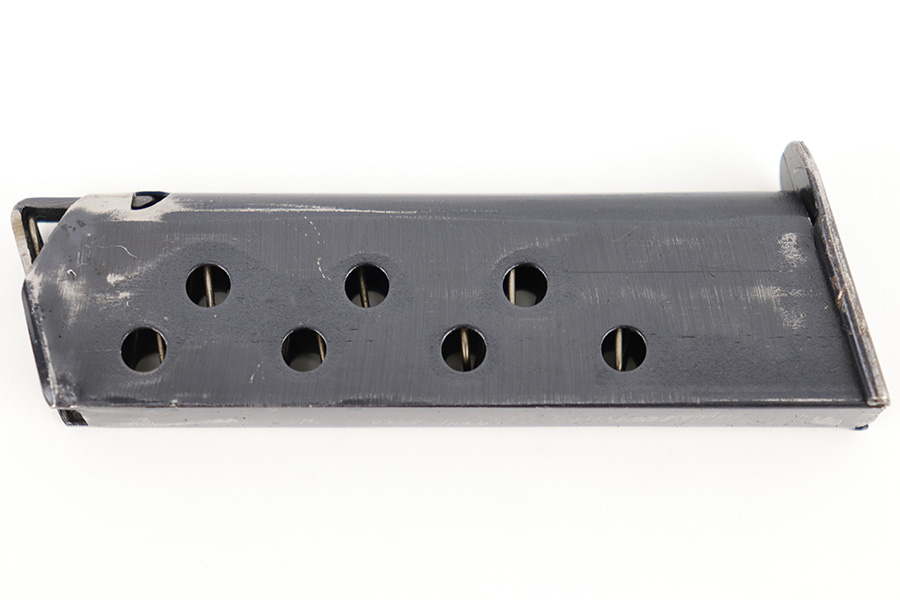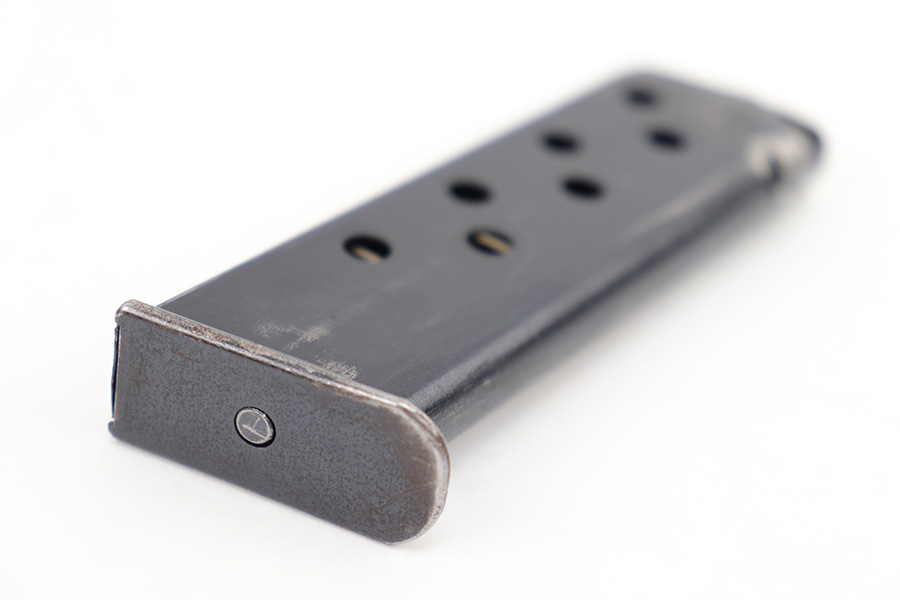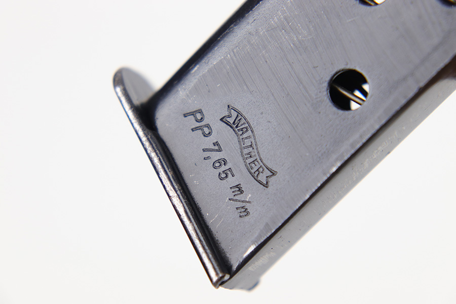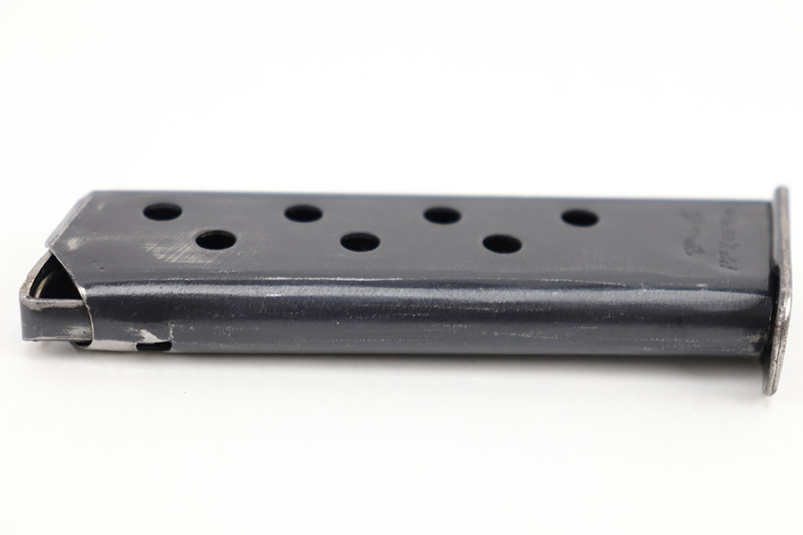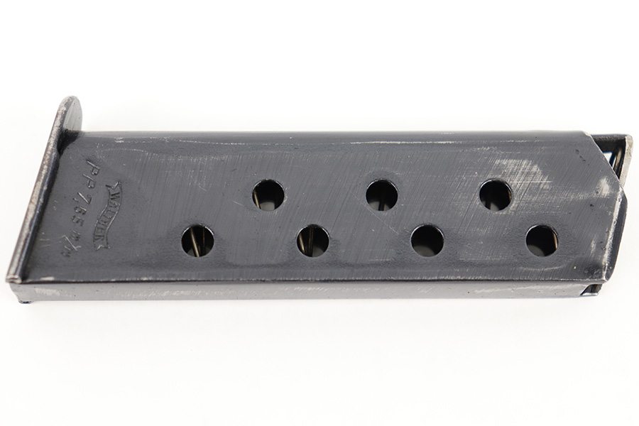 4/10/23 – This is an excellent condition WW2 production Walther PP magazine. Stamped with a Walther banner and caliber information on the left side of the tube, with no other markings. There’s some mild finish loss throughout the tube, and some light patina on the base plate. Strong, functional spring.