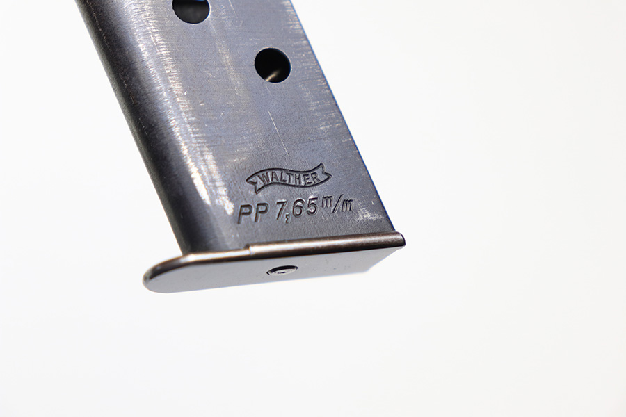 12/27/21 – This is a nice example of a Walther PP flat bottom magazine. The blued tube has retained most of its finish, showing minor signs of wear throughout. The left side of the tube features a Walther banner and caliber, indicating war-time production. The spring and follower are strong and functional.