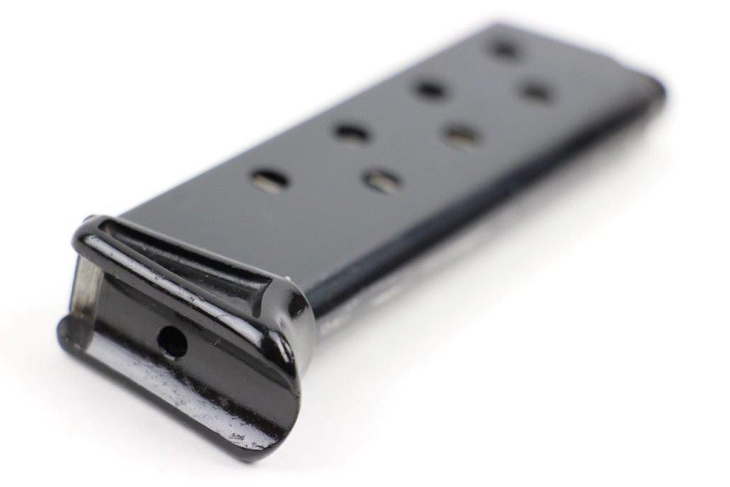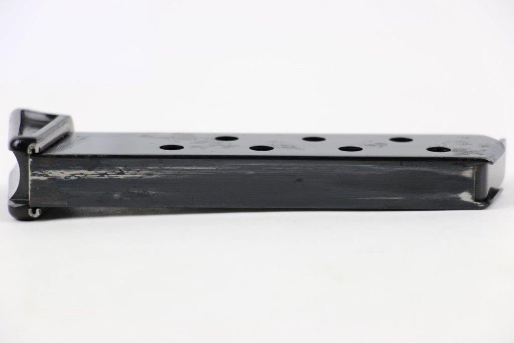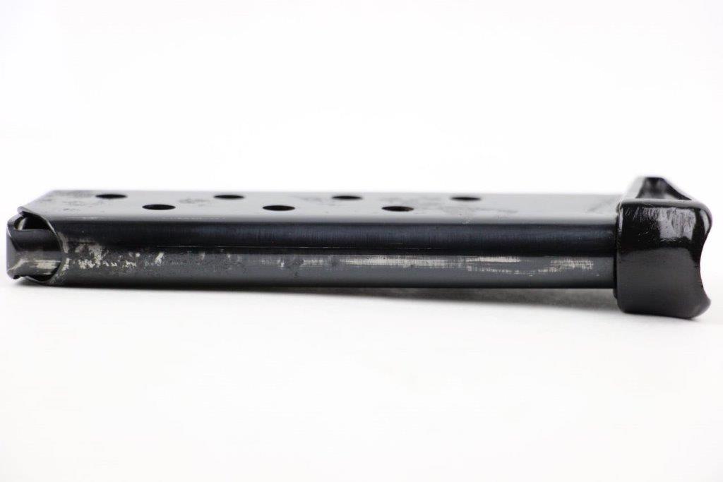 4/30/24 – This is a fairly rare, early variation Walther PP magazine with an early style thin-lipped black finger extension. The magazine tube has a high polish finish with some pin-pricking and small areas of pitting. Most of this is located on the left side, as shown in photos. This doesn’t affect functionality and the spring is strong with smooth action. The base has a few light surface scratches but no cracks or chips. Priced according to condition.