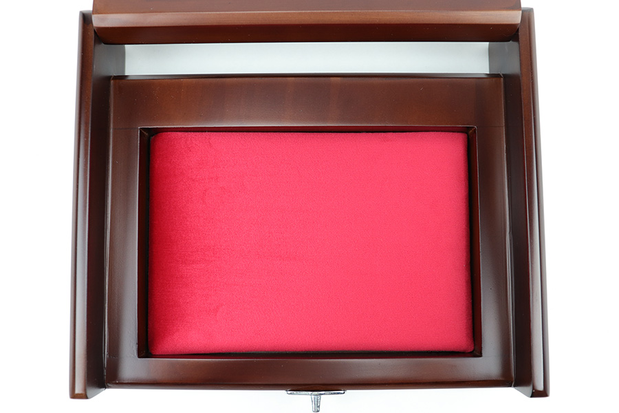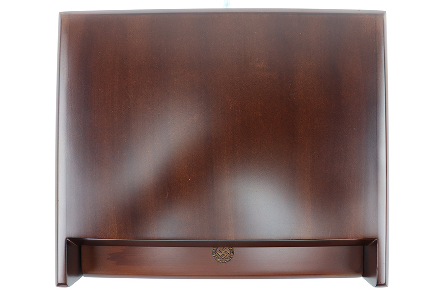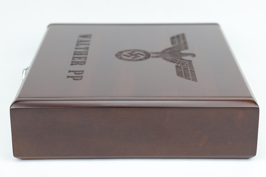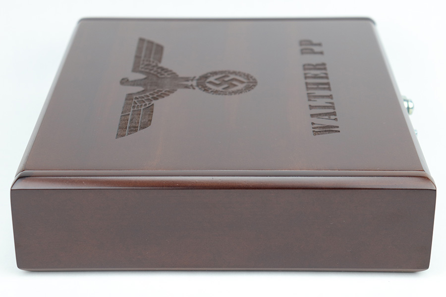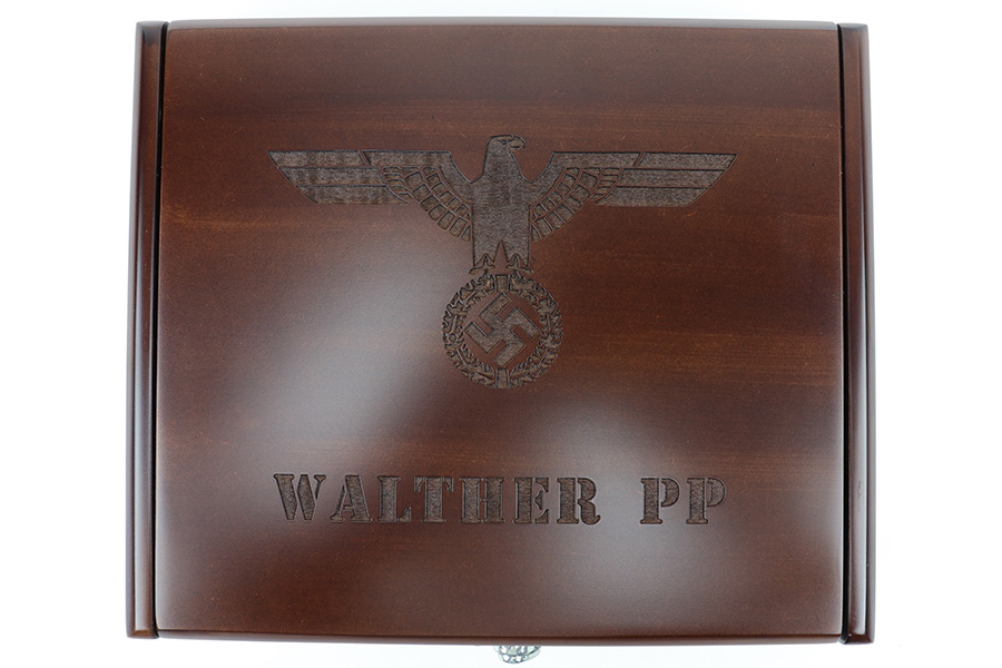 5/8/23 – This is a modern production display case for a Walther PP pistol. This is known as our “open display” case, because the lid opens and holds / displays a Walther PP pistol with the base acting as a stand. Excellent condition with a foam padded interior and wood exterior.