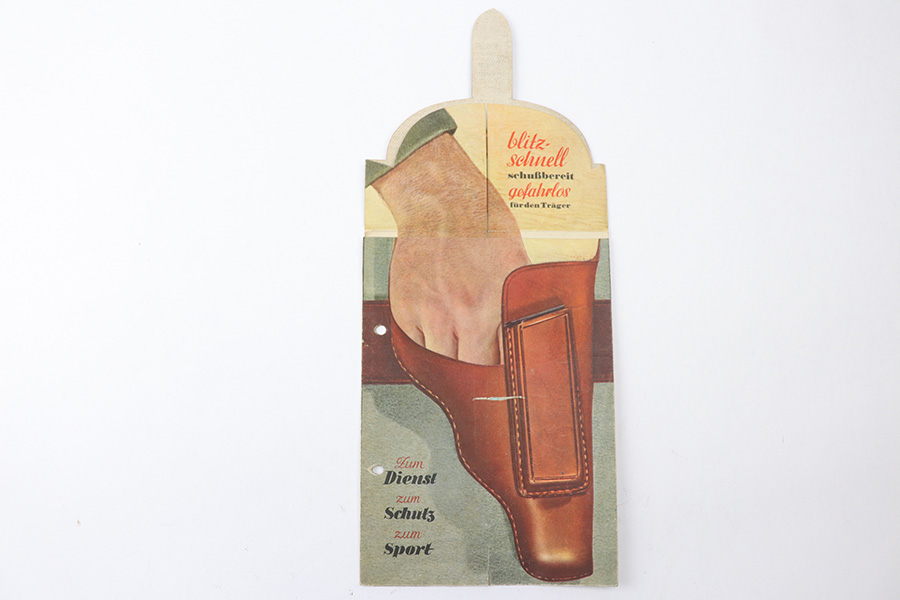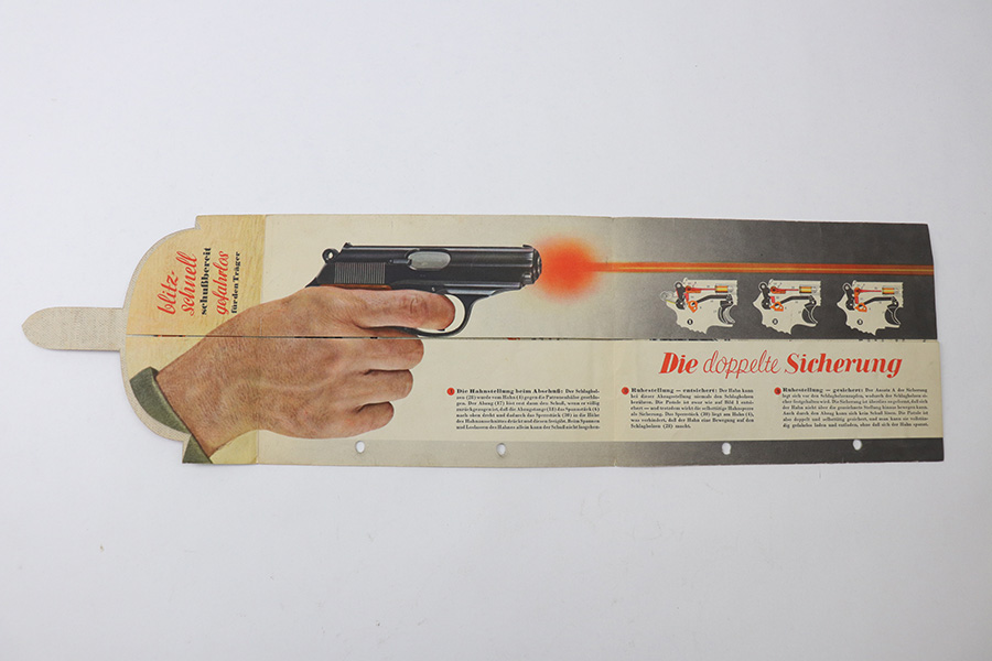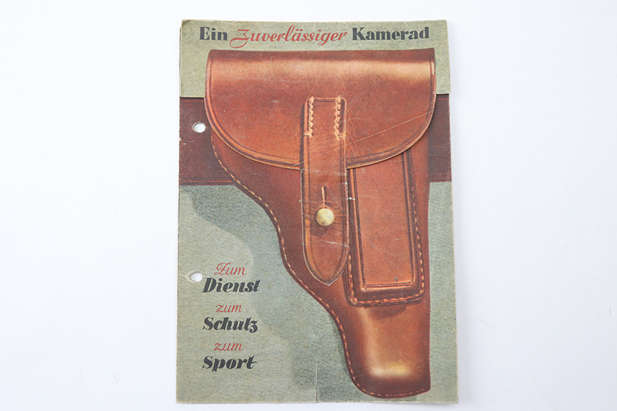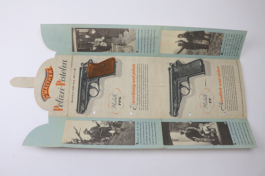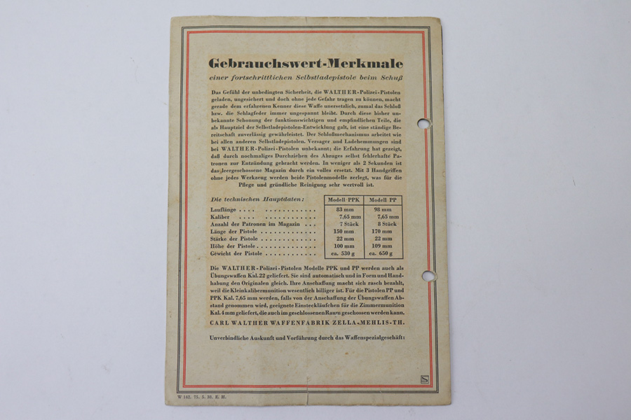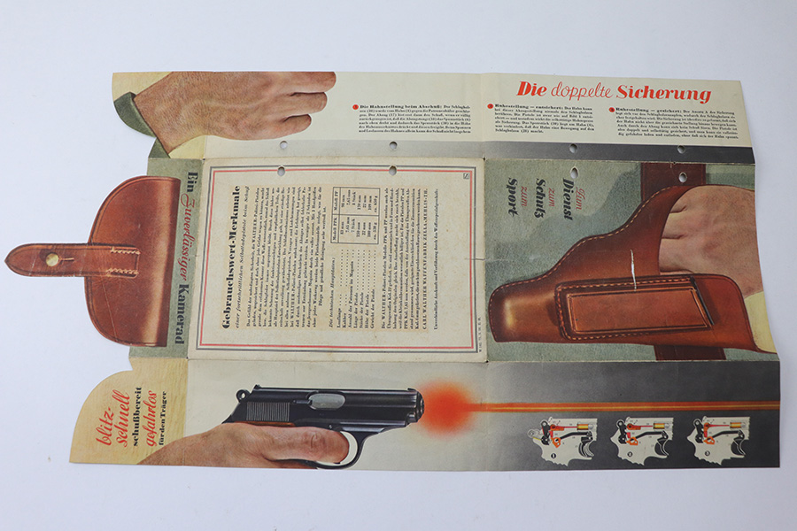 11/10/21 – This is an original Walther PP / PPK Salesman’s Brochure from WW2. The brochure folds open to show the Walther PPK and PP pistols. The manual has two hole punches near the left edge, probably from a previous collector attaching this to a display binder. The pages are clean but there are signs of aging throughout. A small rip is present at the base of the manual as well.