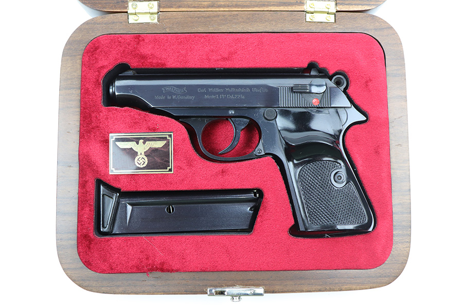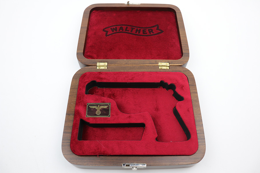 9/18/21 – This display case is a handmade wooden box with an identifying etched top and cushioned slotted interior perfect for storing and displaying a Walther PP pistol. There is space inside for the pistol and an extra magazine or a space to store the magazine separate from the pistol. Does not include any firearm that may appear in photos, shown only for fit of items.