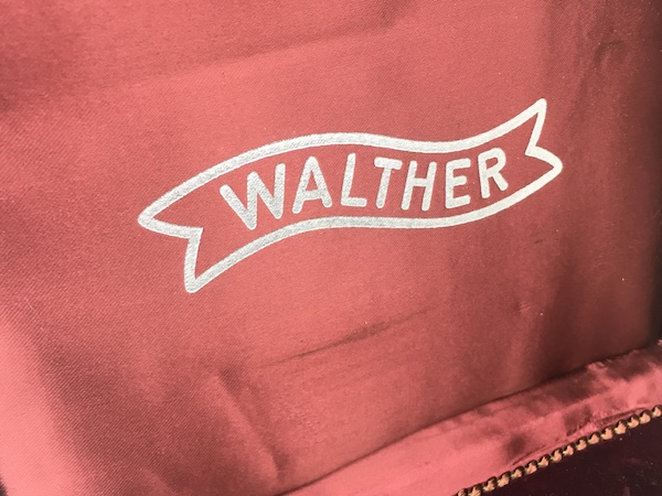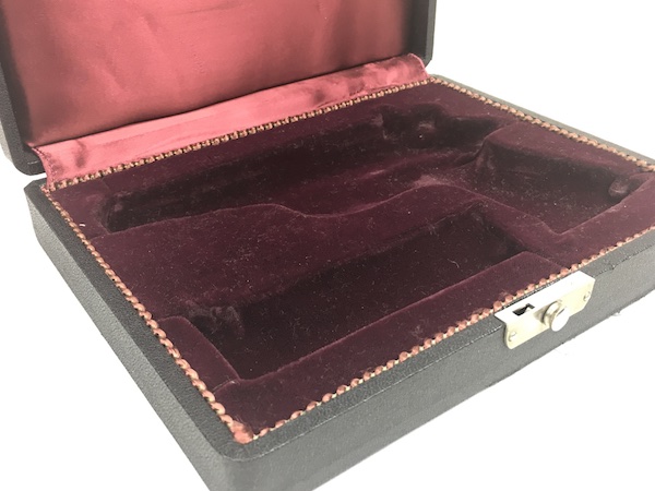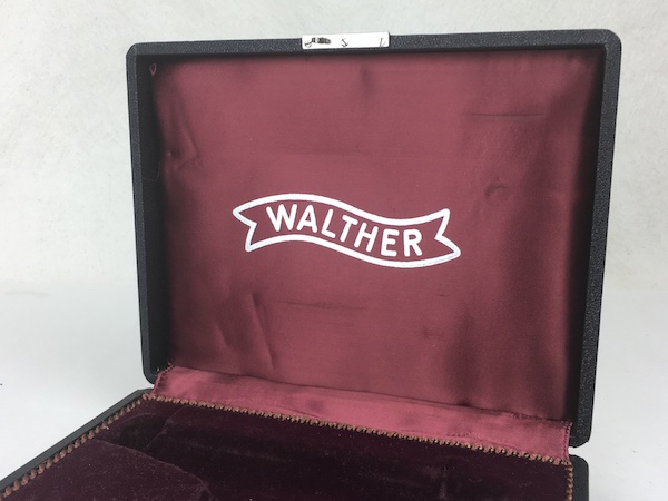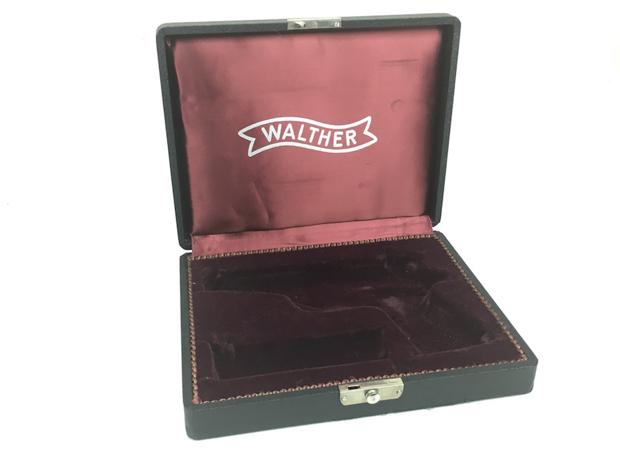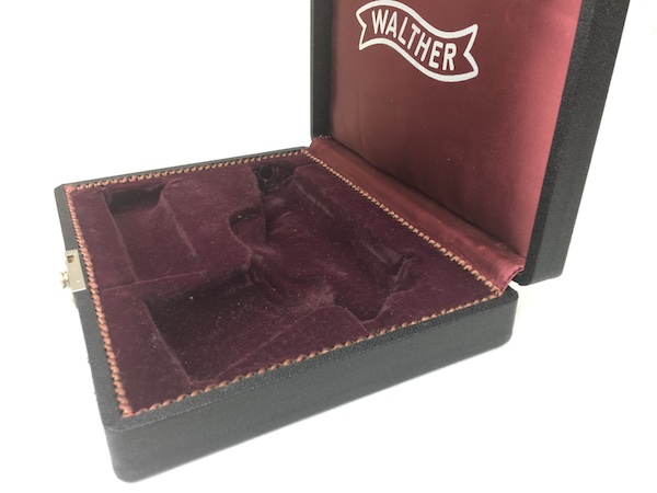 5/26/19 – This is an original Walther PP pistol presentation case from the 1960s. The case has excellent stretched black leather exterior with virtually no wear. Closure clasp functions perfectly. Hinges are tight and work smoothly. The interior is clean and lacks the typical “sand leak” which comes from the interior lid foam leaking through the red liner. The foam on the interior is firm and has retained it’s formed shape. The interior is clean with no issues. Guaranteed original and authentic.