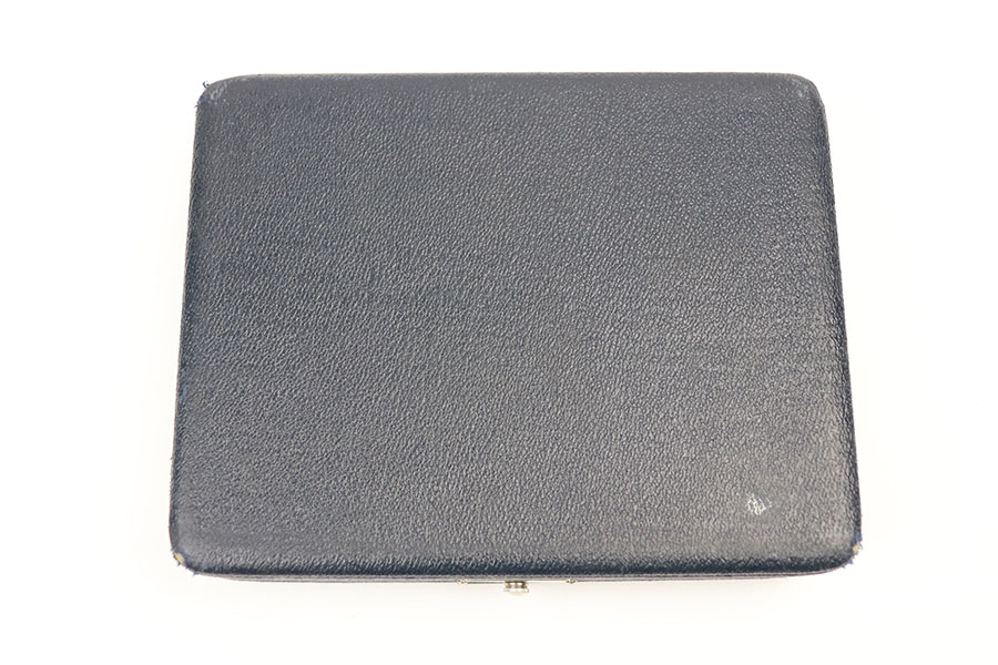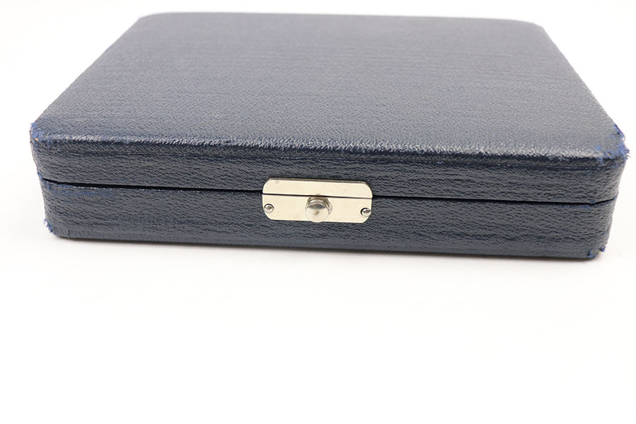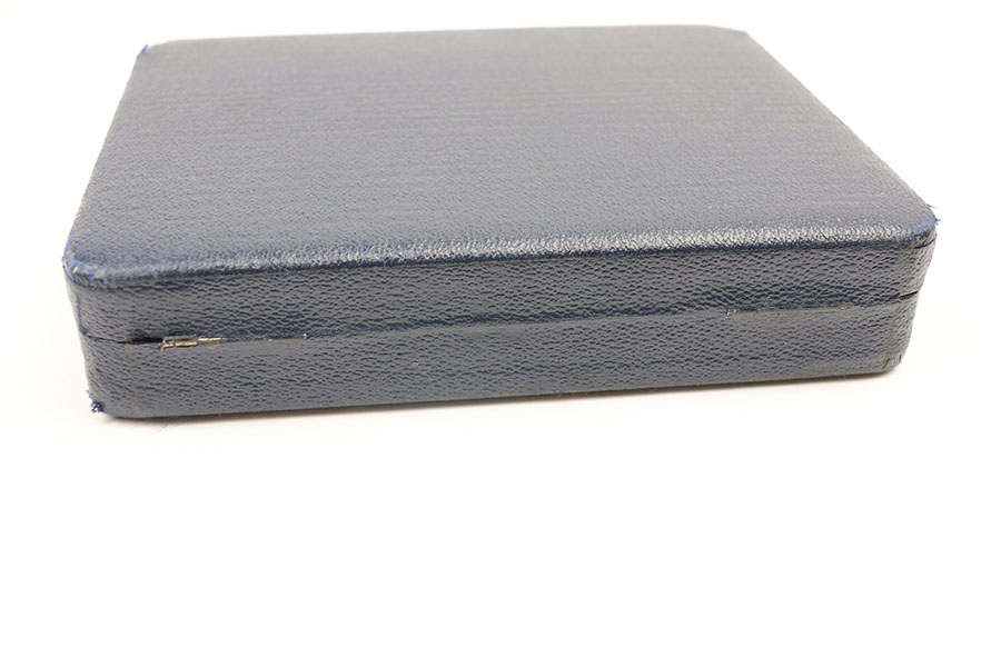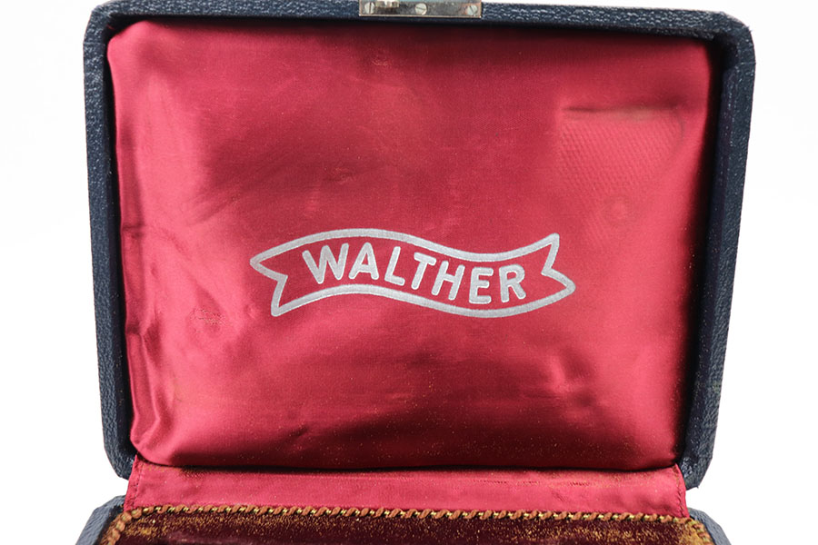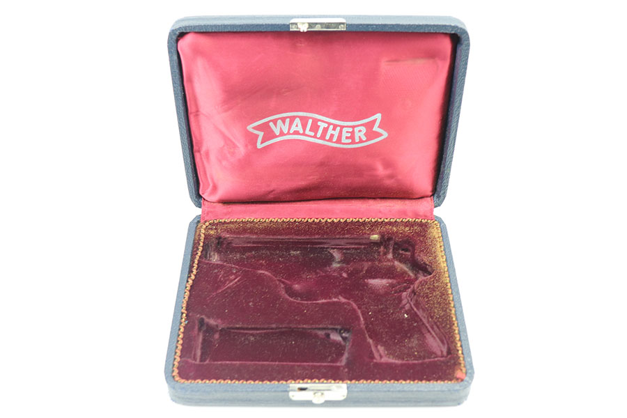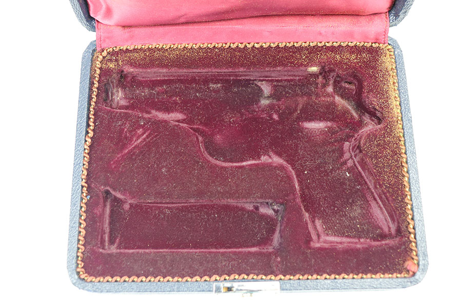 1/28/21 – This is an original Walther PP presentation case. the case has blue stretched leather on the exterior and red interior. The padding under the interior of the lid has “bled out” as it commonly does, but the lining is in tact as shown. There’s some mild wear along the edges of the exterior, and normal signs of use having previously held a pistol on the interior.