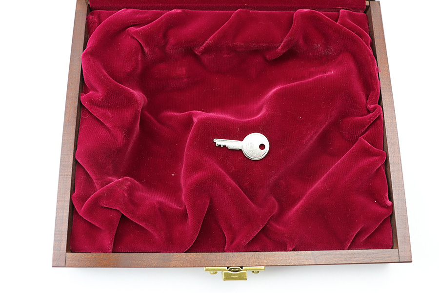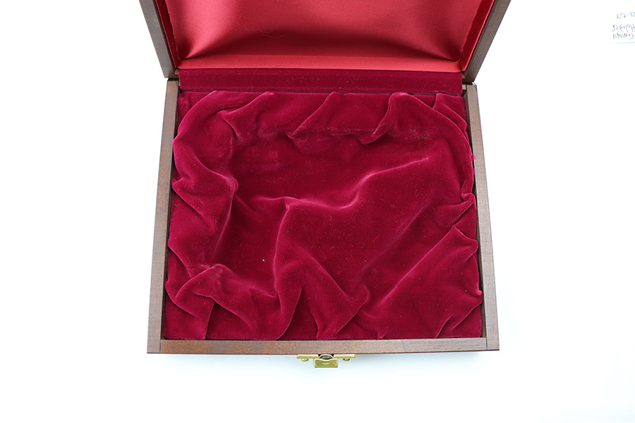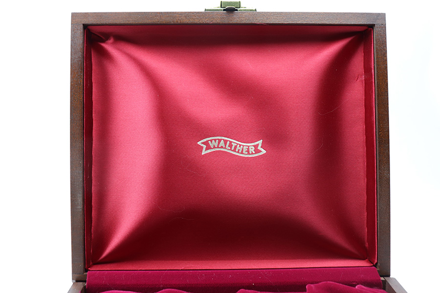5/4/21 – This is an original Walther PP presentation case. The case is constructed from Walnut with brass hinges and lock. The interior is in excellent condition with little to no wear. There’s some mild wear on the exterior and only one minor scuff. Functioning lock and key included within envelope in box.