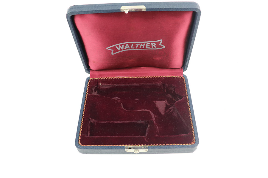 5/12/21 – These are original Walther PP presentation cases. These cases have blue stretched leather on the exteriors and red interiors. There’s some mild wear along the edges of the exteriors, and normal signs of use having previously held pistols. The condition of each case is comparable and each would be a great way to display, store, or gift a Walther PP.