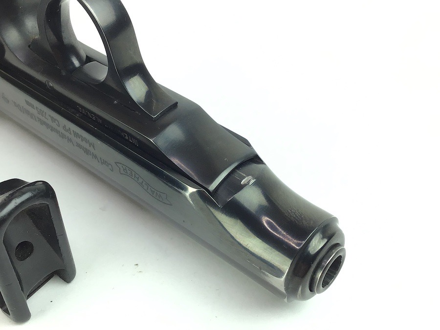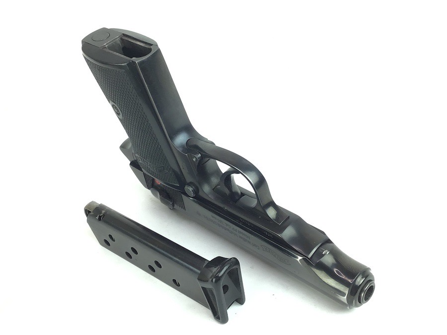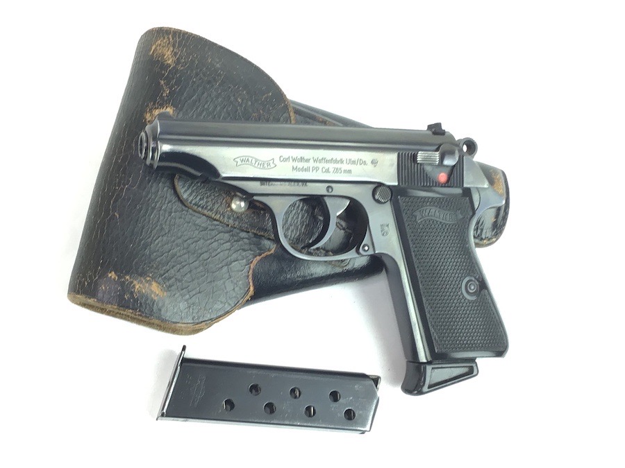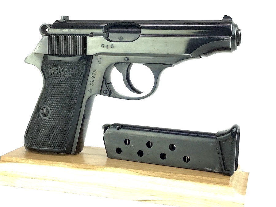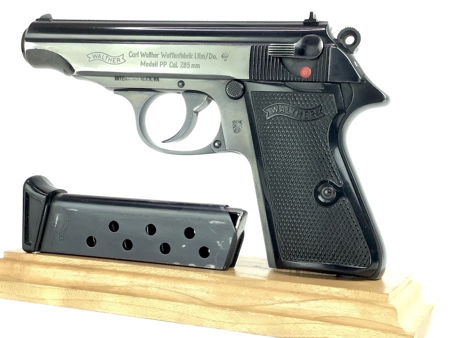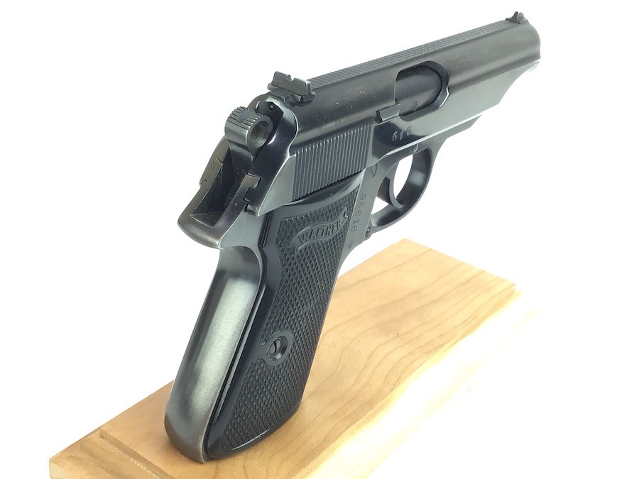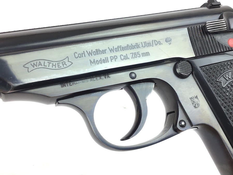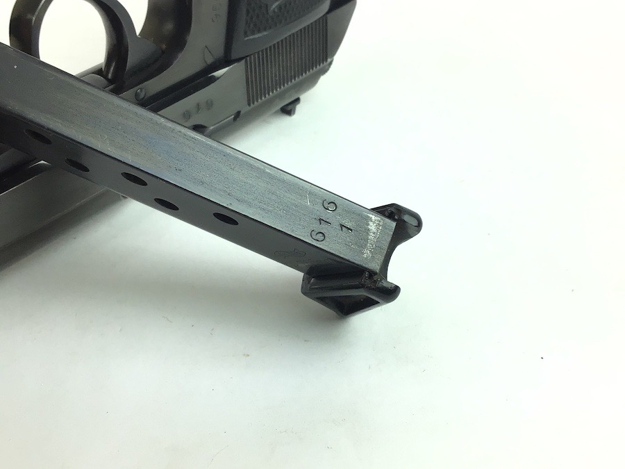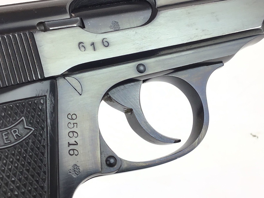 3/14/24 – Excellent condition, post war Walther PP. Beautiful finish showing the German Hesse Police Crest on the left side. Serial numbered on the right side frame and the slide, as well as the spine of the matching magazine. There is a small ding on the frame just in front of the trigger guard. The bore is very clean and rates a 9 or 10. Completely functional with smooth action. Import marked by Interarms on the left side of frame. Includes a spare Manurhin magazine and unmarked holster. Through our research, we have determined this was made early post war, as the Eagle N nitro proof is indicative of the mid to late 50’s. We contacted the German Walther factory and they stated it was very early in the Ulm factory history and only registered in the manual archives, and could not provide an exact date.