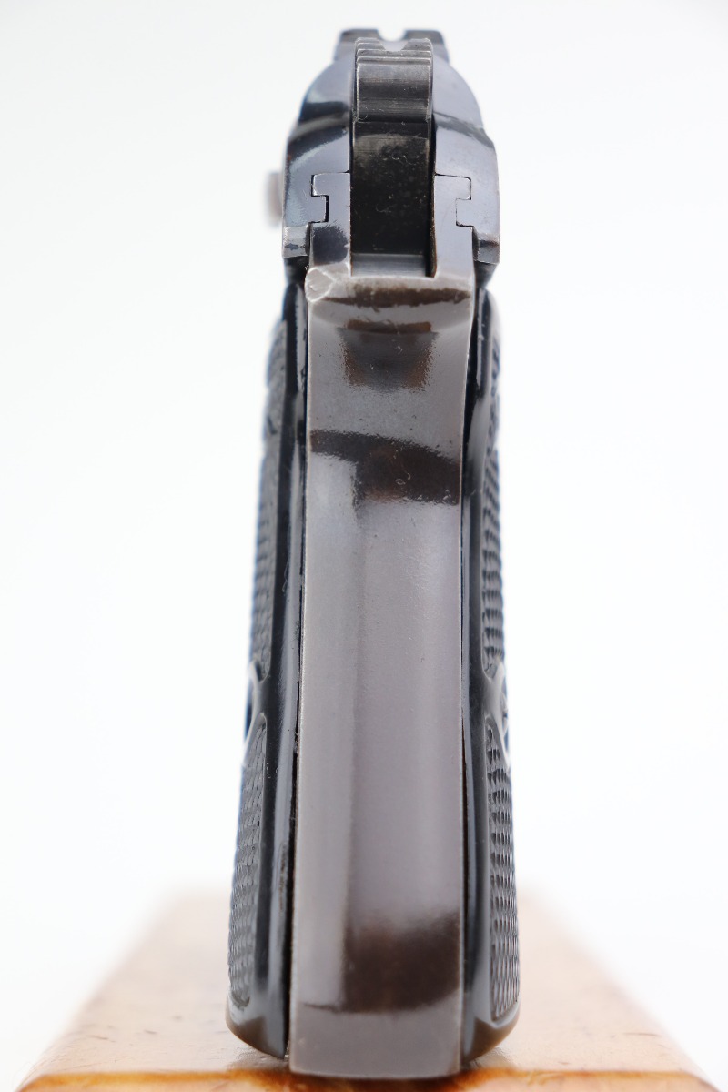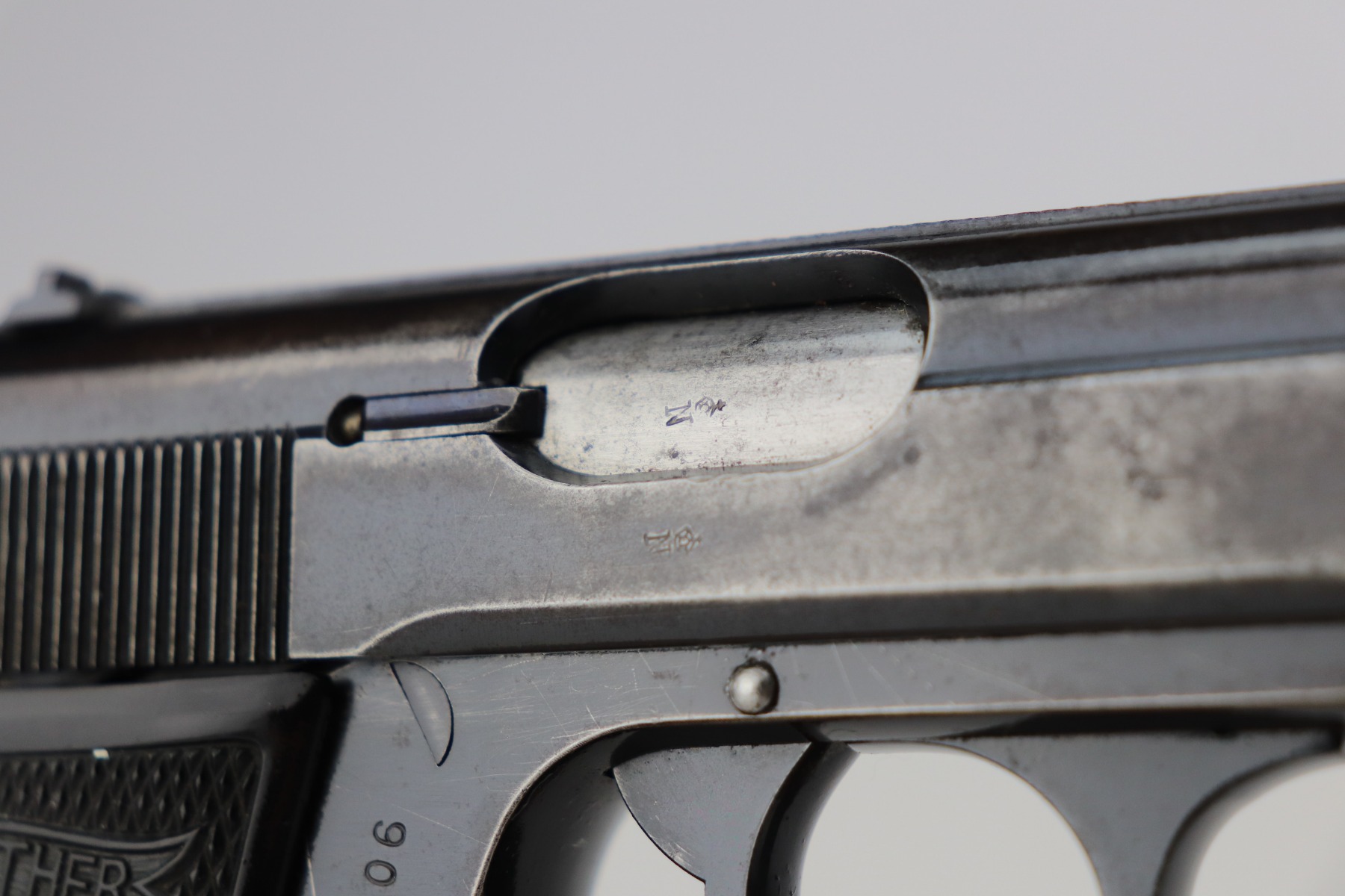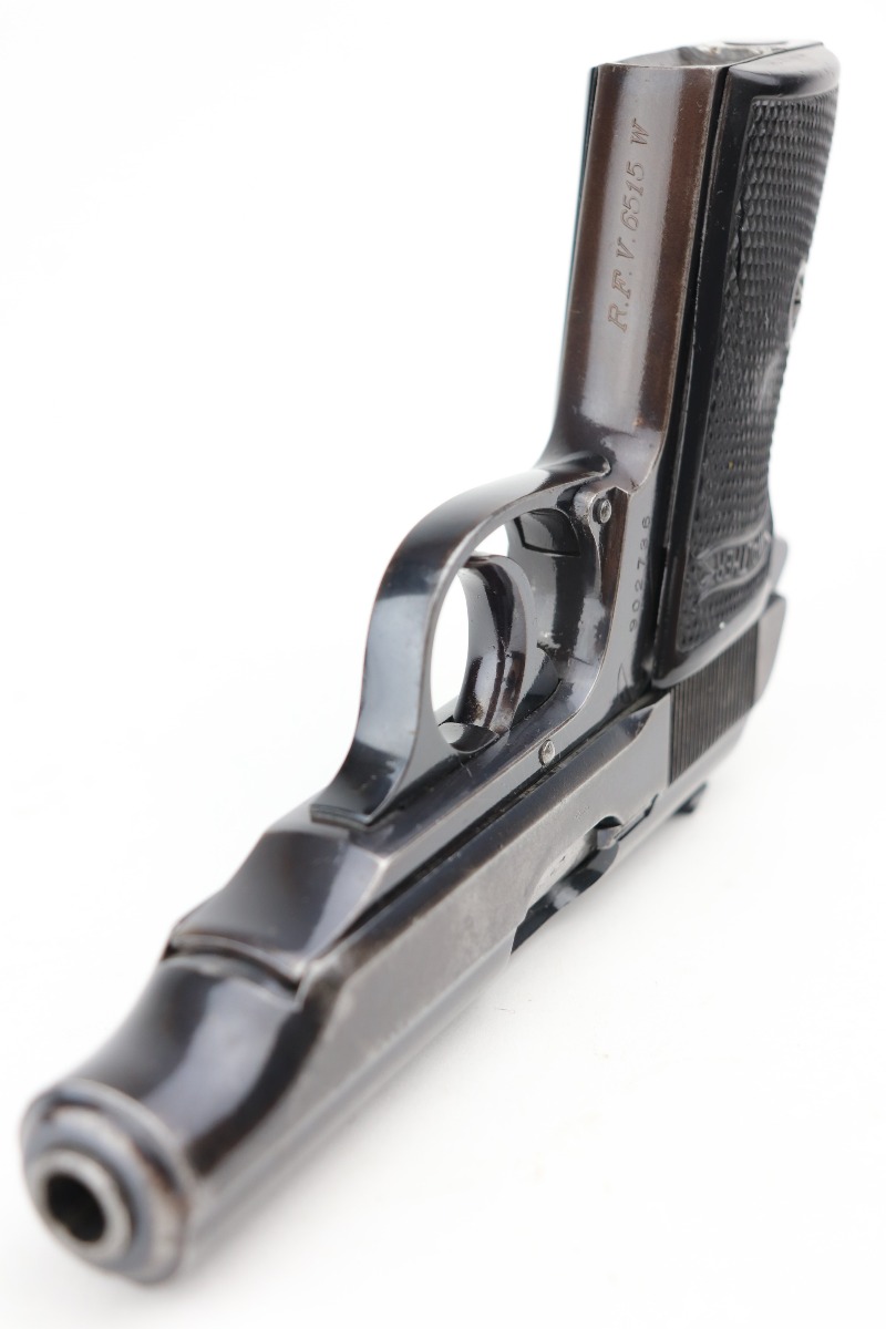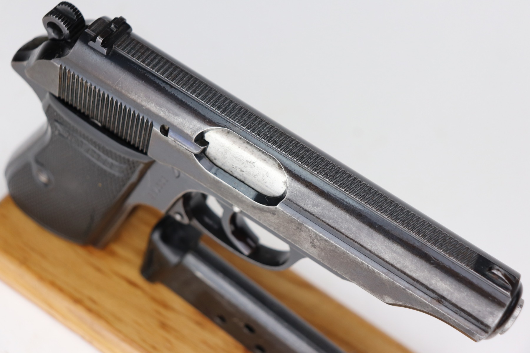 3/8/21 – This is a very nice example of a Walther PP manufactured in 1936. It is “RFV” marked on the front strap, indicating it was issued to the Reichs Finance Bureau. It is all matching and has the proper “Crown N” proofs. It has retained about 85% of its original bluing. There is brown patina on both straps. Spotty wear around the muzzle and on most of the slide. Spotty oxidation on the slide throughout. There are areas of scratching on the left side of the slide and right side of the frame. It comes with nice grips – There is a crack in the right panel. Comes with a finger extension magazine – the tube is period-correct, the bottom is post-war. The bore is near-mint.