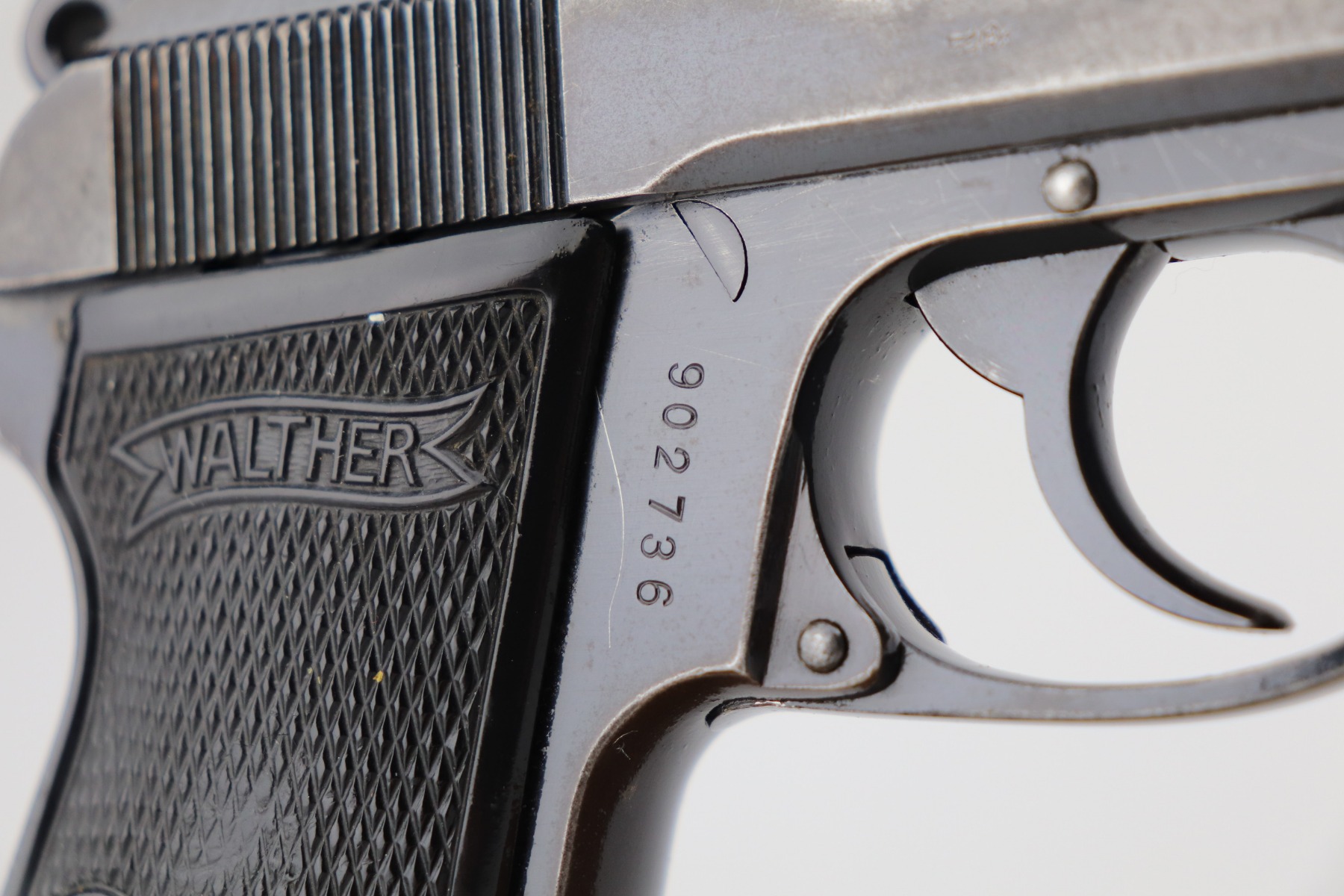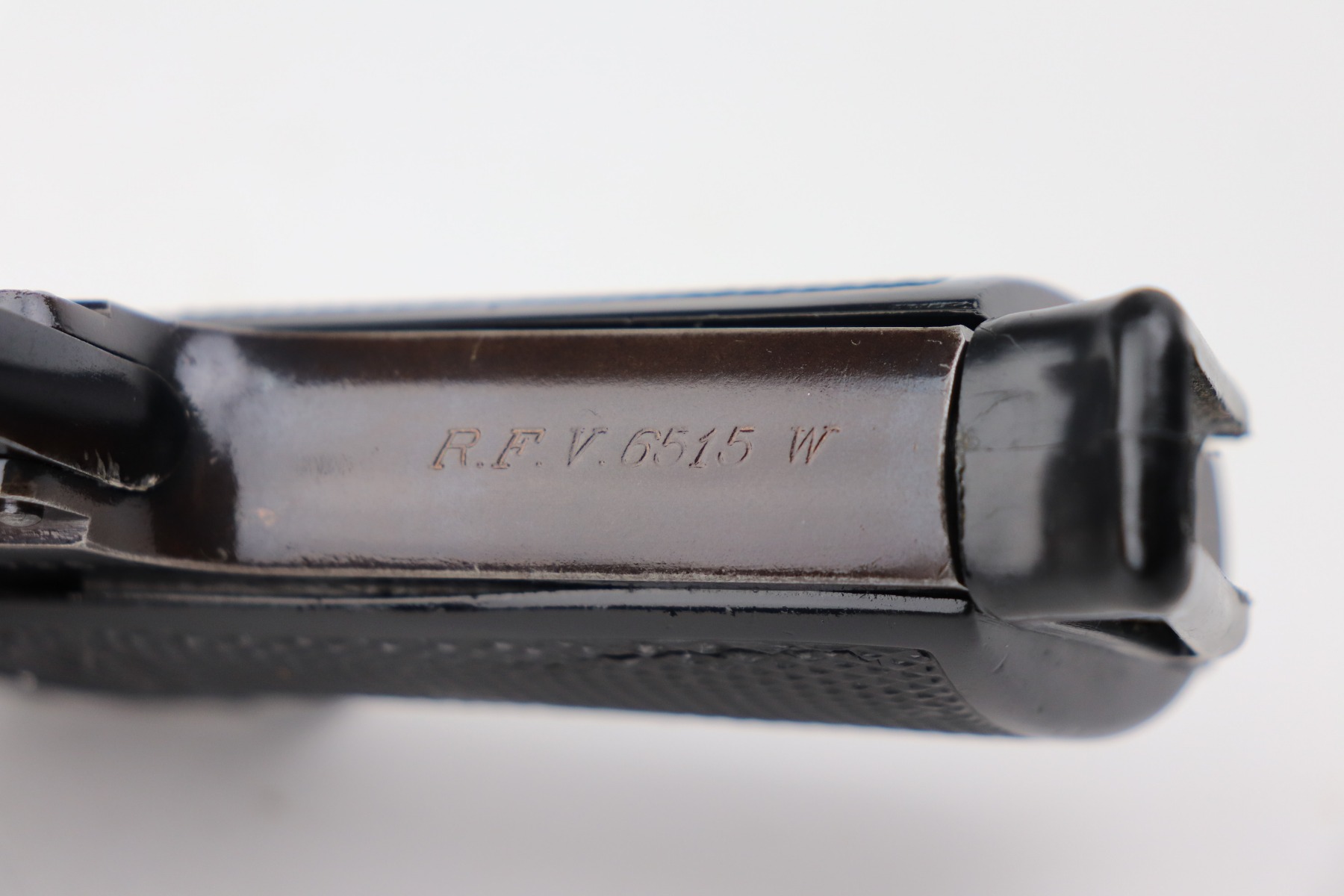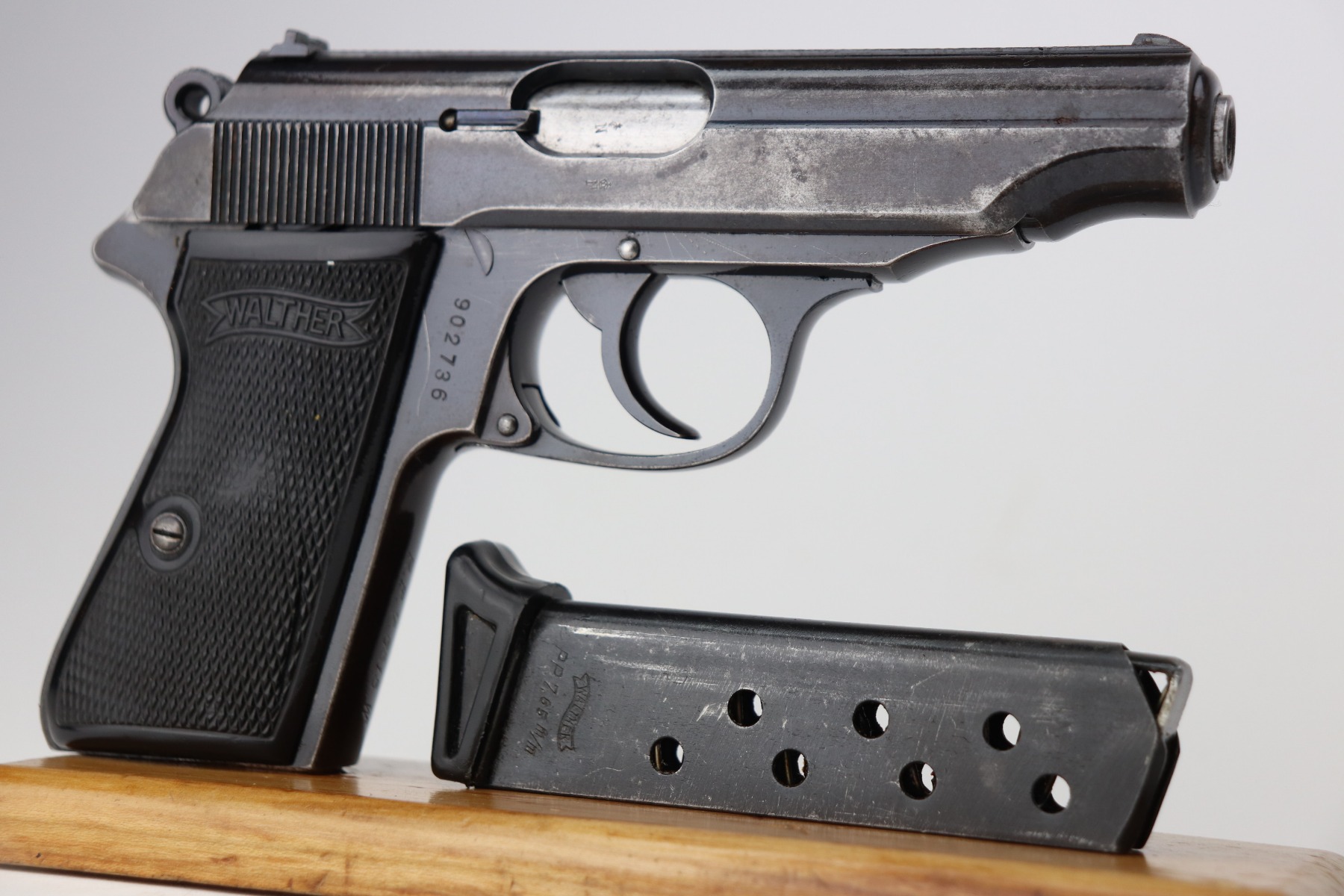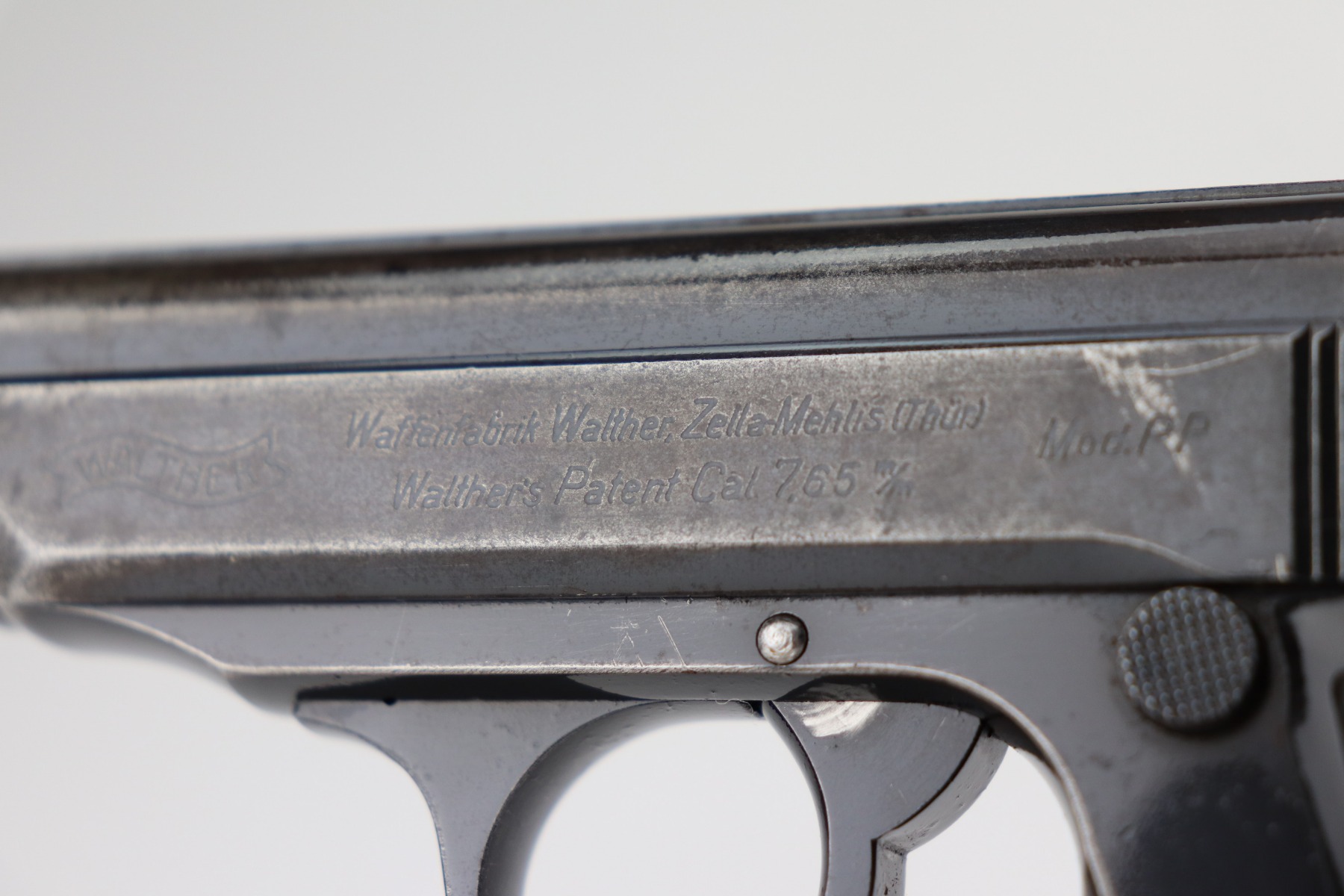 3/8/21 – This is a very nice example of a Walther PP manufactured in 1936. It is “RFV” marked on the front strap, indicating it was issued to the Reichs Finance Bureau. It is all matching and has the proper “Crown N” proofs. It has retained about 85% of its original bluing. There is brown patina on both straps. Spotty wear around the muzzle and on most of the slide. Spotty oxidation on the slide throughout. There are areas of scratching on the left side of the slide and right side of the frame. It comes with nice grips – There is a crack in the right panel. Comes with a finger extension magazine – the tube is period-correct, the bottom is post-war. The bore is near-mint.